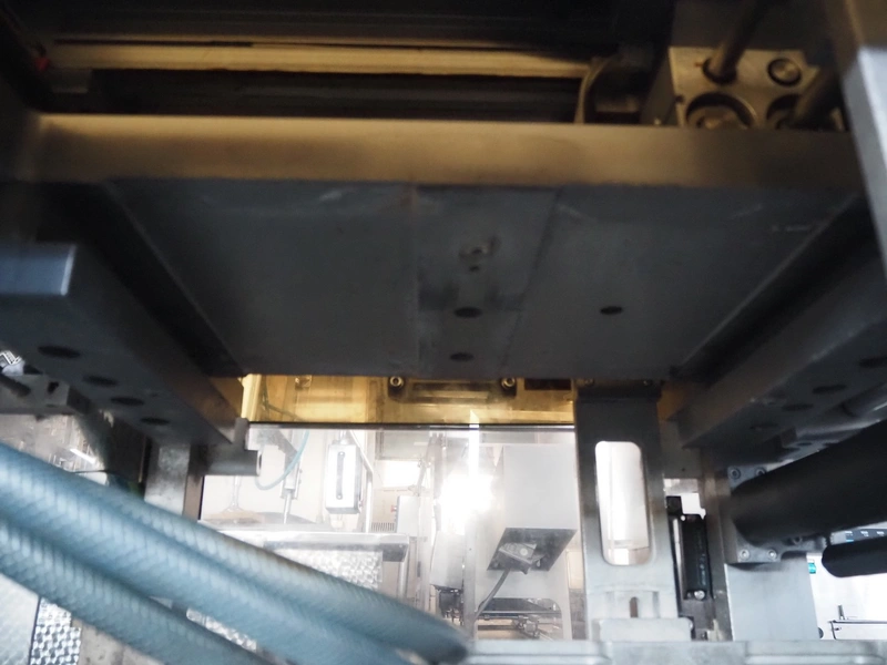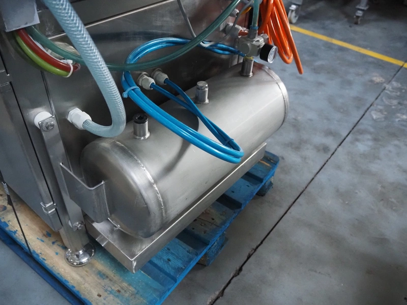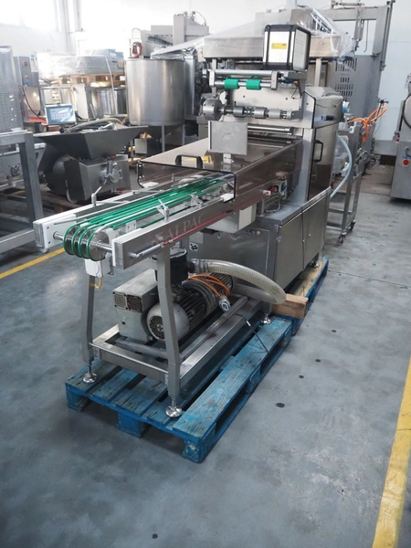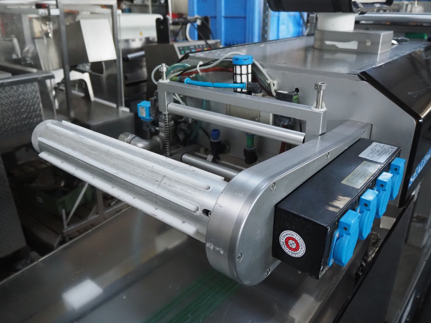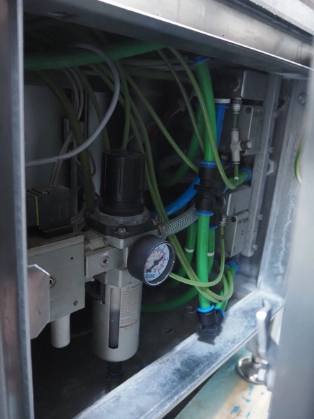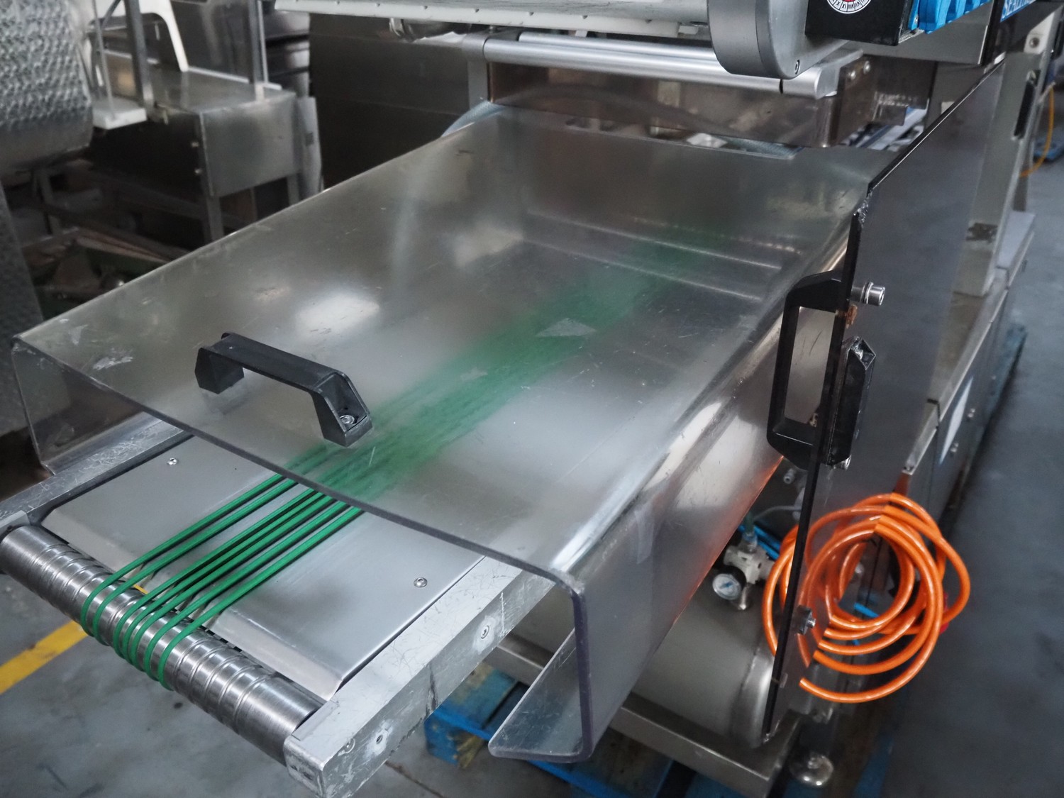 Sealpac traysealer, type: SEALPAC 350, serial number: TVG 02 1187 01, year of construction: 2005, 400/230 V, 3 Ph, 50 Hz, 3 kW, weight: 450 kg, plastic wire belt, belt width: 120 mm and 230 mm, Busch vacuum pump, total dimensions: 3250 mm x 750 mm x 1750 mm. Including trolley with dye set, dye: (2x) 160 mm x 105 mm, total dimensions trolley: 700 mm x 700 mm x 1430 mm.
