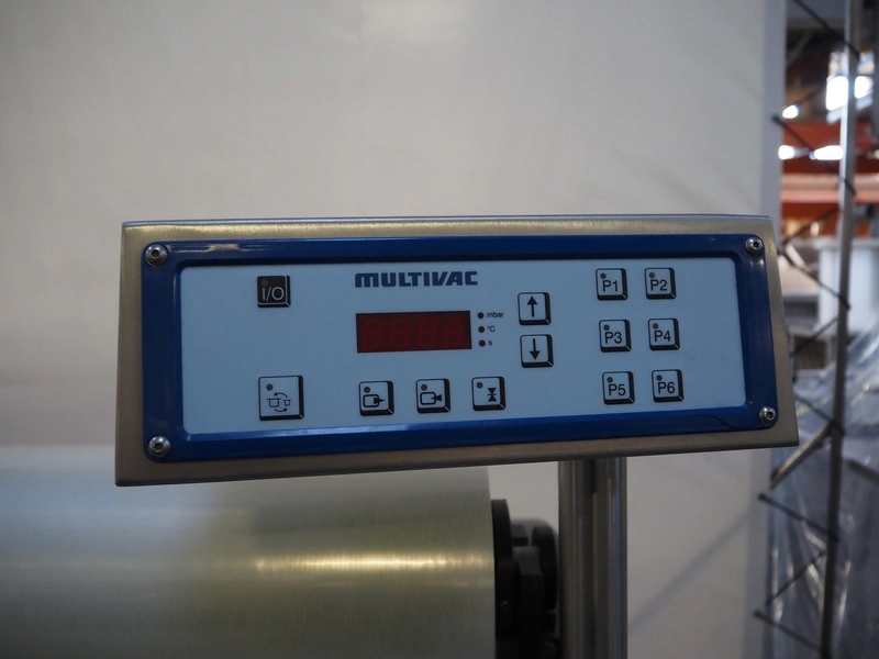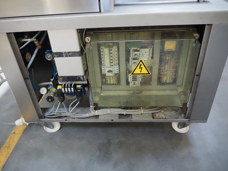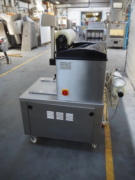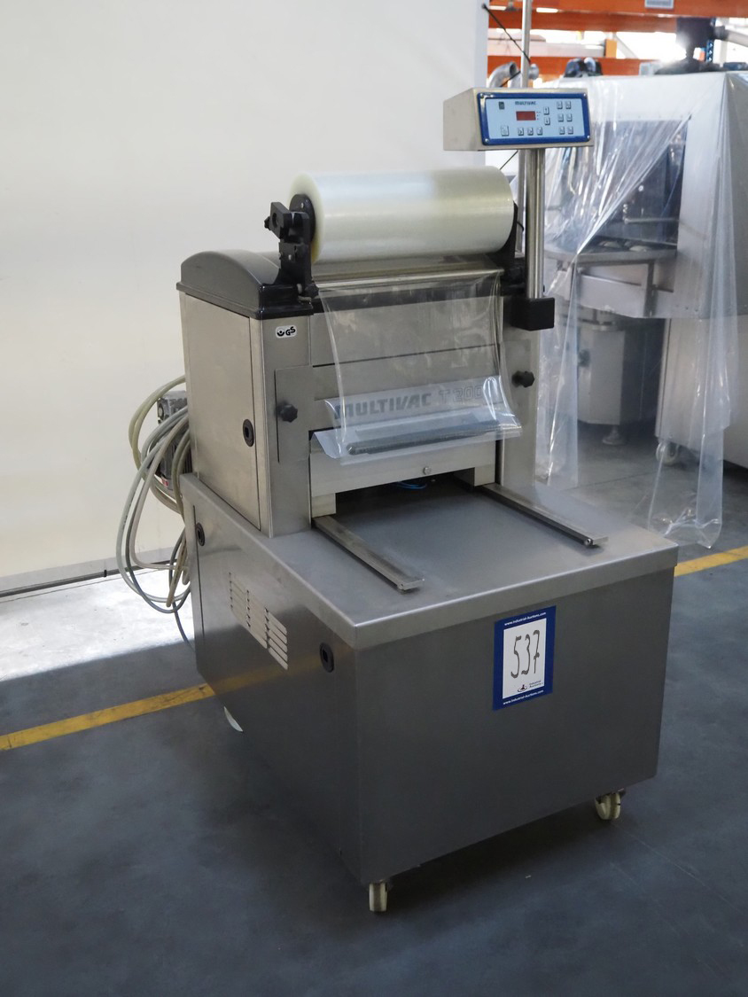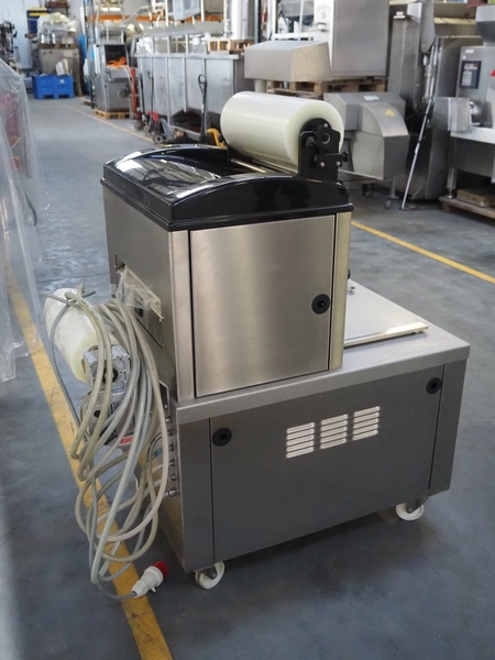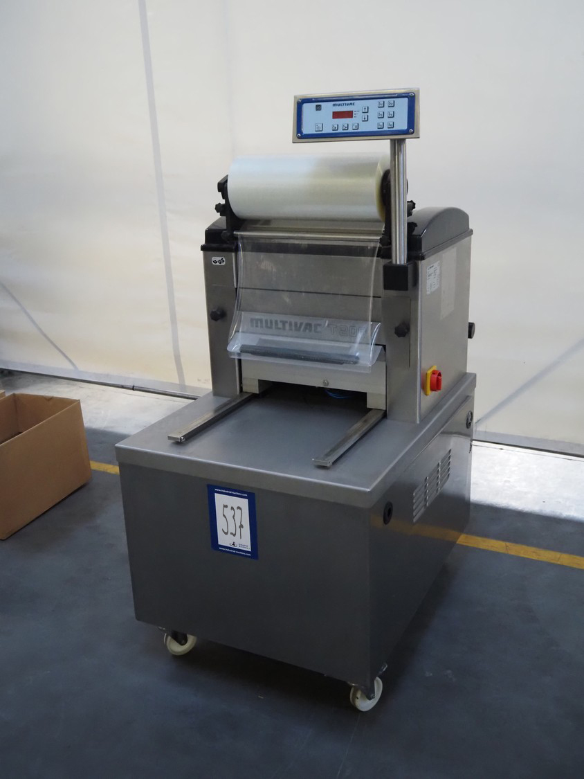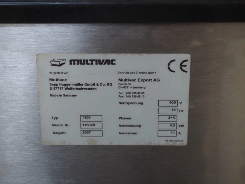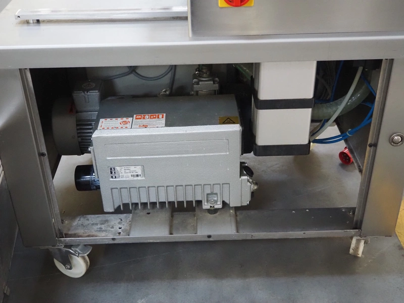 Multivac mobile traysealer, type: T200, serial number: 116029, year of construction: 2007, 400 V, 3 Ph, 50 Hz, 11 A, 4.5 kW, dye: 175 mm x 125 mm, film width: 450 mm, Busch vacuum pump, type: RA 0063 E 5Z1, number: 060105047, capacity: 63 m³ per hour, total dimensions: 1250 mm x 760 mm x 1620 mm. Including box with extra top dye and with parts.