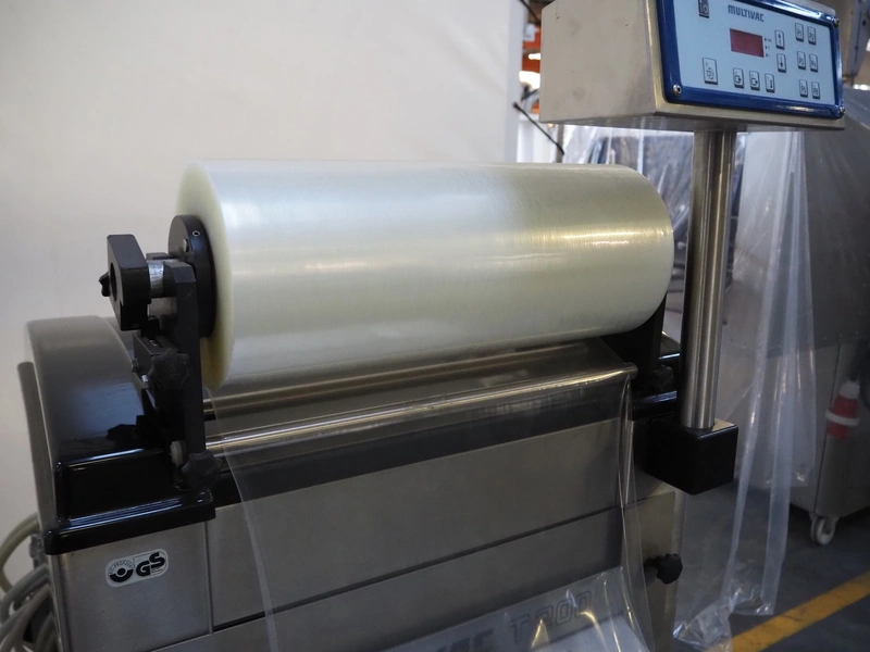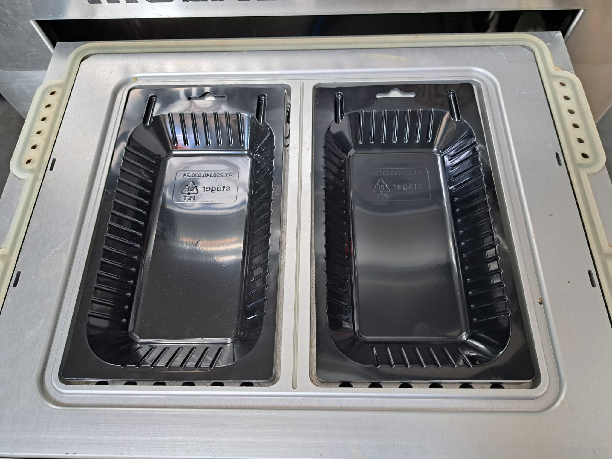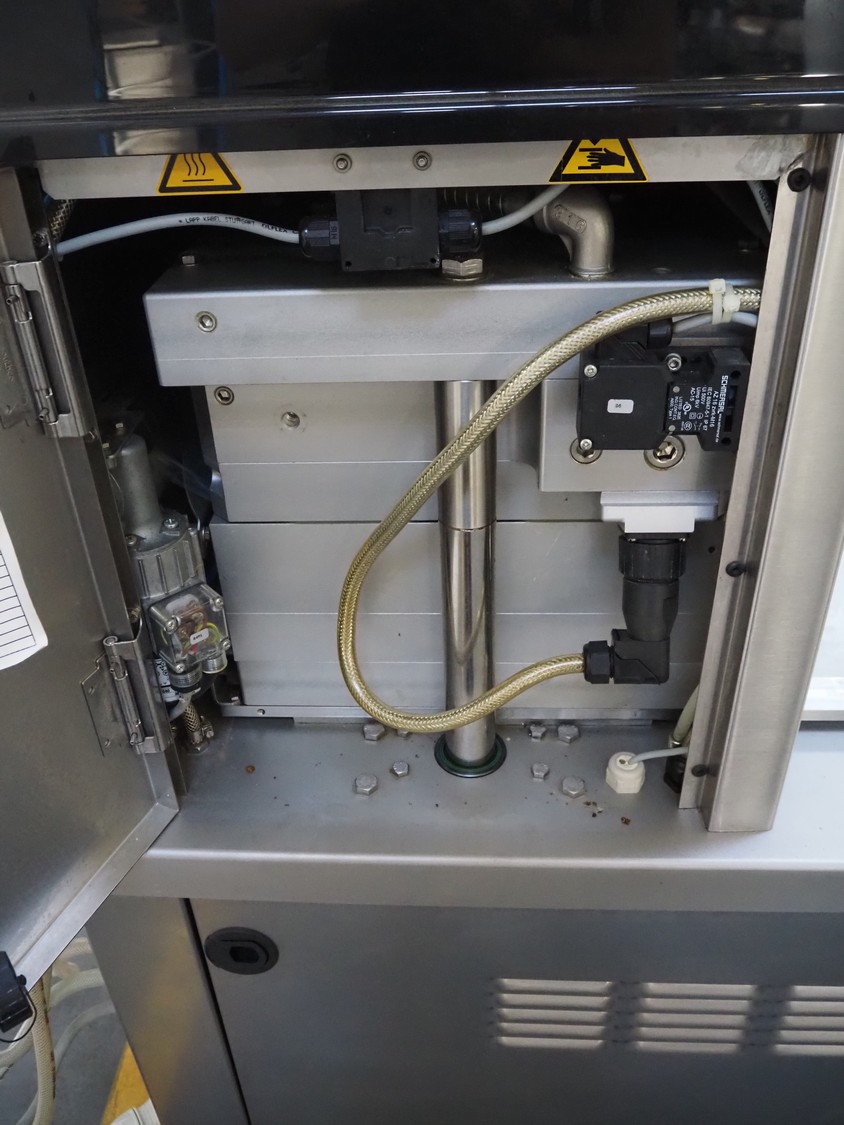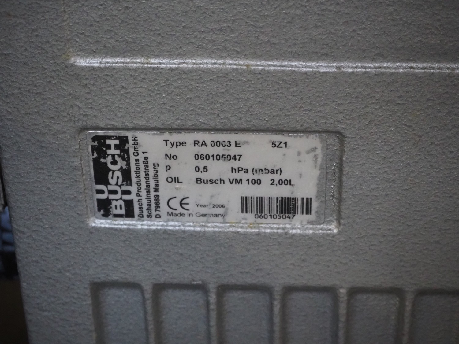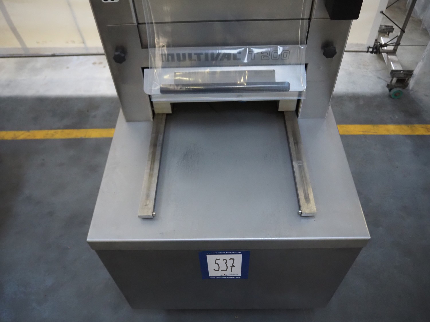 Multivac mobile traysealer, type: T200, serial number: 116029, year of construction: 2007, 400 V, 3 Ph, 50 Hz, 11 A, 4.5 kW, dye: 175 mm x 125 mm, film width: 450 mm, Busch vacuum pump, type: RA 0063 E 5Z1, number: 060105047, capacity: 63 m³ per hour, total dimensions: 1250 mm x 760 mm x 1620 mm. Including box with extra top dye and with parts.