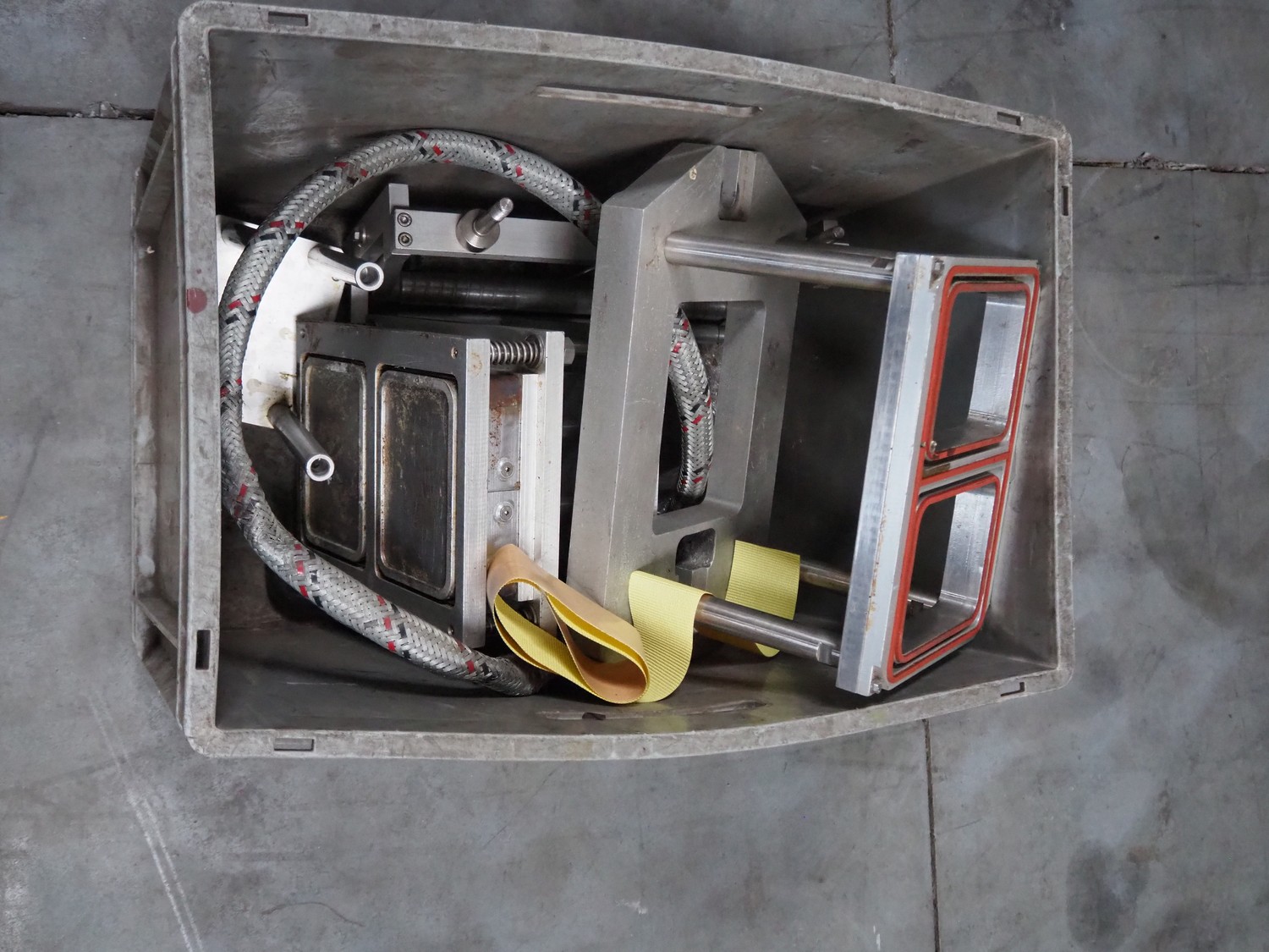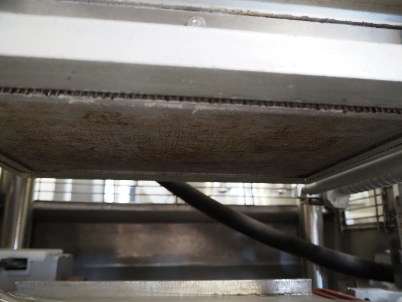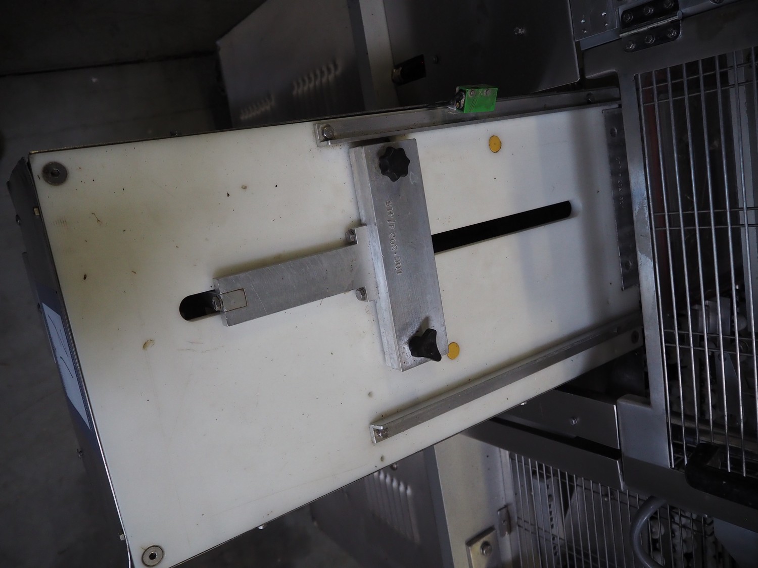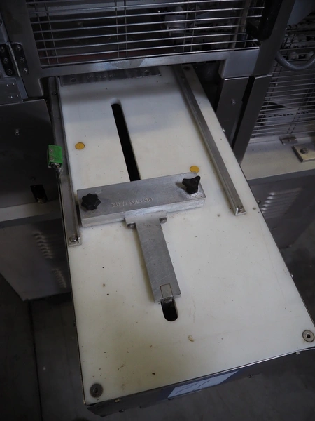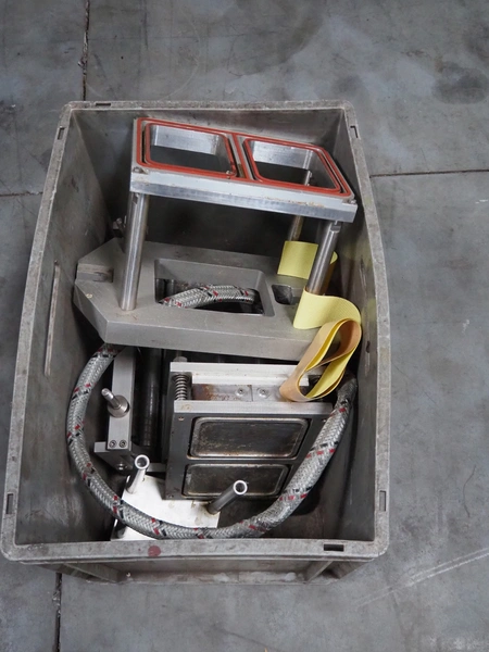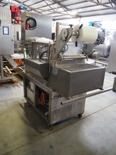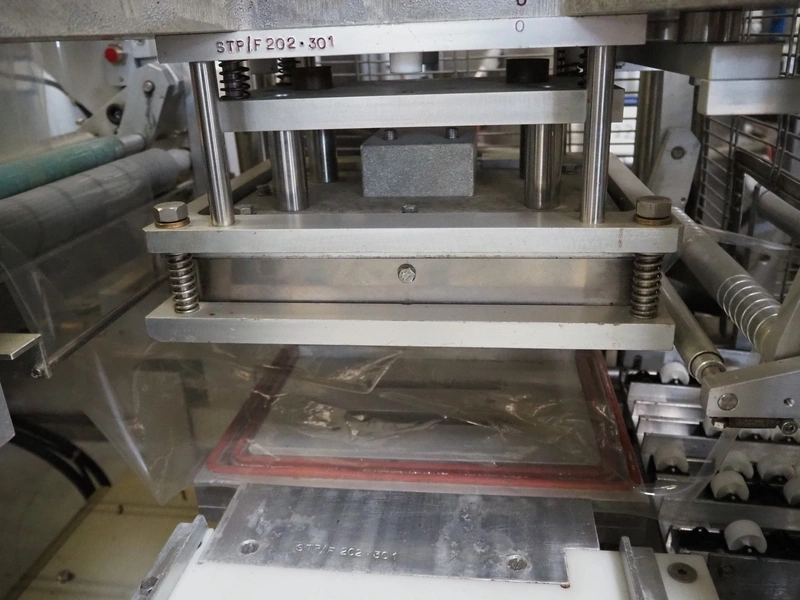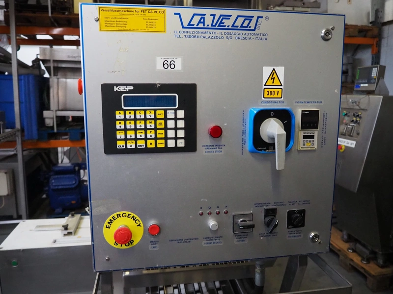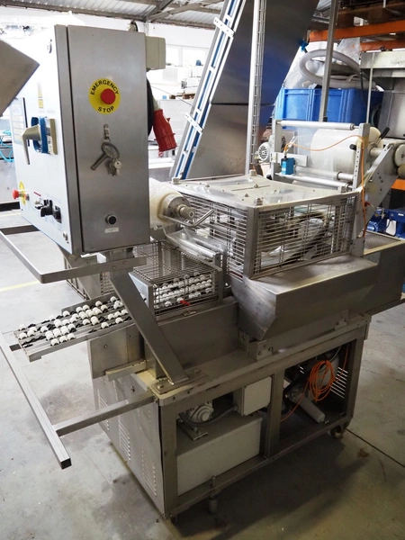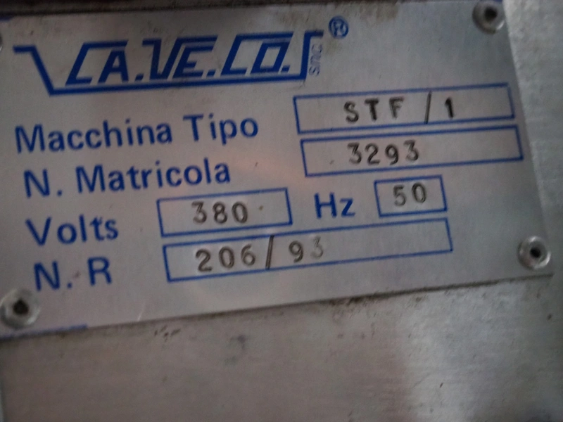 Ca.ve.co mobile traysealer, type: STF/1, machine number: 3293, 380 V, 50 Hz, dimensions dye: 315 mm x 215 mm, film width: 260 mm, total dimensions: 1950 mm x 1330 mm x 1830 mm. Including extra dye set, dimensions dye: (2x) 160 mm x 120 mm.