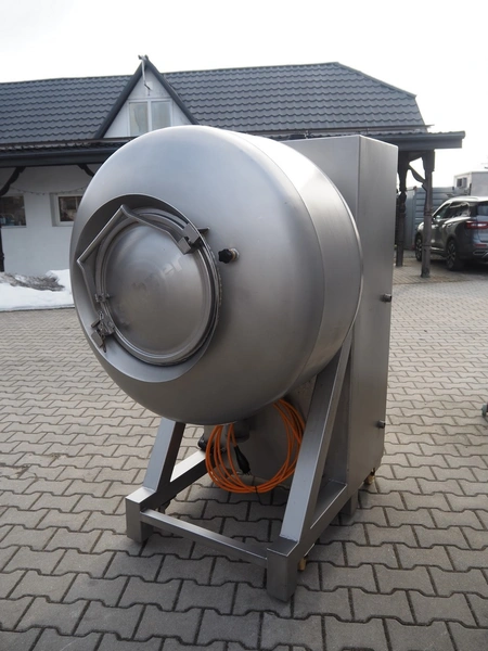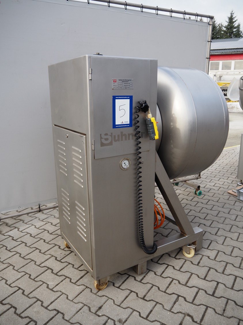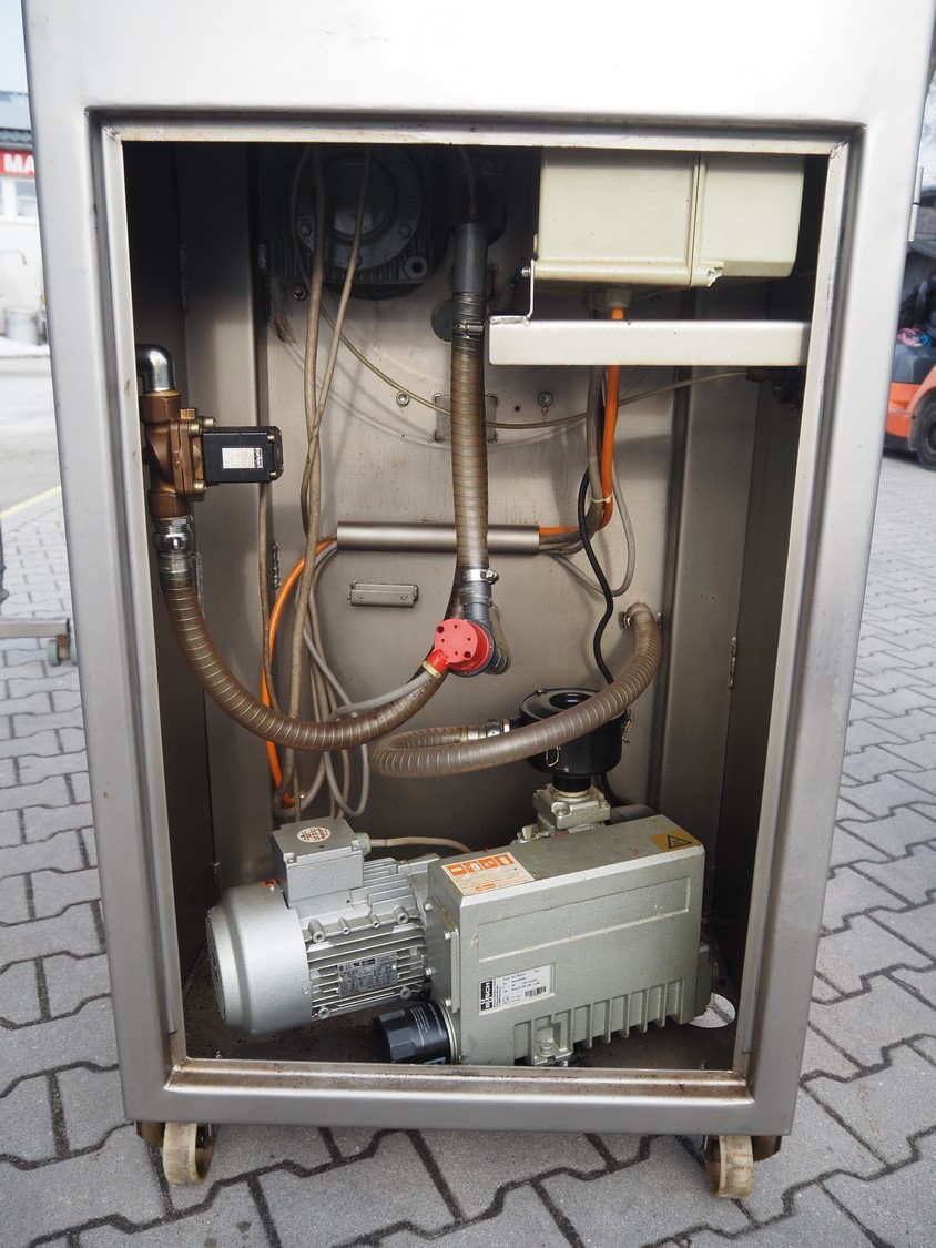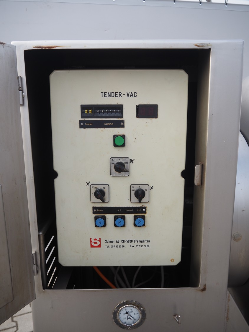 Suhner AG mobile vacuum tumbler, type: VT 350 E, machine number: 92350350, 380 V, 50 Hz, 8 A, 1.2 kW, Busch vacuum pump, type: RC 0025 E, number: 060109395, dimensions: 1350 mm x 900 mm x 1700 mm.