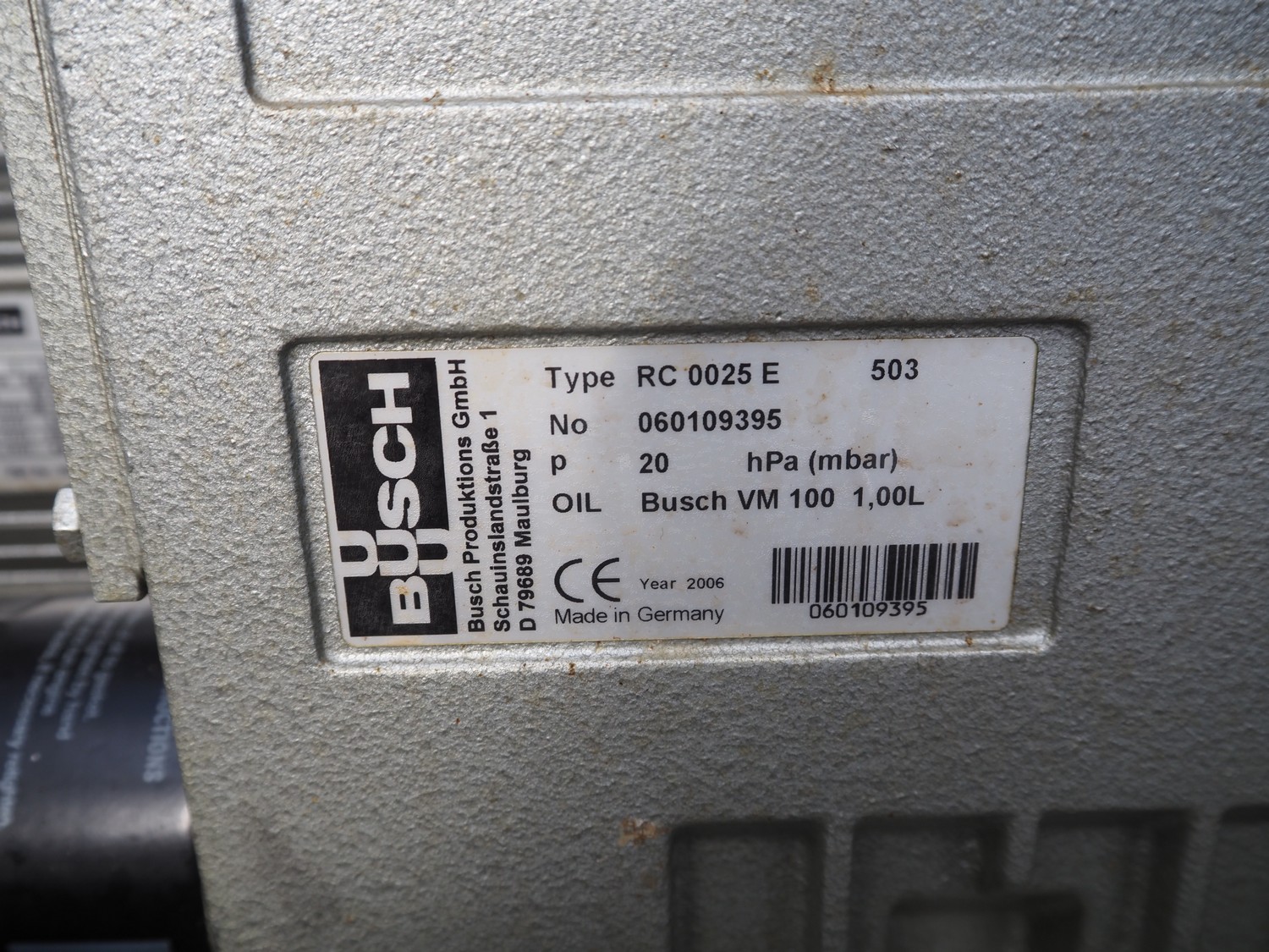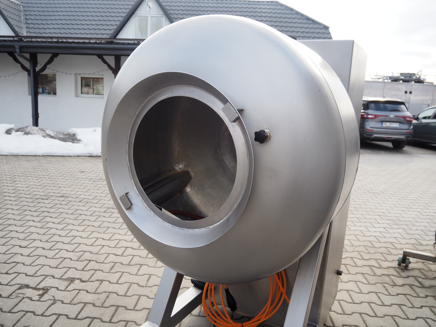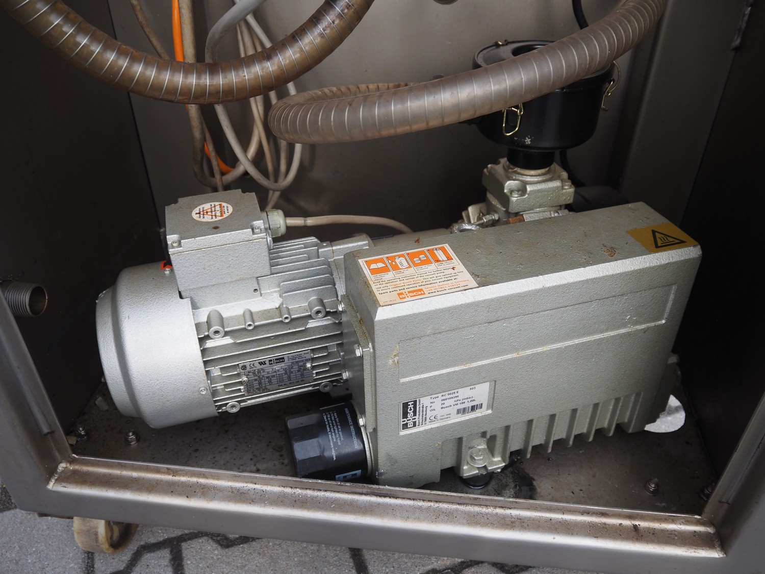 Suhner AG mobile vacuum tumbler, type: VT 350 E, machine number: 92350350, 380 V, 50 Hz, 8 A, 1.2 kW, Busch vacuum pump, type: RC 0025 E, number: 060109395, dimensions: 1350 mm x 900 mm x 1700 mm.