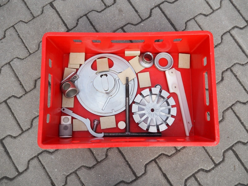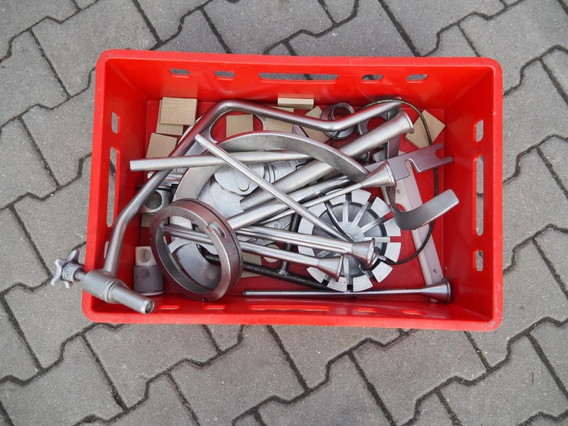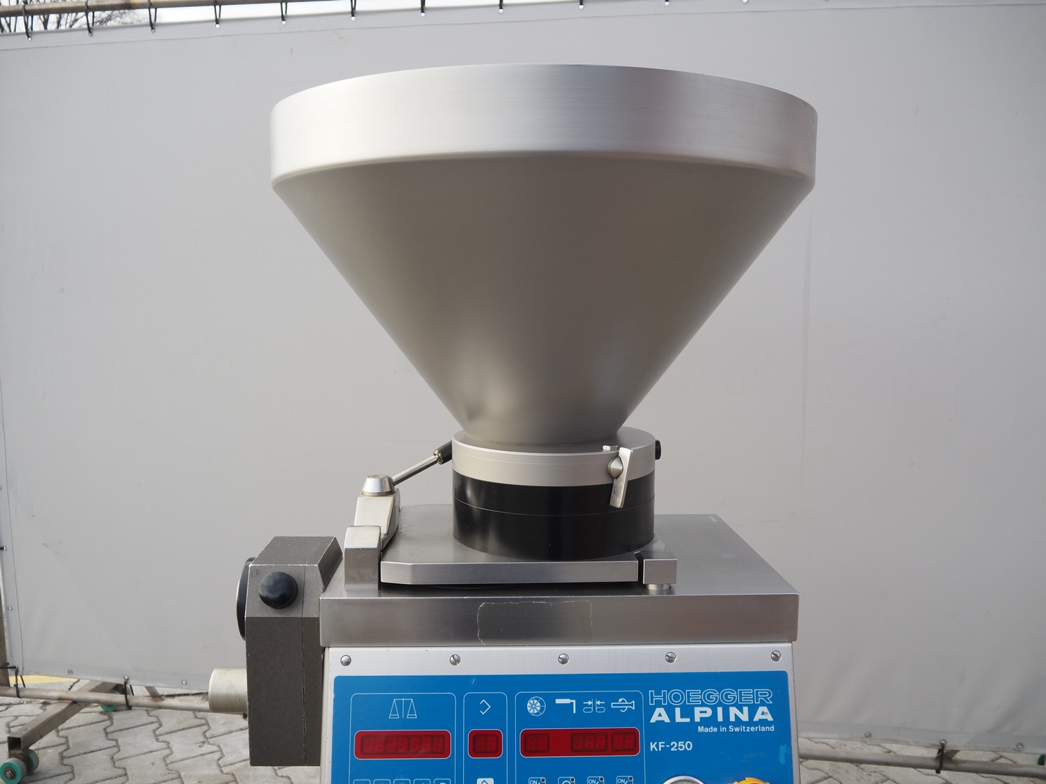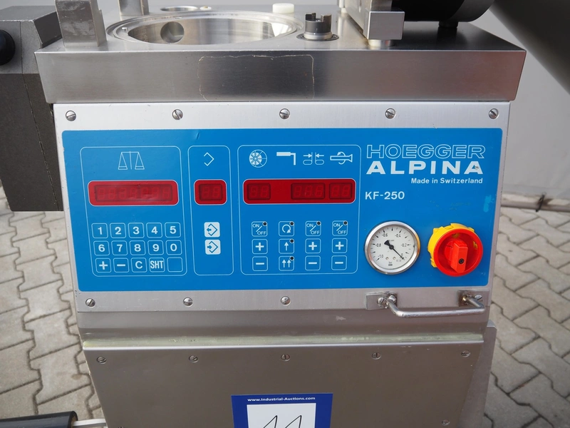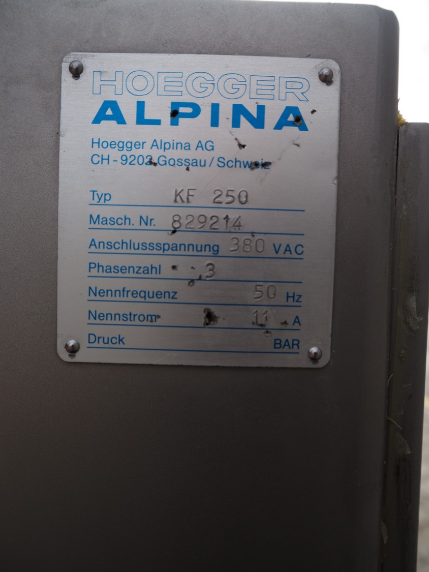 Hoegger Alpina vacuum filling machine, type: KF 250, number: 829214, 380 V, 3 Ph, 50 Hz, 11 A, dimensions: 1100 mm x 650 mm x 1700 mm. Including crate with rotor and other parts.