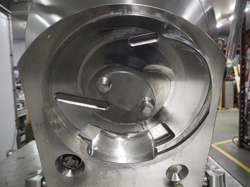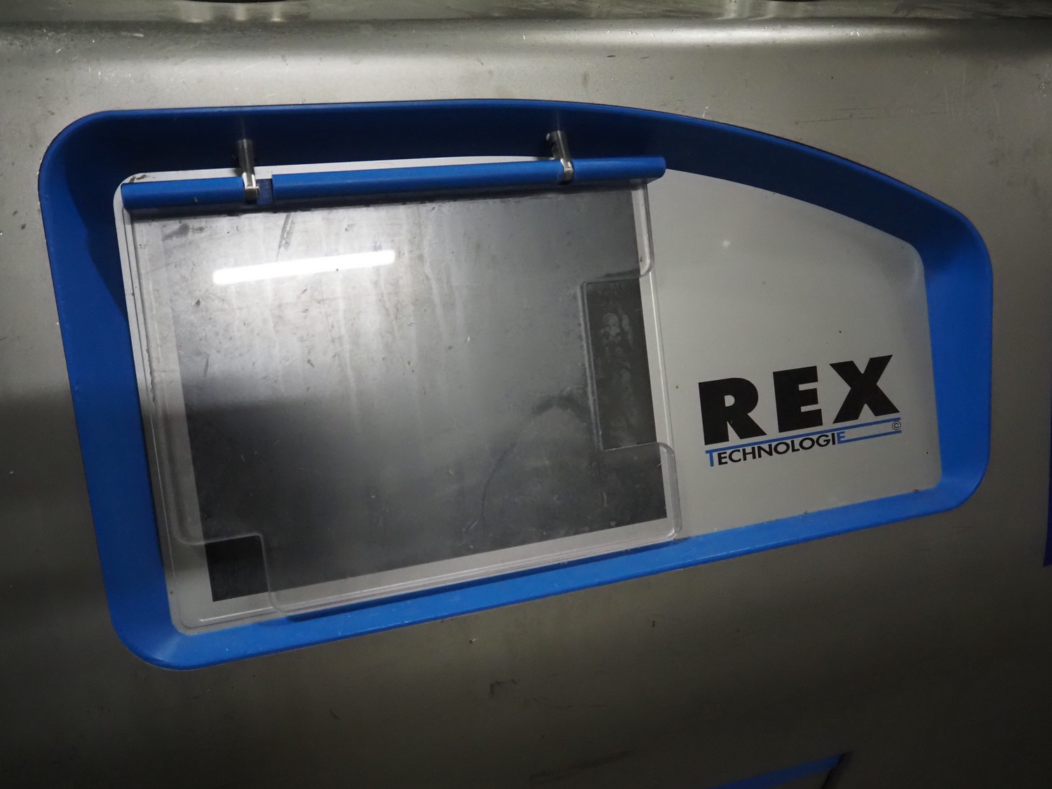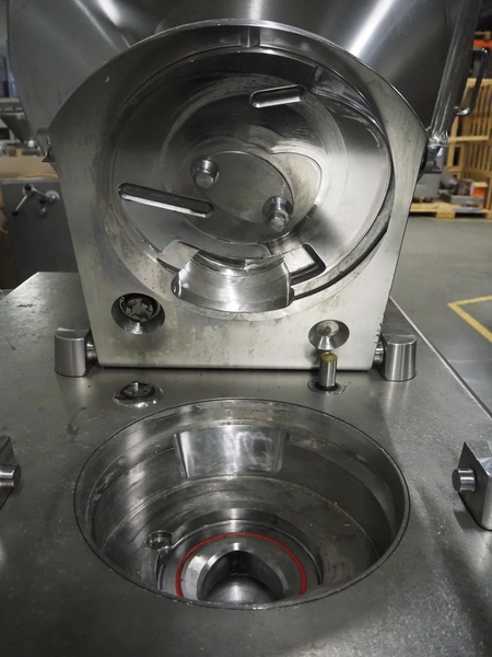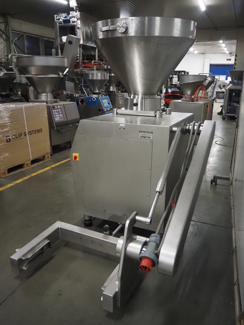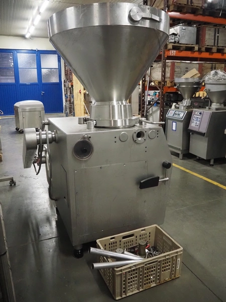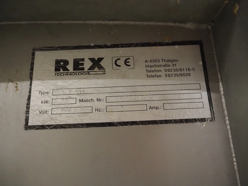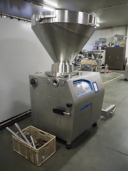 Rex Technologie vacuum filling machine with lifter for 200 liter meat bins, type: RVF 911, machine number: 9110090529, 400 V, 3 Ph, 50 Hz, 44 A, 22 kW, dimensions: 2100 mm x 1400 mm x 2070 mm. Including crate with parts and 2 rotors with 8 and 16 vanes.