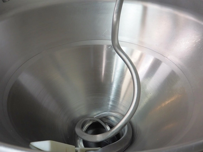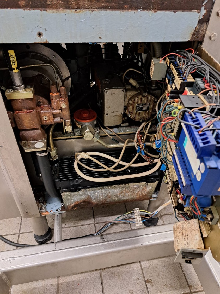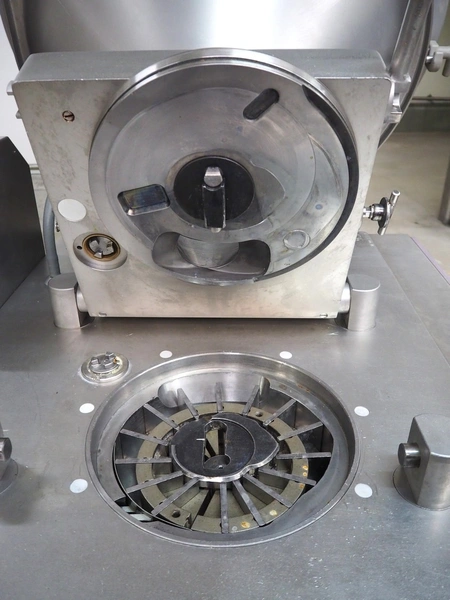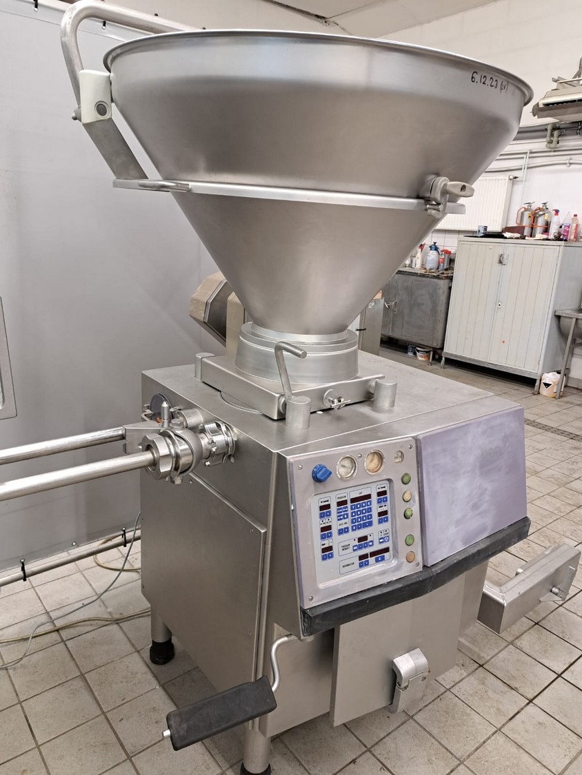 Handtmann vacuum filling machine with lifter for 200 liter meat bins, type: VF200B, number: 4235, year of construction: 1998, 400 V, 50 Hz, 17 A, 6.5 kW, with Becker vacuum pump, capacity: 16/19 m³ per hour, dimensions: 1900 mm x 1330 mm x 2200 mm.