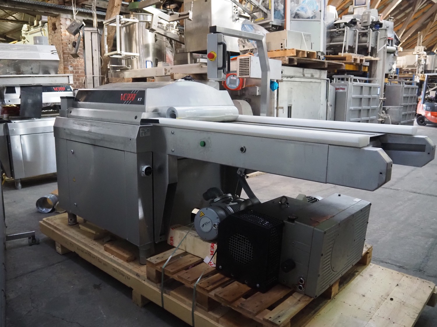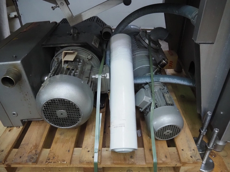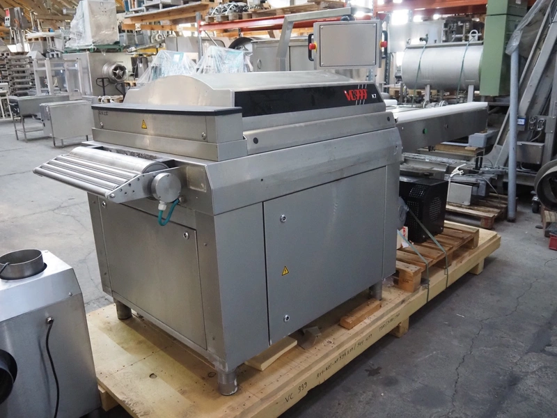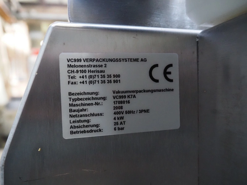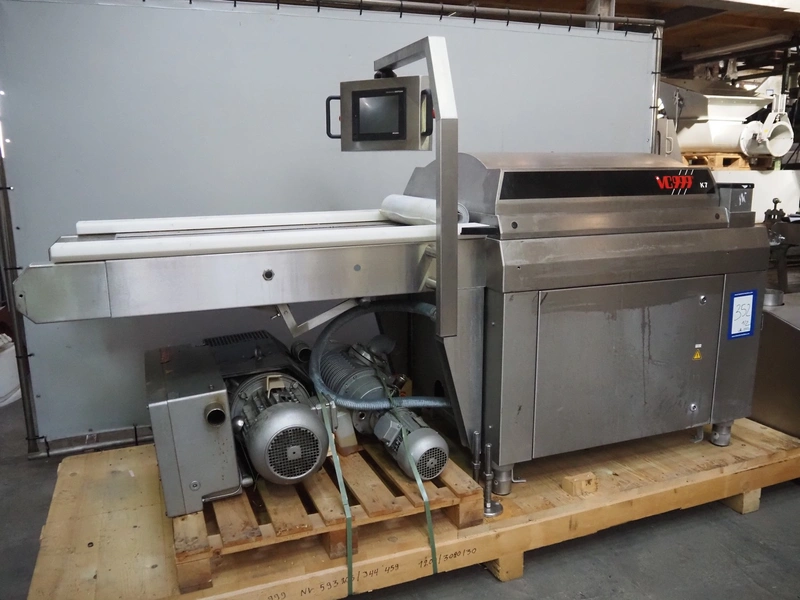 VC999 Verpackungssysteme AG belt vacuum machine, type: VC999 K7A, machine number: 1708016, year of construction: 2008, 400 V, 3 Ph, 50 Hz, 25 AT, 4 kW, 6 bar, plastic belt, belt width: 610 mm, total dimensions: 3100 mm x 1100 mm x 1650 mm. Including vacuum pump and suction device, dimensions: 750 mm x 700 mm x 900 mm.