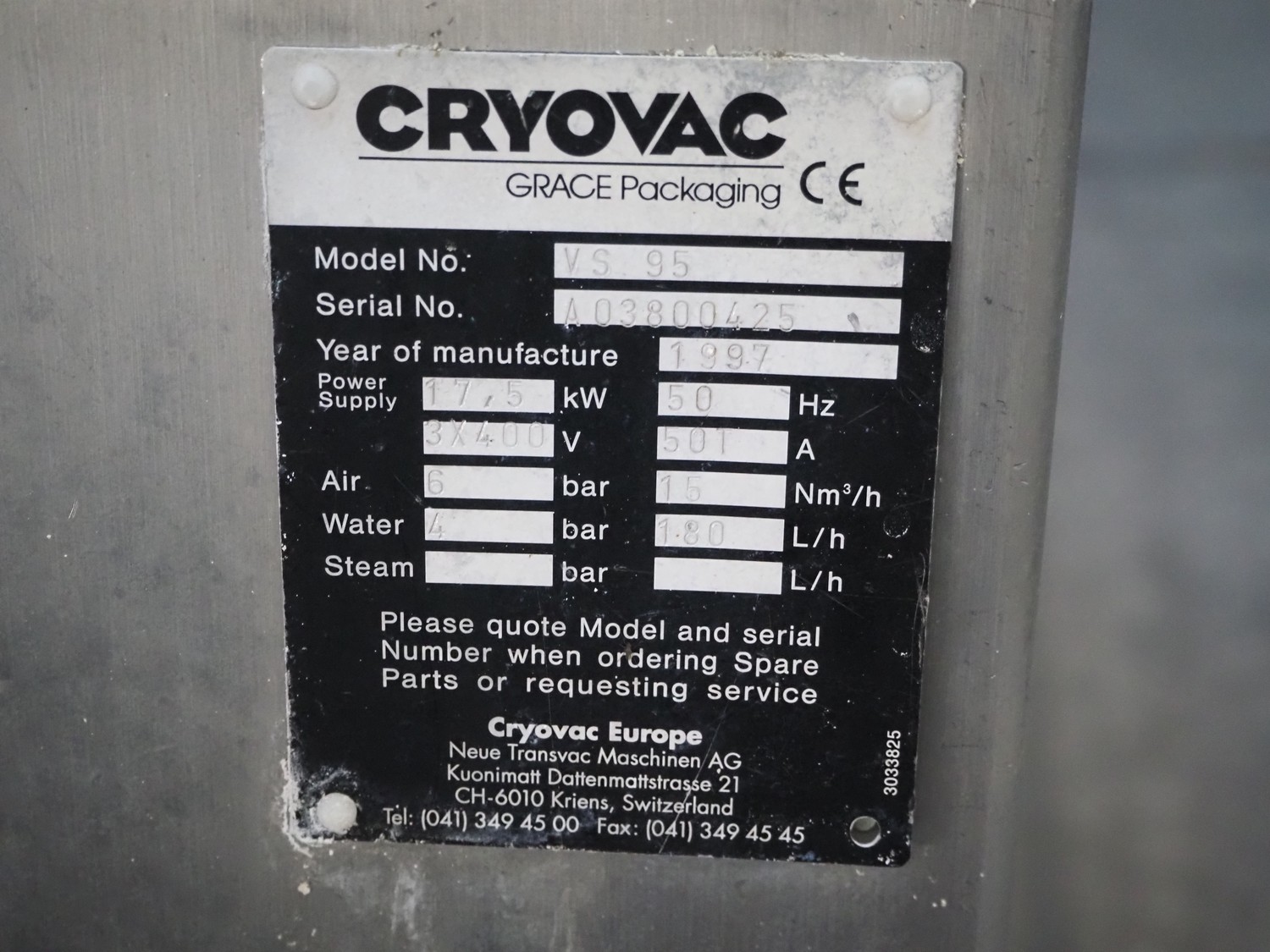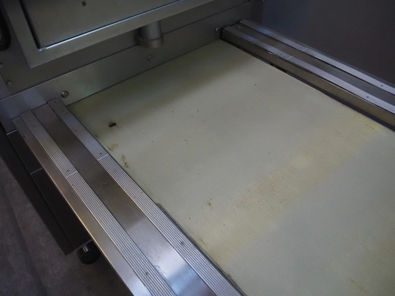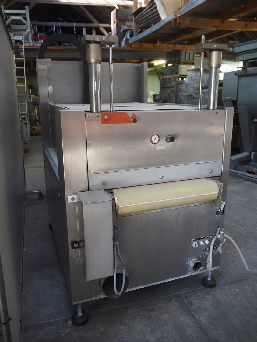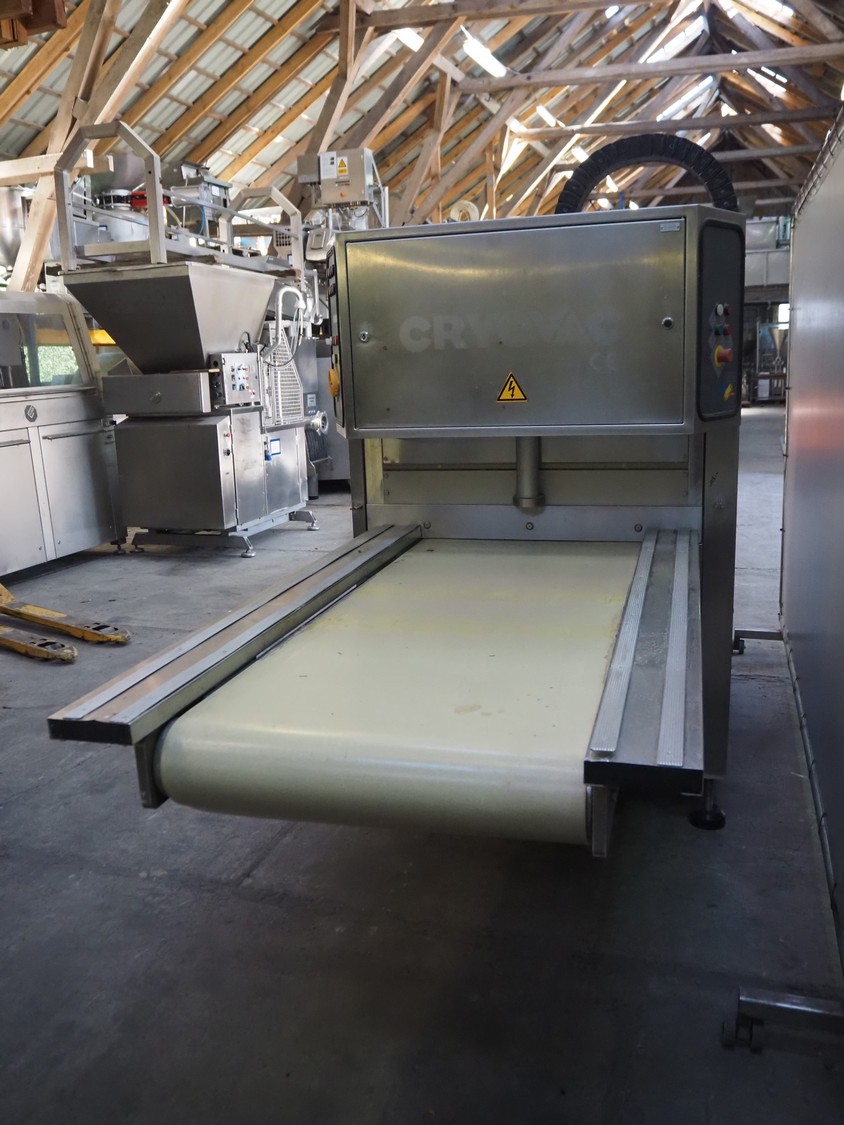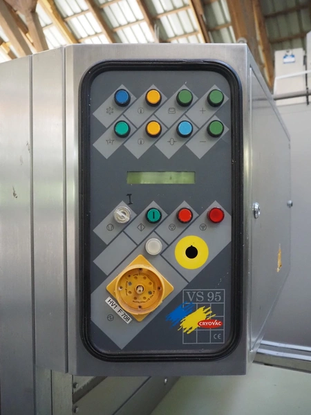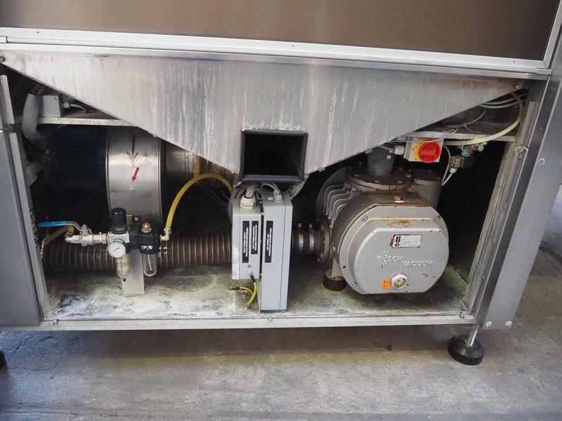 Cryovac belt vacuum machine, model: VS 95, serial number: A03800425, year of construction: 1997, 400 V, 3 Ph, 50 Hz, 17.5 kW, 4/6 bar, plastic belt, belt width: 730 mm, Busch vacuum pump, type: WV 1000 B 001 KDXX, serial number: C0508000392, total dimensions: 1900 mm x 880 mm x 1580 mm. Including crates with parts.