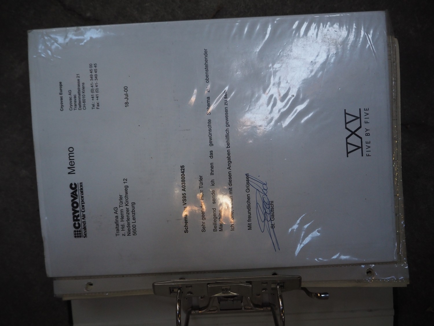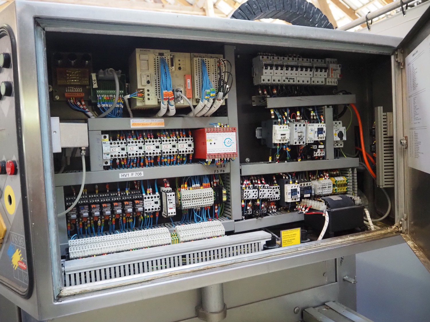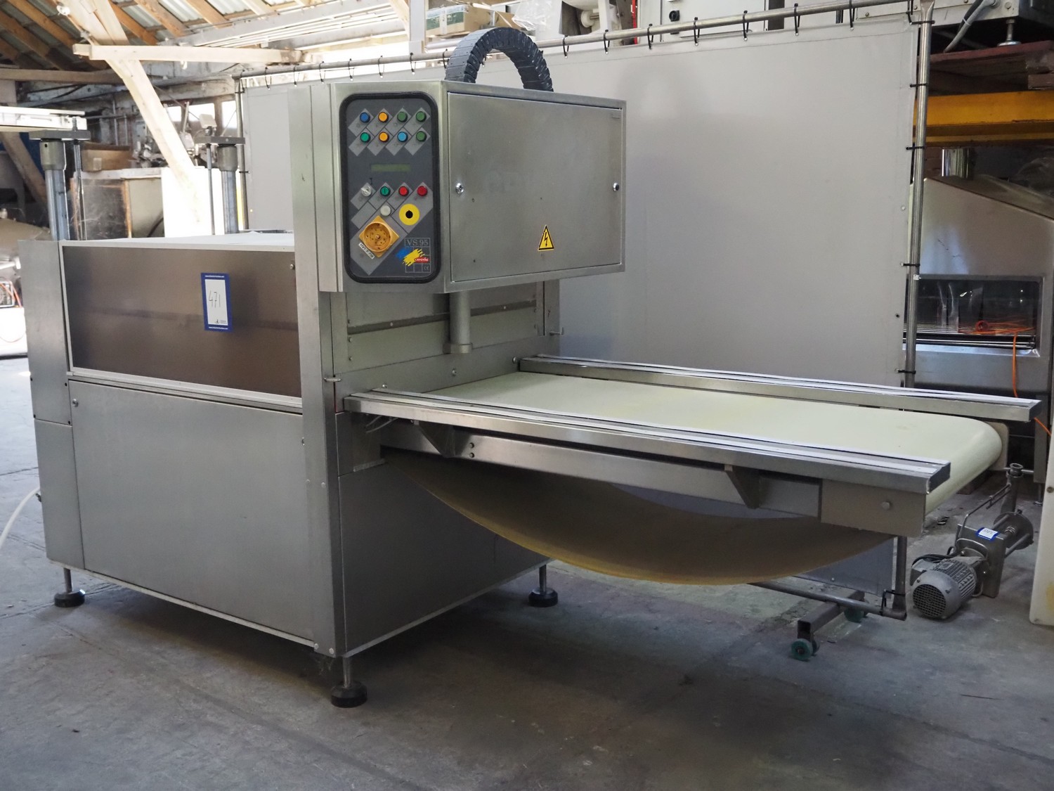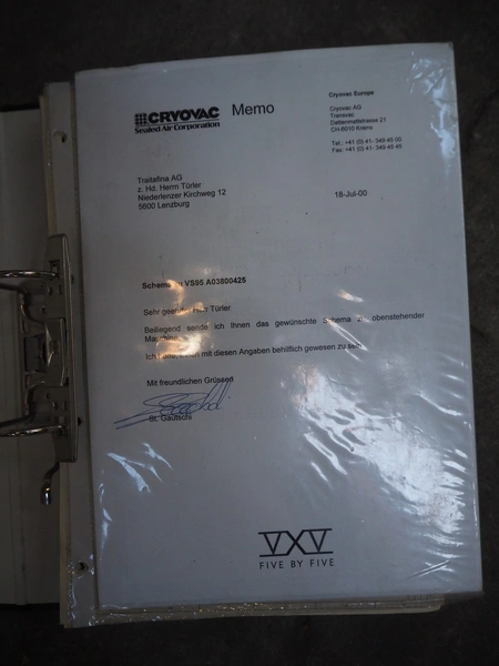 Cryovac belt vacuum machine, model: VS 95, serial number: A03800425, year of construction: 1997, 400 V, 3 Ph, 50 Hz, 17.5 kW, 4/6 bar, plastic belt, belt width: 730 mm, Busch vacuum pump, type: WV 1000 B 001 KDXX, serial number: C0508000392, total dimensions: 1900 mm x 880 mm x 1580 mm. Including crates with parts.