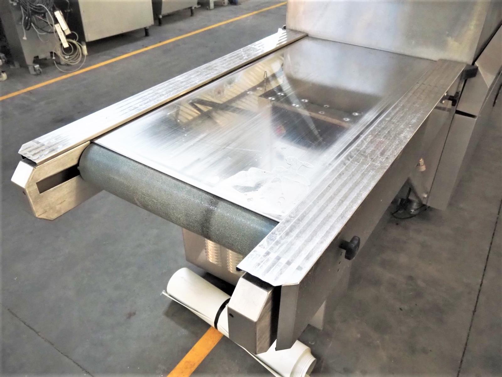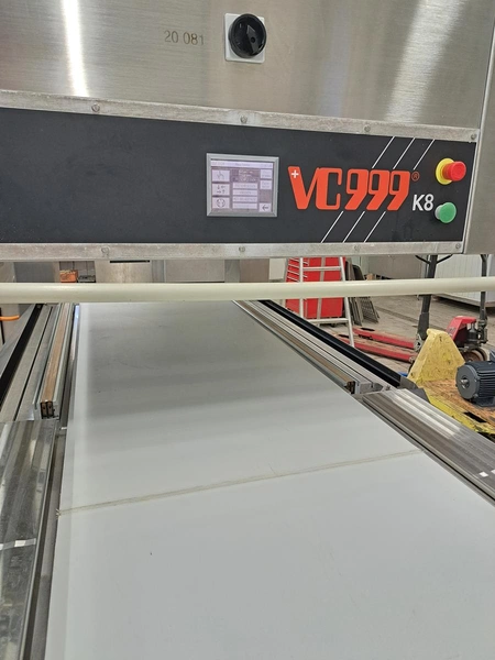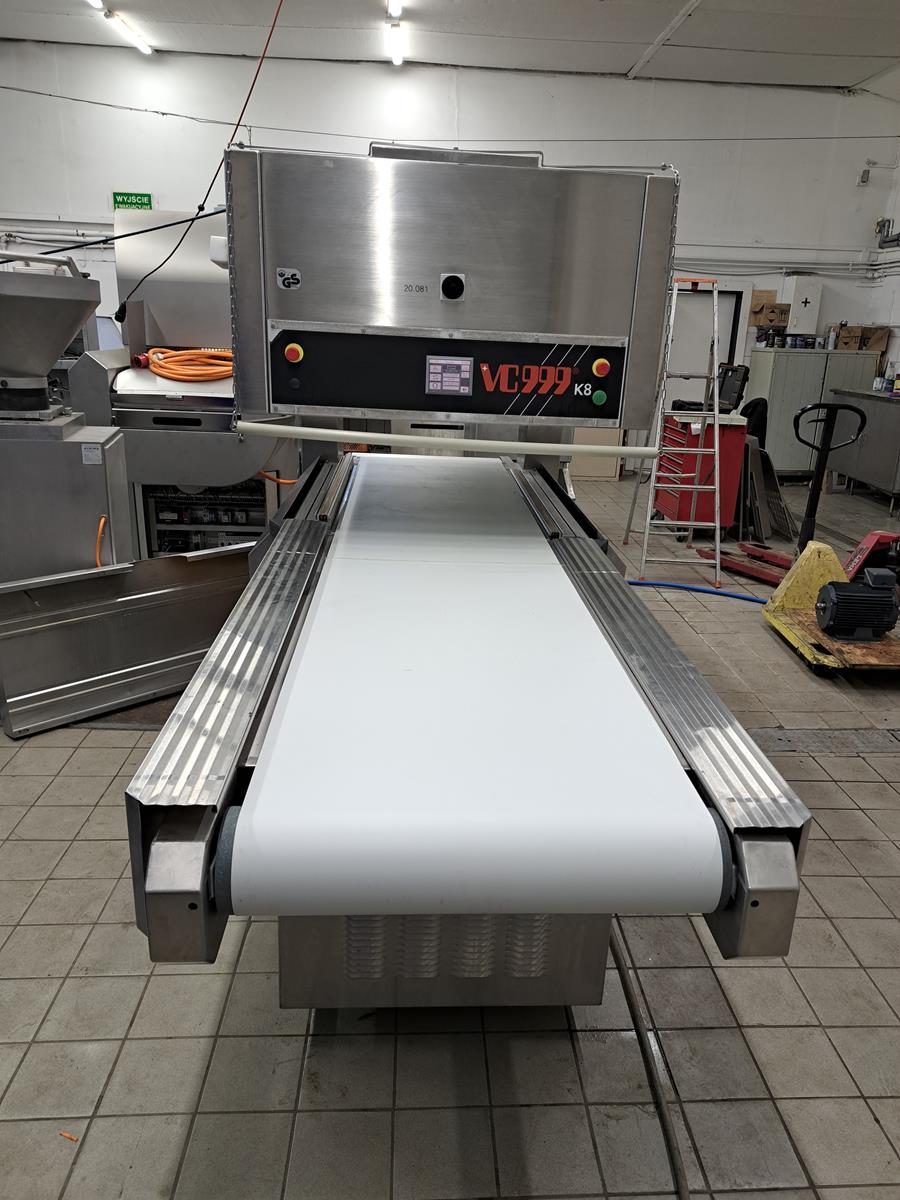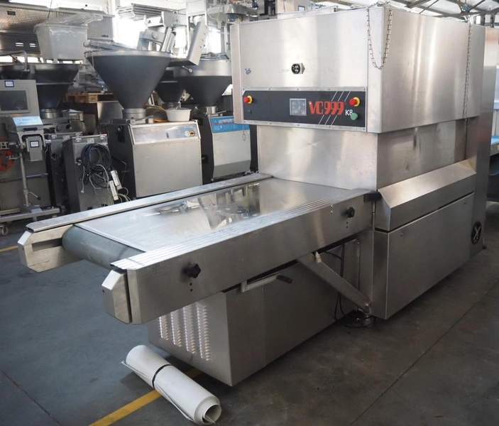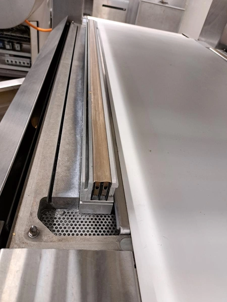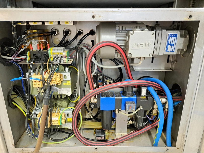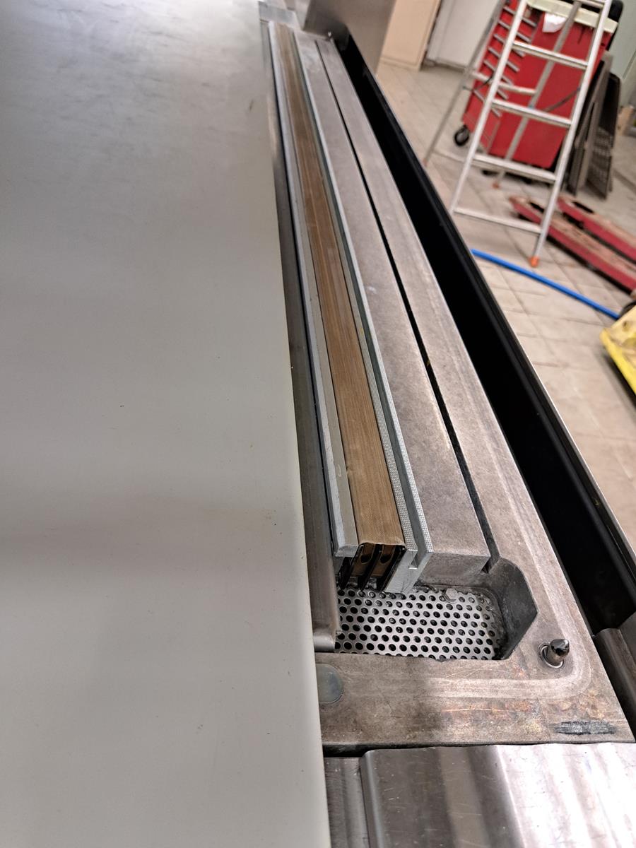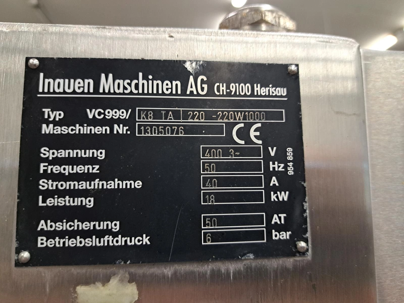 Inauen Maschinen AG belt vacuum machine, type: VC999/K8 TA | 220-220W1000, machine number: 1305076, 400 V, 3 Ph, 50 Hz, 40 A, 18 kW, plastic belt, belt width: 680 mm, Gardner Denver vacuum pump, type: R-VWP 1000, capacity: 1000 m³ per hour, total dimensions: 3450 mm x 1200 mm x 2200 mm.