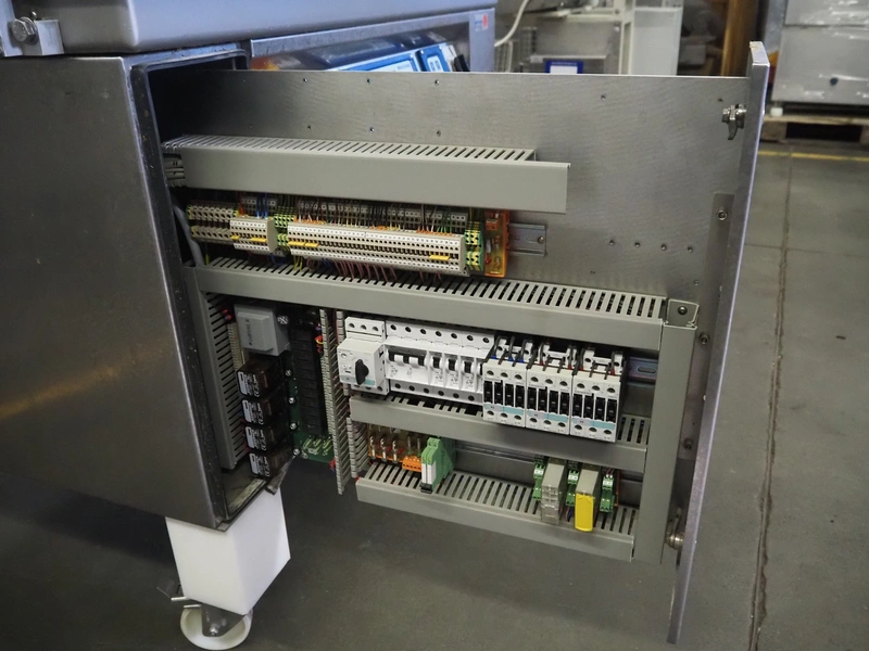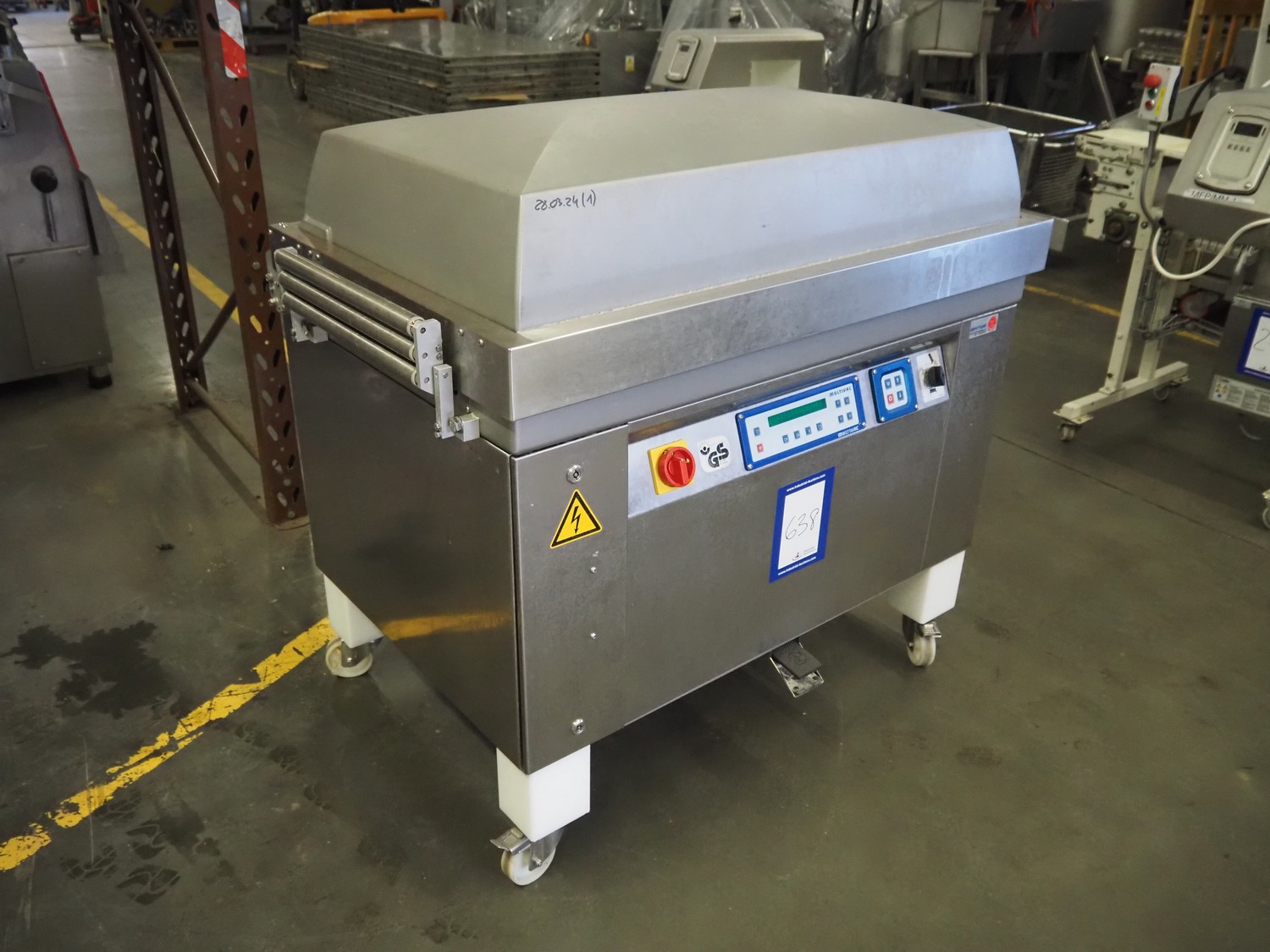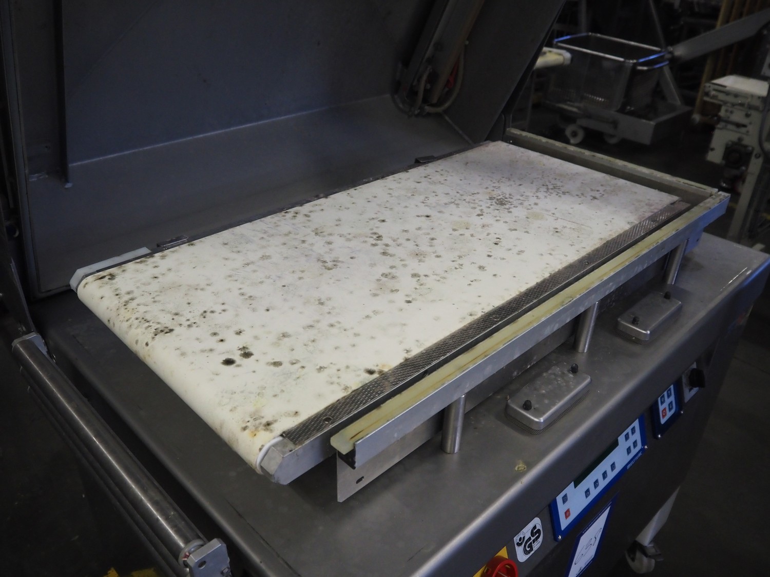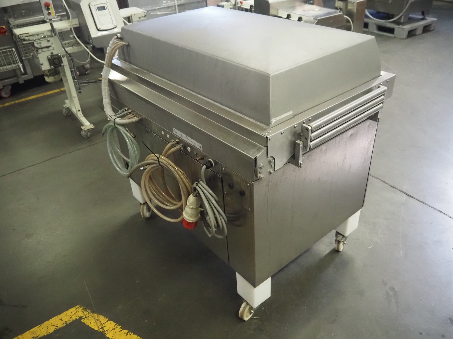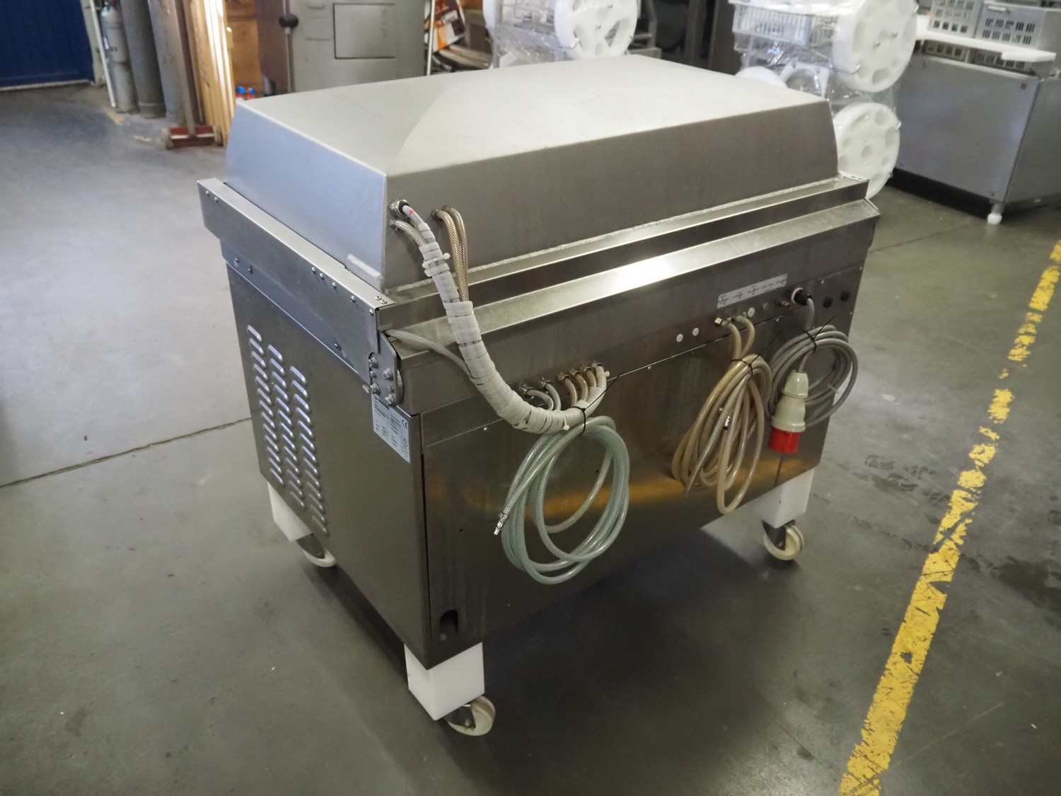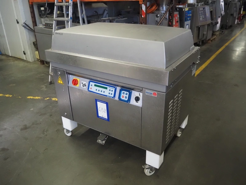 Multivac mobile belt vacuum machine, type: C700, machine number: 112919, year of construction: 2006, 400 V, 33 PH, 50 Hz, 22 A, 7 kW, plastic belt, belt width: 440 mm, seal length: 980 mm and 500 mm, total dimensions: 1250 mm x 900 mm x 1200 mm.
