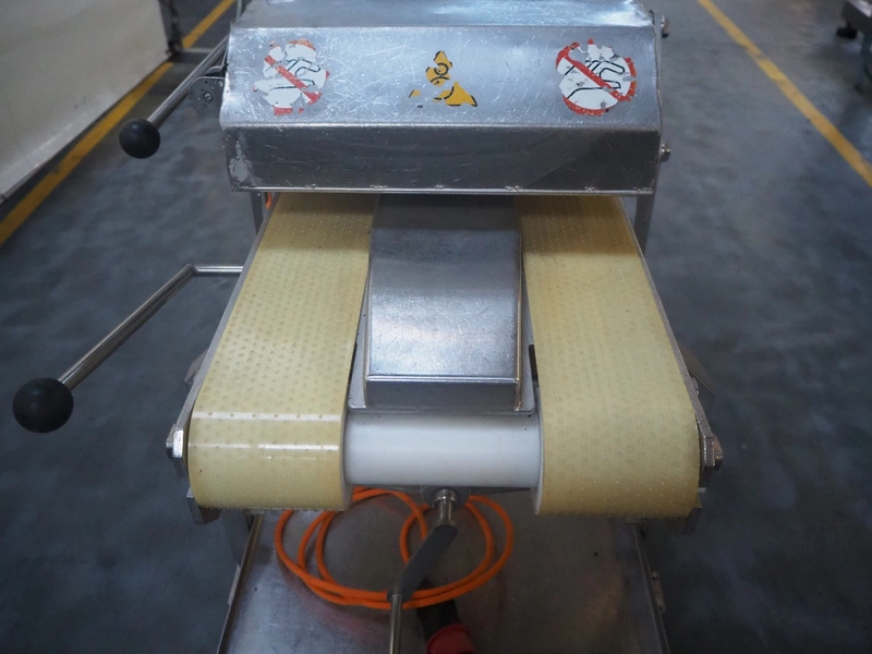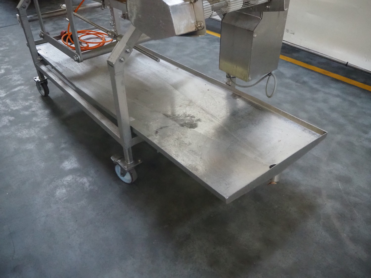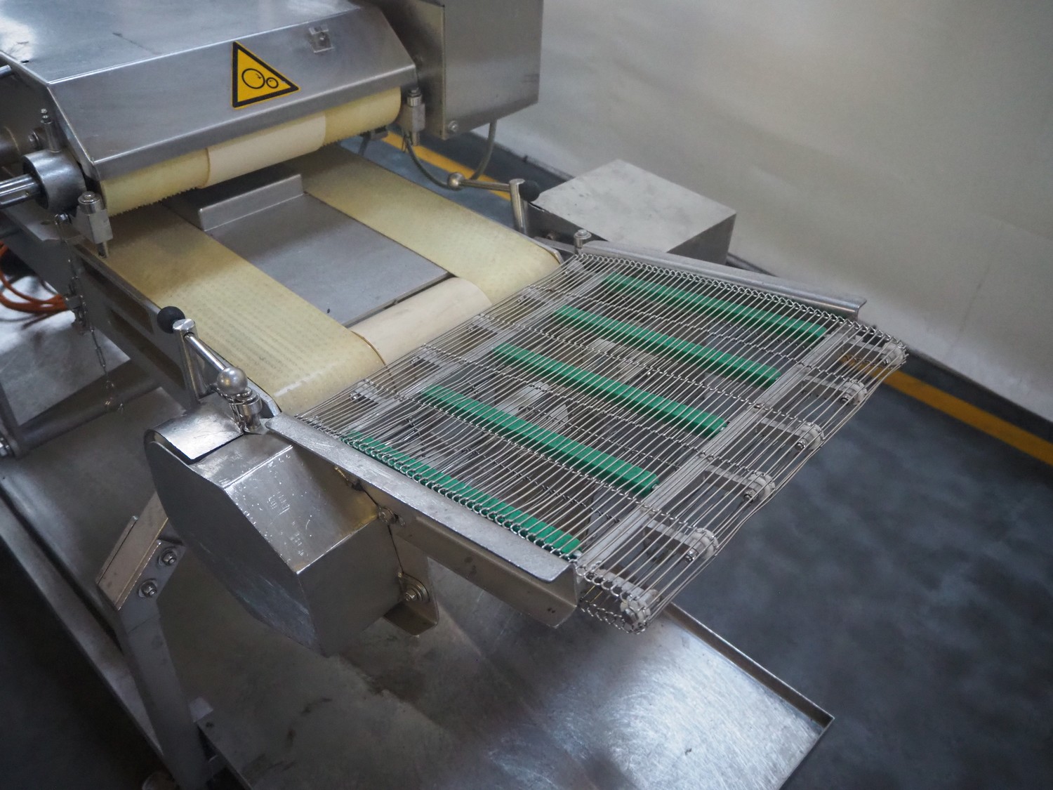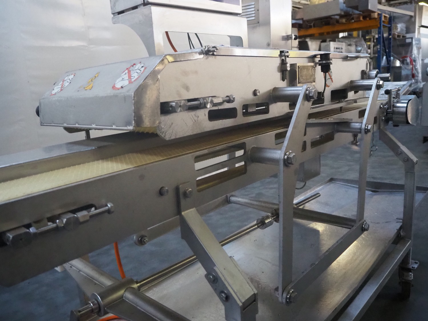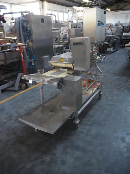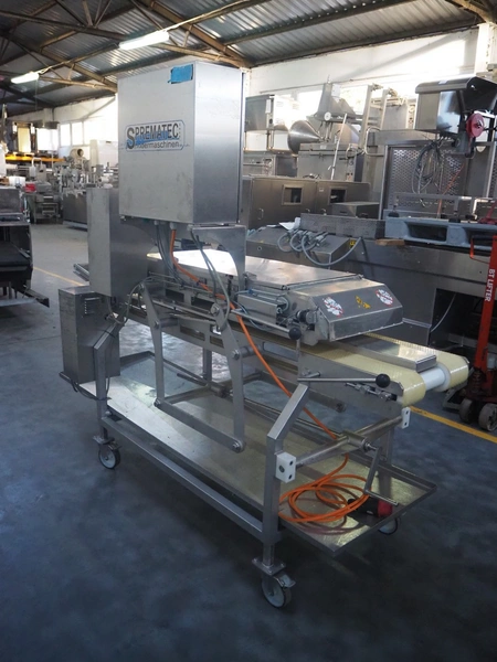 Sprematec mobile cordon bleu machine, type: CB-Schneider, machine number: 210002, year of construction: 05.2008, s/s mesh belt, belt width: 400 mm, plastic belt, belt width: (2x) 115 mm, total dimensions: 2100 mm x 800 mm x 1800 mm.