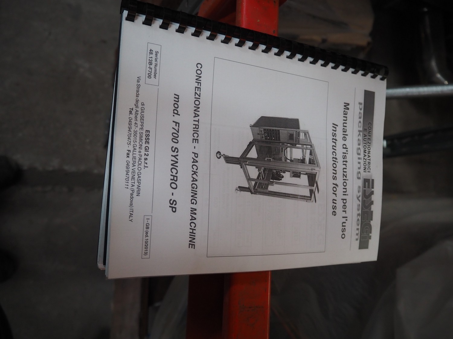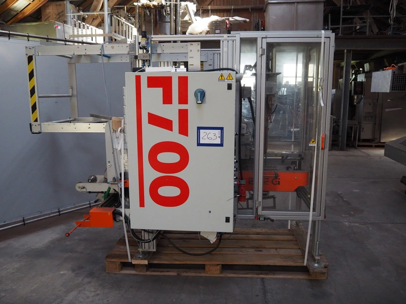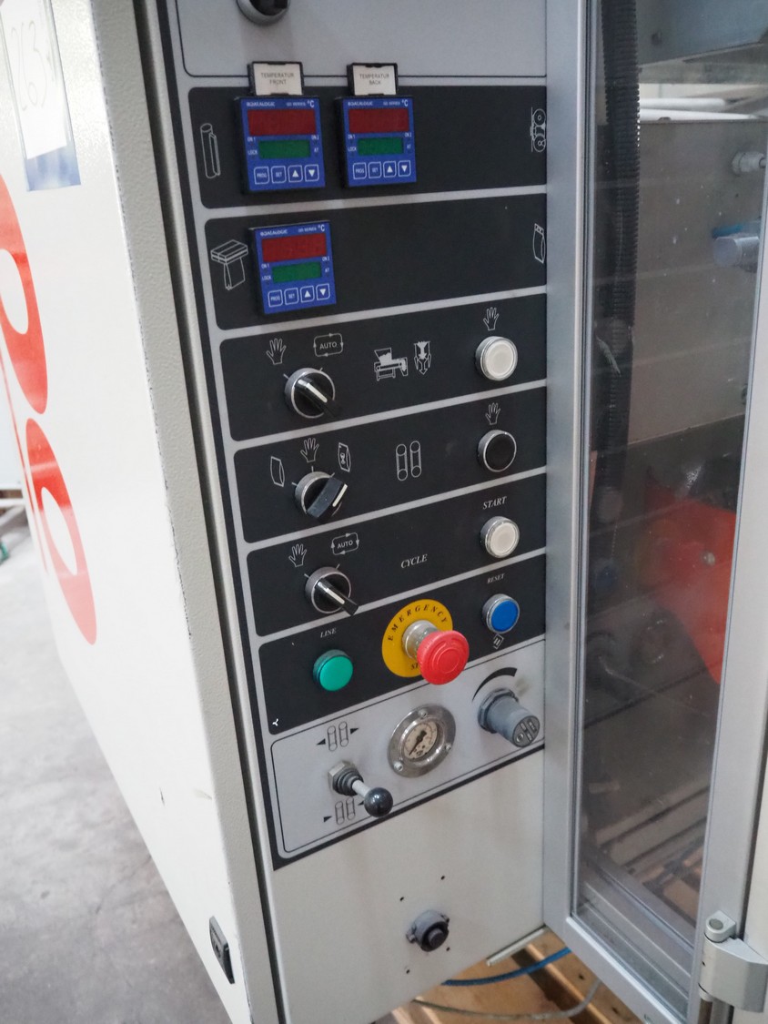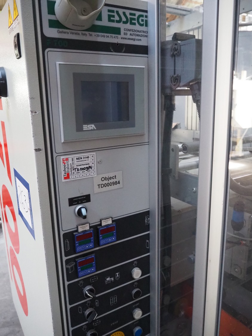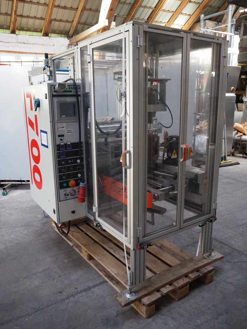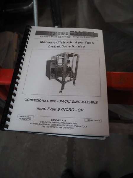 Esse Gi Packaging Systems vertical bag from-, fill- and seal machine, model: F 700 SYNCRO/SP, serial number: 16/2011, year of construction: 2011, 400 V, 3 Ph, 50 Hz, 11 kVa, dimensions pipe: 40 mm x 60 mm, vertical seal length: 300 mm, horizontal seal length: 300 mm, total dimensions: 1250 mm x 2600 mm x 2000 mm.