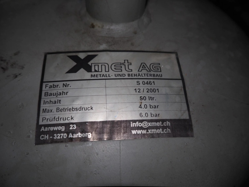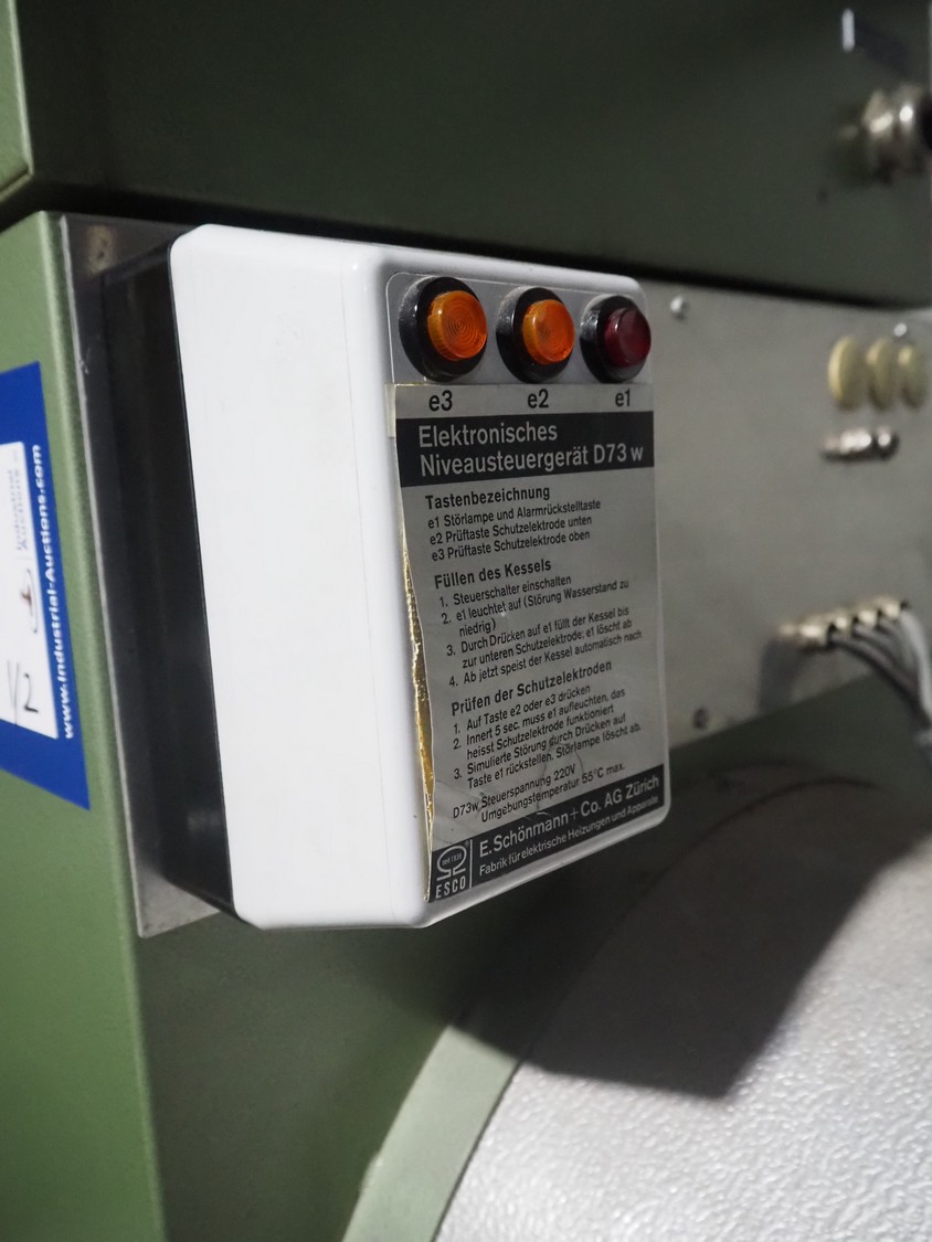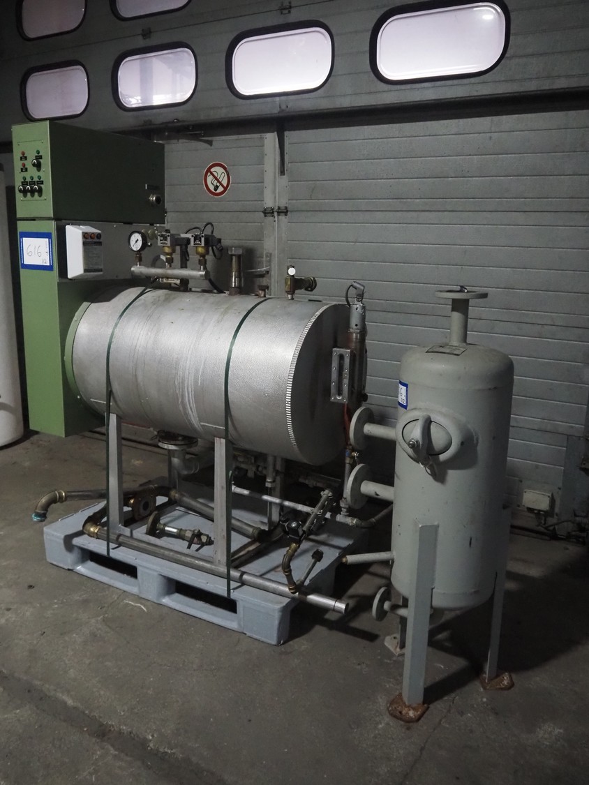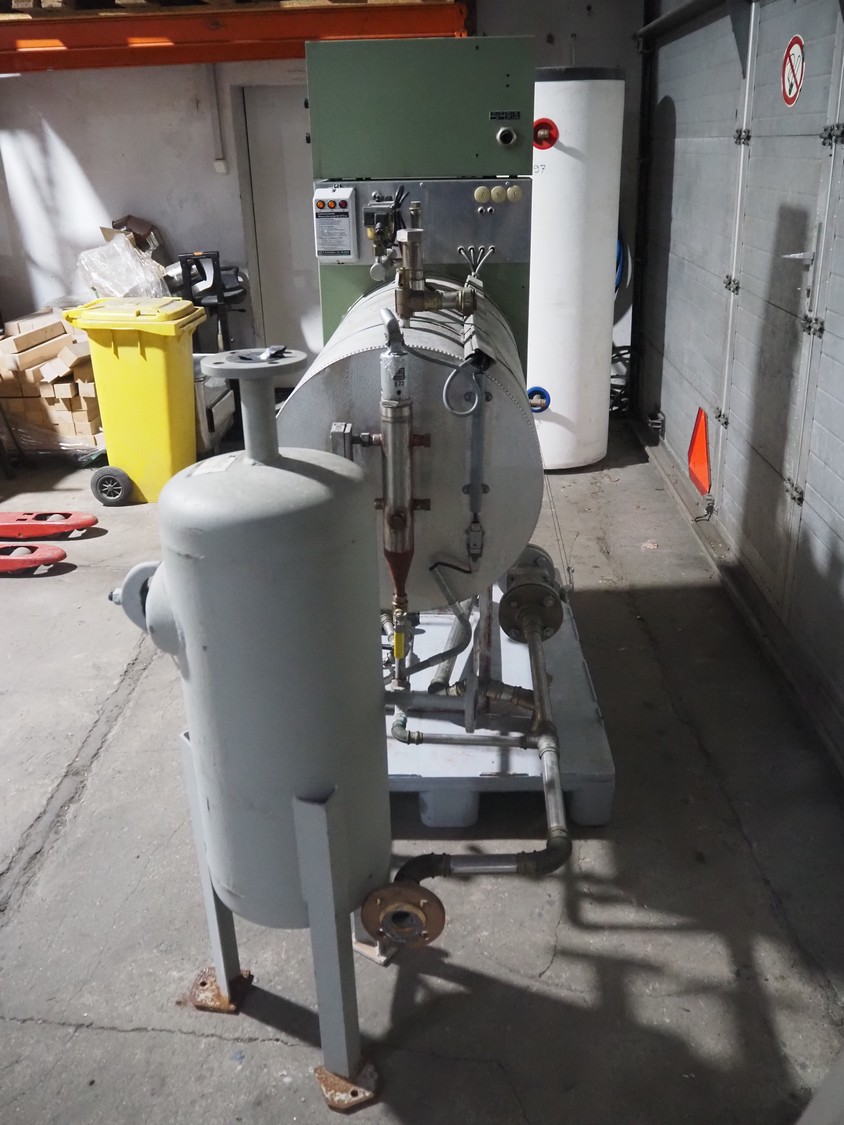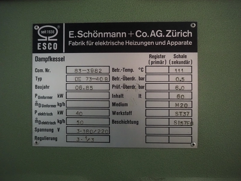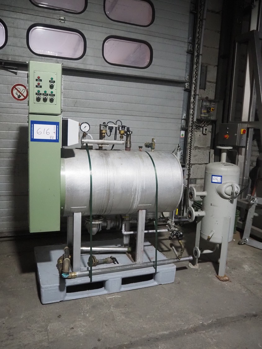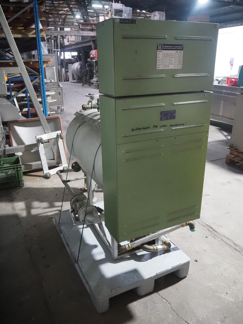 E. Schönmann + Co.AG. steam generator, type: DE 73-40 B, number: 83-3982, year of construction: 06-1985, 380/220 V, 3 Ph, 40 kW, volume: 60 liter, medium: H20 dimensions: 1860 mm x 650 mm x 1650 mm. Including Xmet AG steel pressure vessel, number: S 0461, year of construction: 12/2001, volume: 50 liter, working pressure: 4.0 bar, dimensions: 580 mm x 480 mm x 1250 mm.