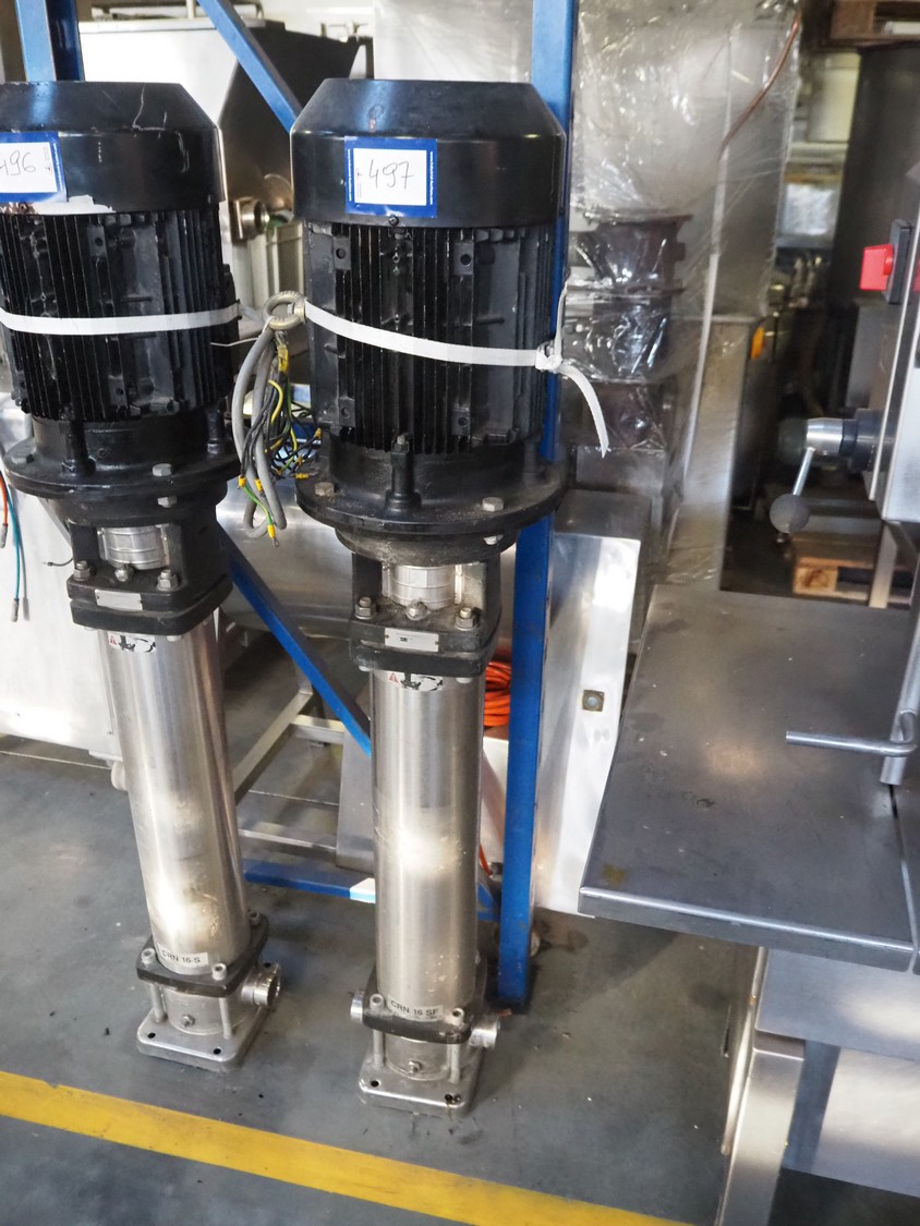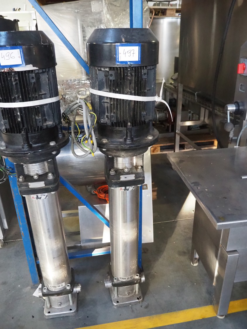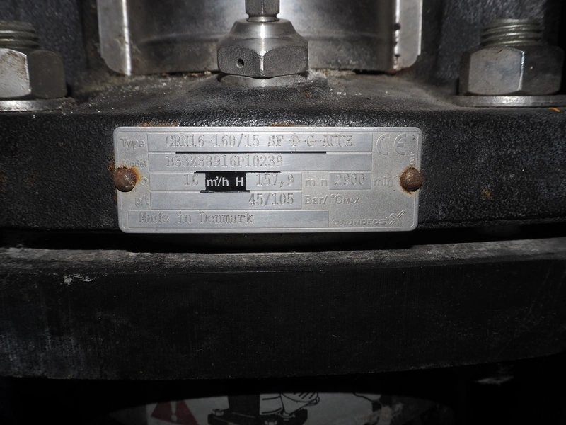 Grundfos circulation pump, type: CRN16-160/15 S-P-G-AUUE, model: B33Z38916P10239, capacity: 16 m³ per hour, dimensions: 350 mm x 350 mm x 1600 mm.