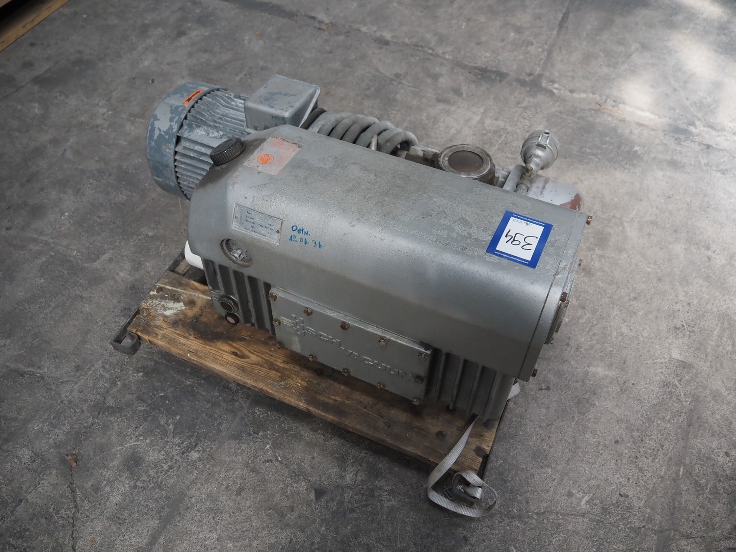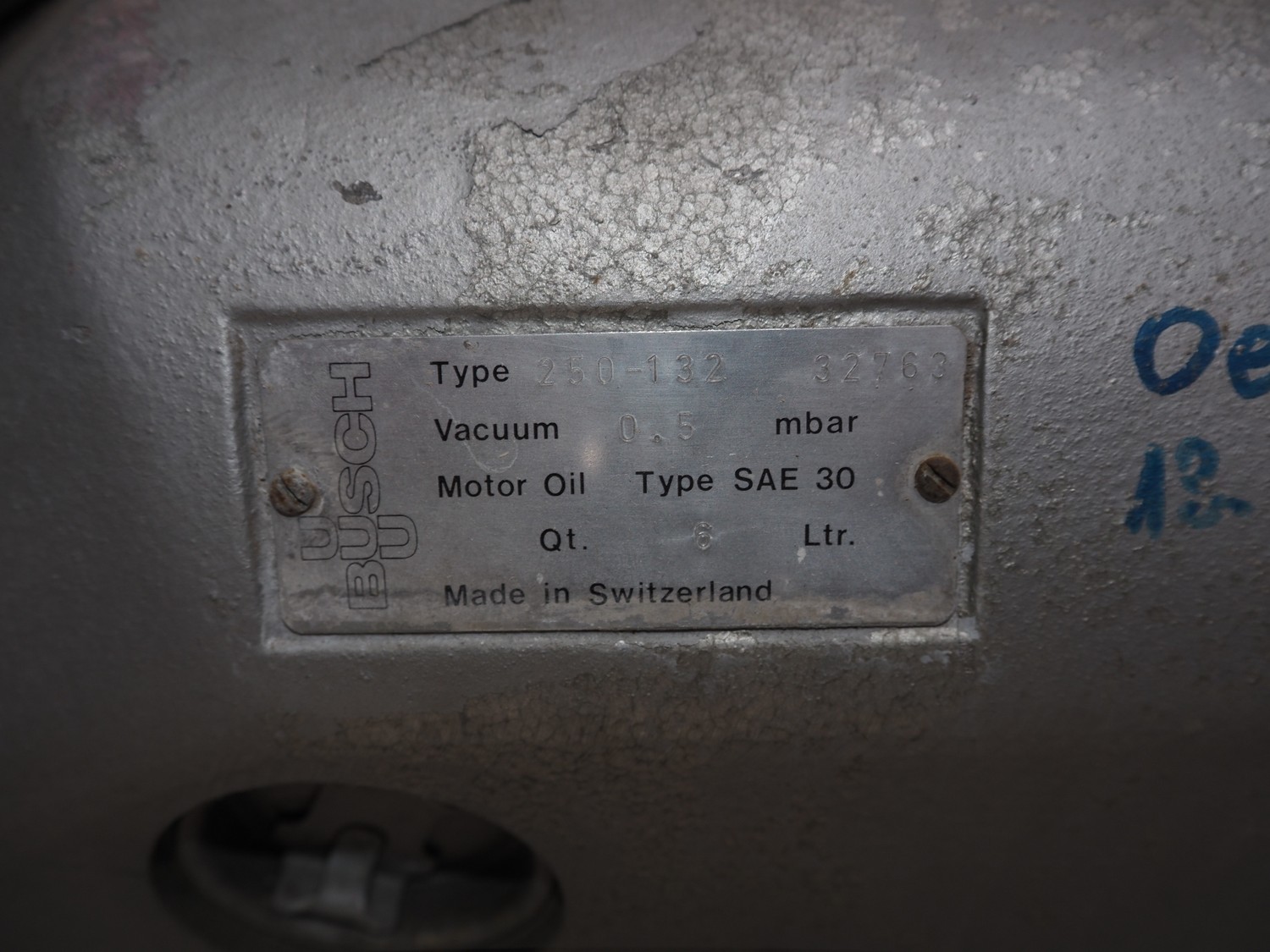 Busch vacuum pump, type: 250-132, number: 32763, capacity: 250 m³/hour, 6 liter, dimensions: 940 mm x 500 mm x 450 mm.