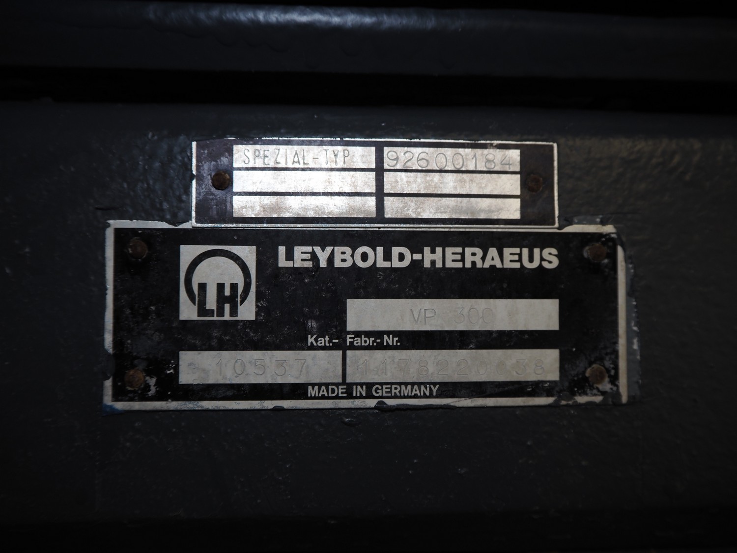 Leybold-Heraeus vacuum pump, type: VP 300, number: 1178220038, capacity: 300 m³ per hour, dimensions: 1200 mm x 380 mm x 750 mm.