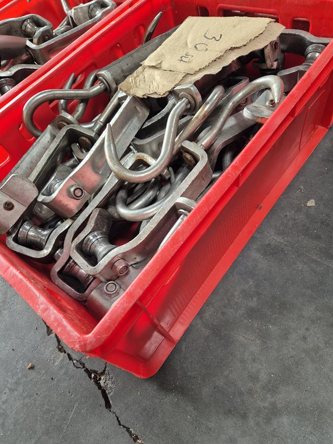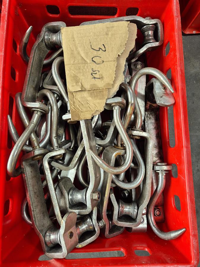 Crate with 30 s/s meat hooks, dimensions hooks: 400 mm x 120 mm, dimensions crate:: 600 mm x 400 mm x 200 mm.