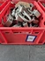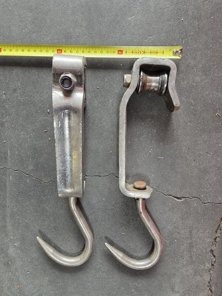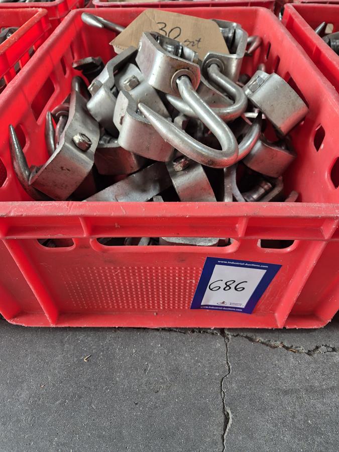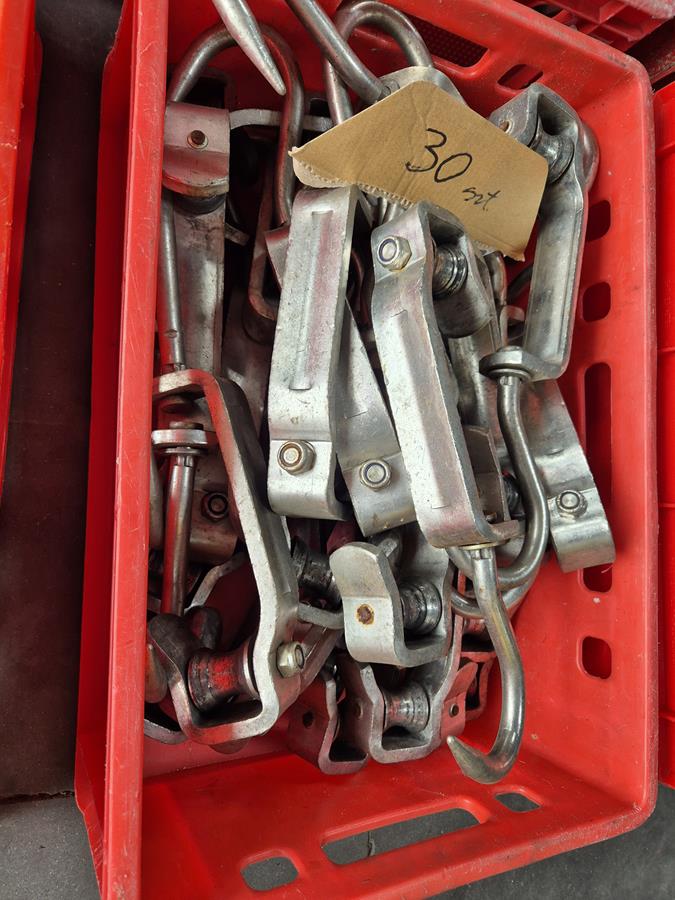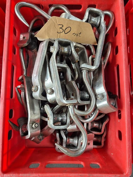 Crate with 30 s/s meat hooks, dimensions hooks: 400 mm x 120 mm, dimensions crate:: 600 mm x 400 mm x 200 mm.
