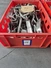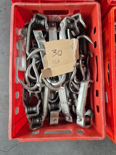 Crate with 30 s/s meat hooks, dimensions hooks: 400 mm x 120 mm, dimensions crate:: 600 mm x 400 mm x 200 mm.