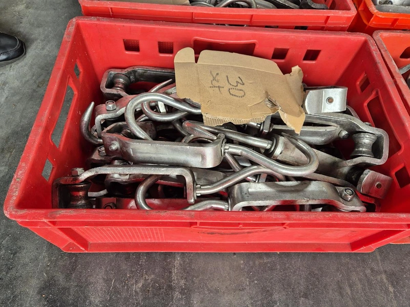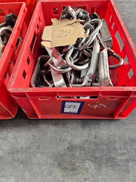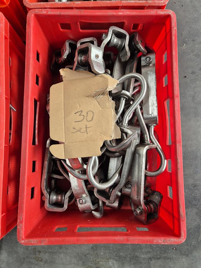 Crate with 30 s/s meat hooks, dimensions hooks: 400 mm x 120 mm, dimensions crate:: 600 mm x 400 mm x 200 mm.