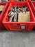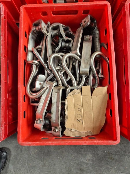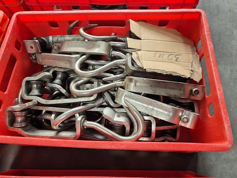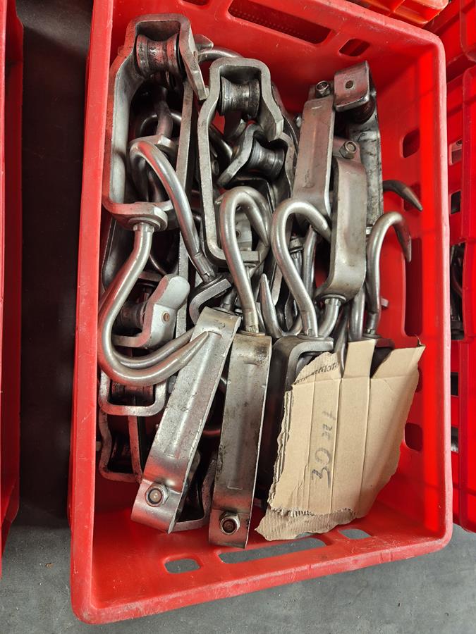 Crate with 30 s/s meat hooks, dimensions hooks: 400 mm x 120 mm, dimensions crate:: 600 mm x 400 mm x 200 mm.