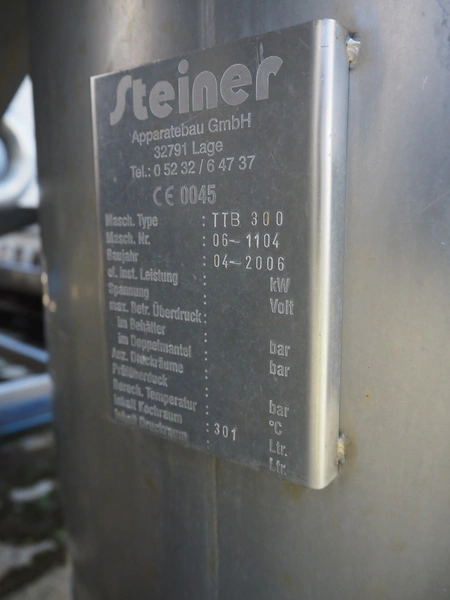 Steiner s/s mobile tank, type: TTB 300, machine number: 06-1104, year of construction: 04-2006, volume: 301 liters, dimensions: Ø 800 mm x 1300 mm.