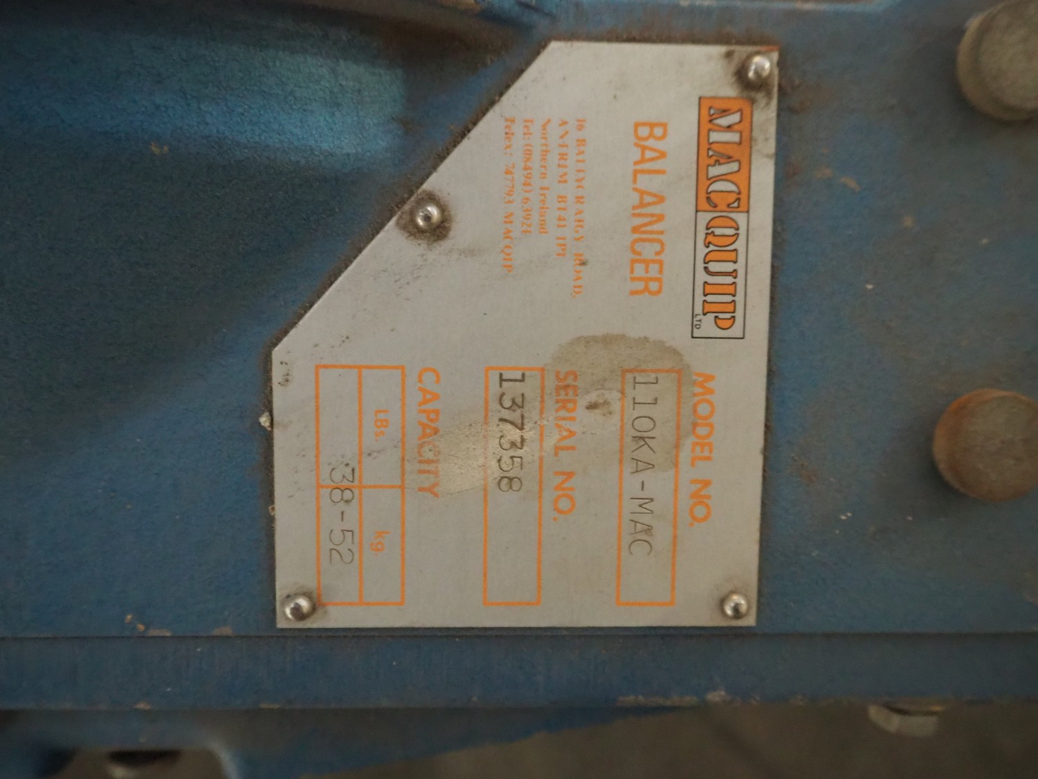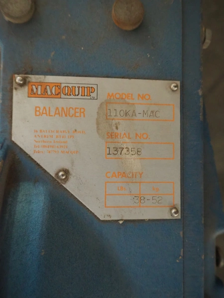 MacQuip balancer, model: 110KA-MAC, serial number: 137358, capacity: 52 kg, dimensions: 550 mm x 250 mm x 280 mm.