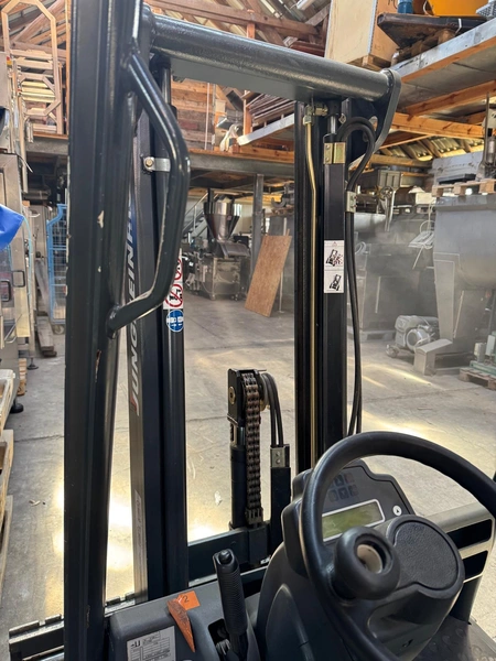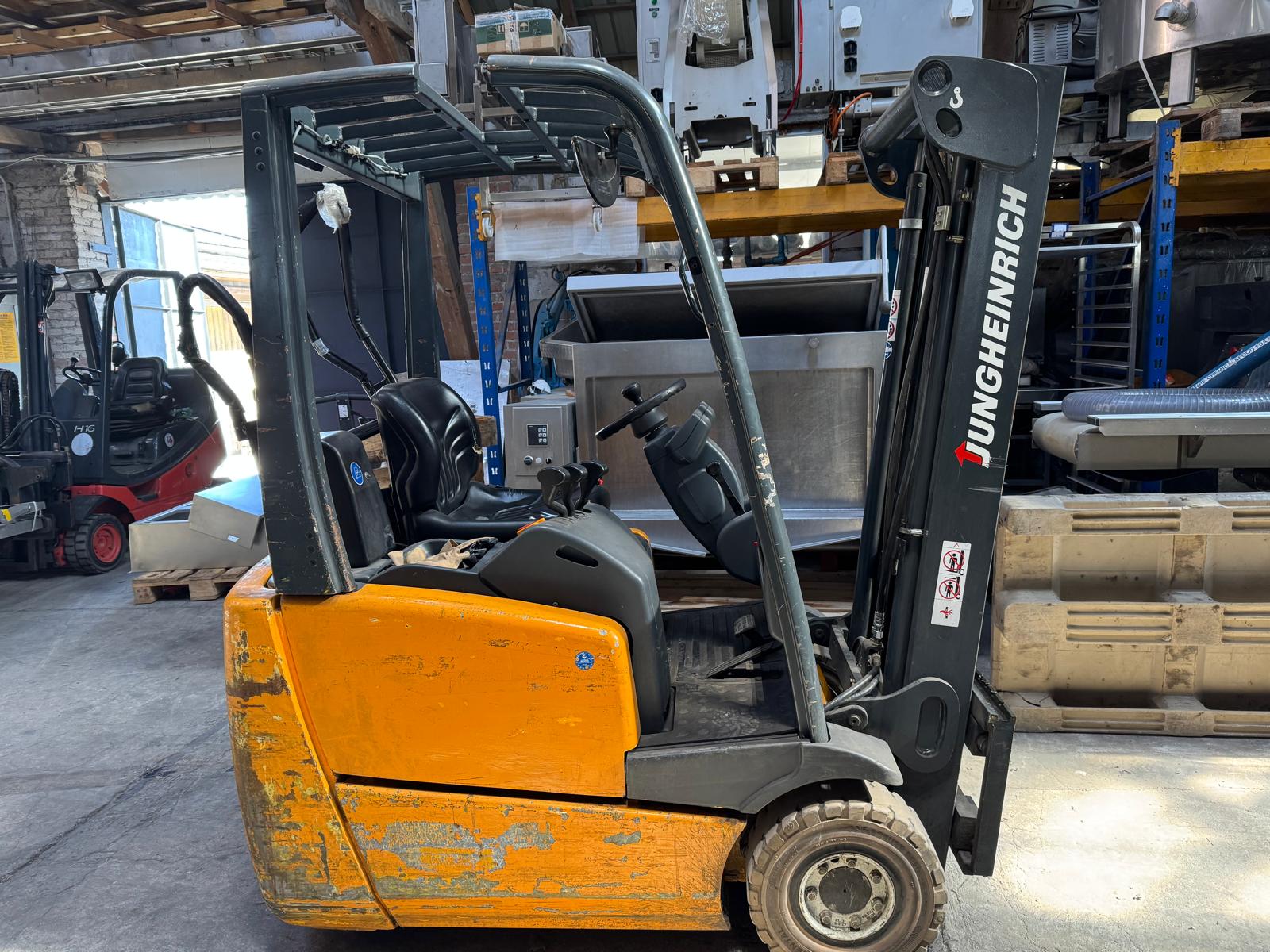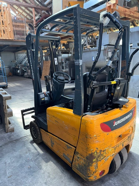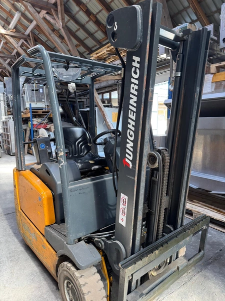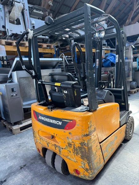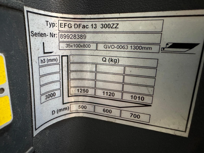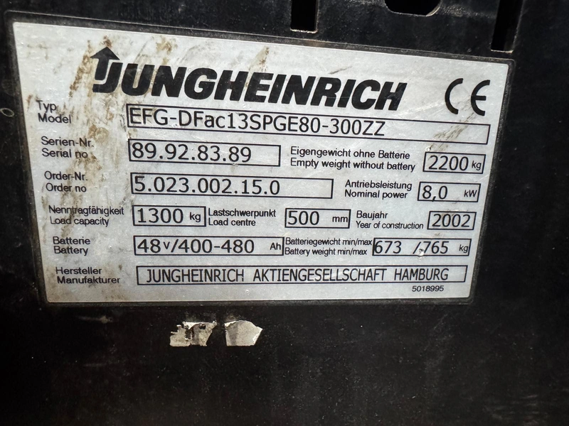 Jungheinrich electric forklift, model: EFG-DFac13SPGE80-300ZZ, year of construction: 2002, serial number: 89.92.83.89, 400/480 V, 8 kW, load capacity: 1300 kg, weight: 2200 kg, fork length: 1100 mm, total dimensions: 1800 mm x 1050 mm x 1950 mm.