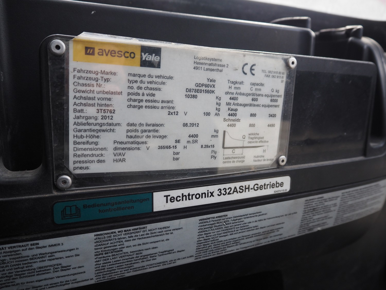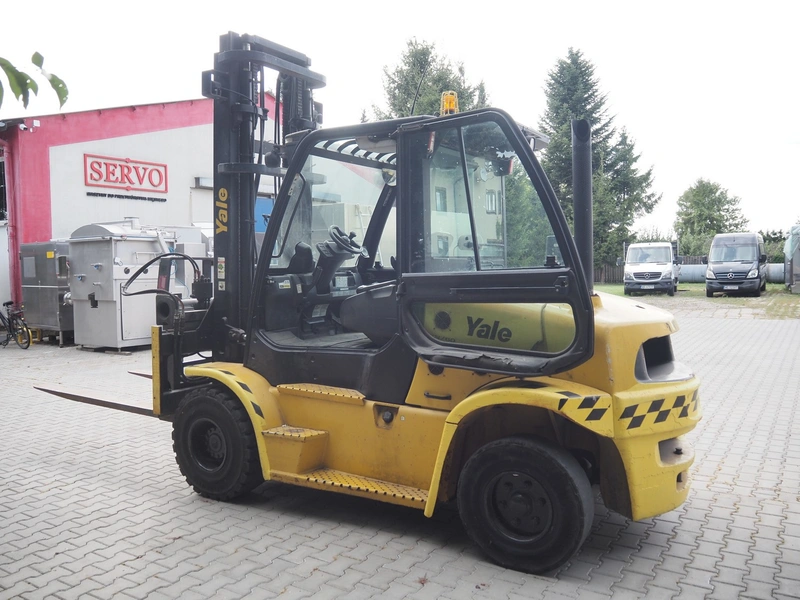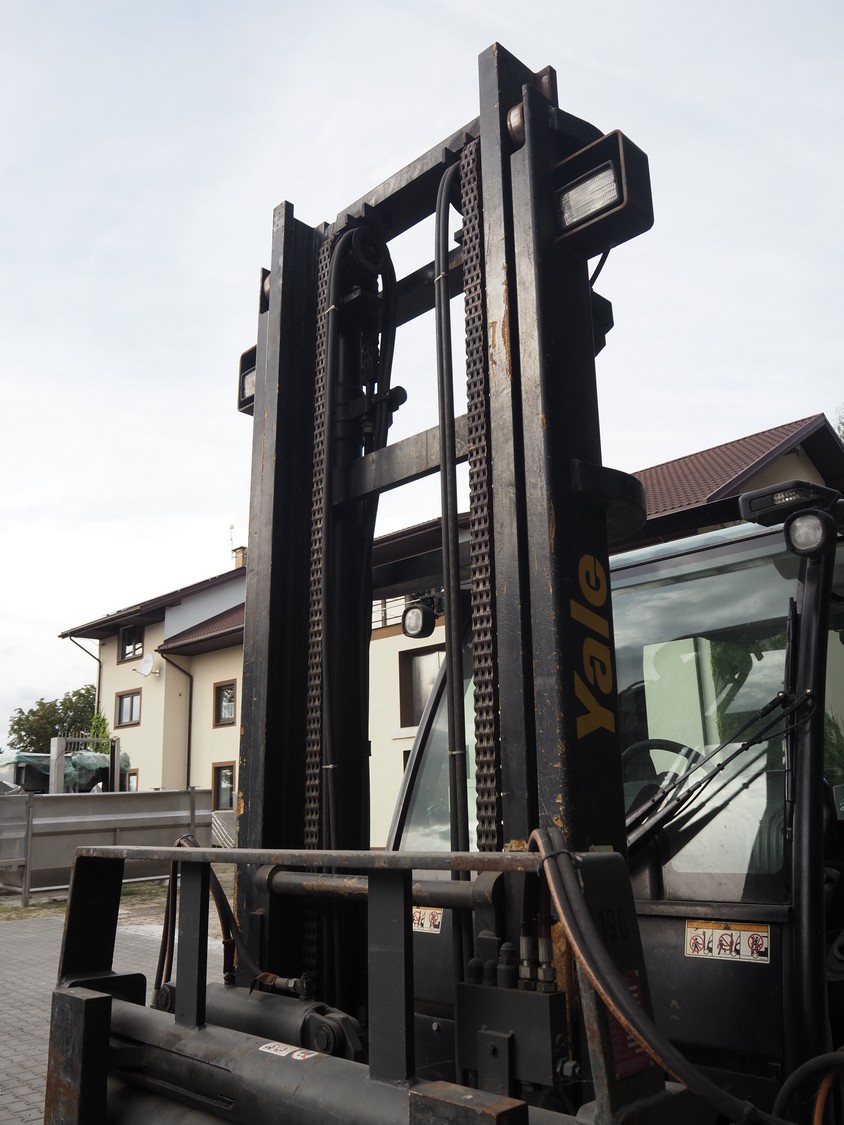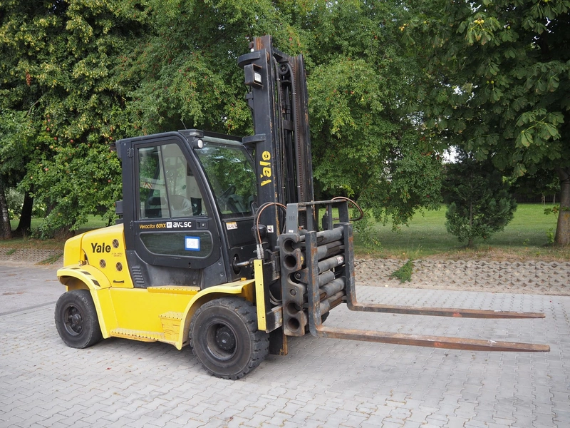 Yale forklift truck, type: GDP60VX, chassis number: D878E0560K, year of construction: 2012, diesel, weight: 8520 kg, capacity: 6000 kg, fork length: 1980 mm, lifting height: 4700 mm, total dimensions: 4800 mm x 2150 mm x 3400 mm.