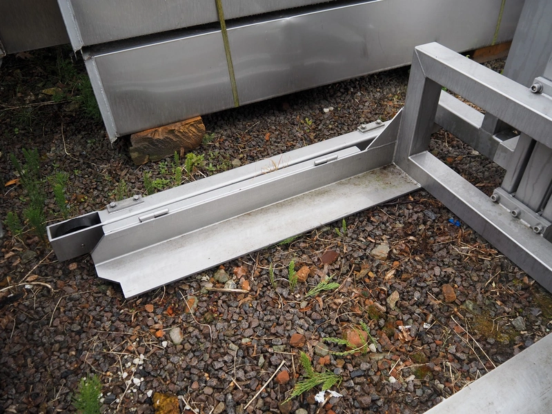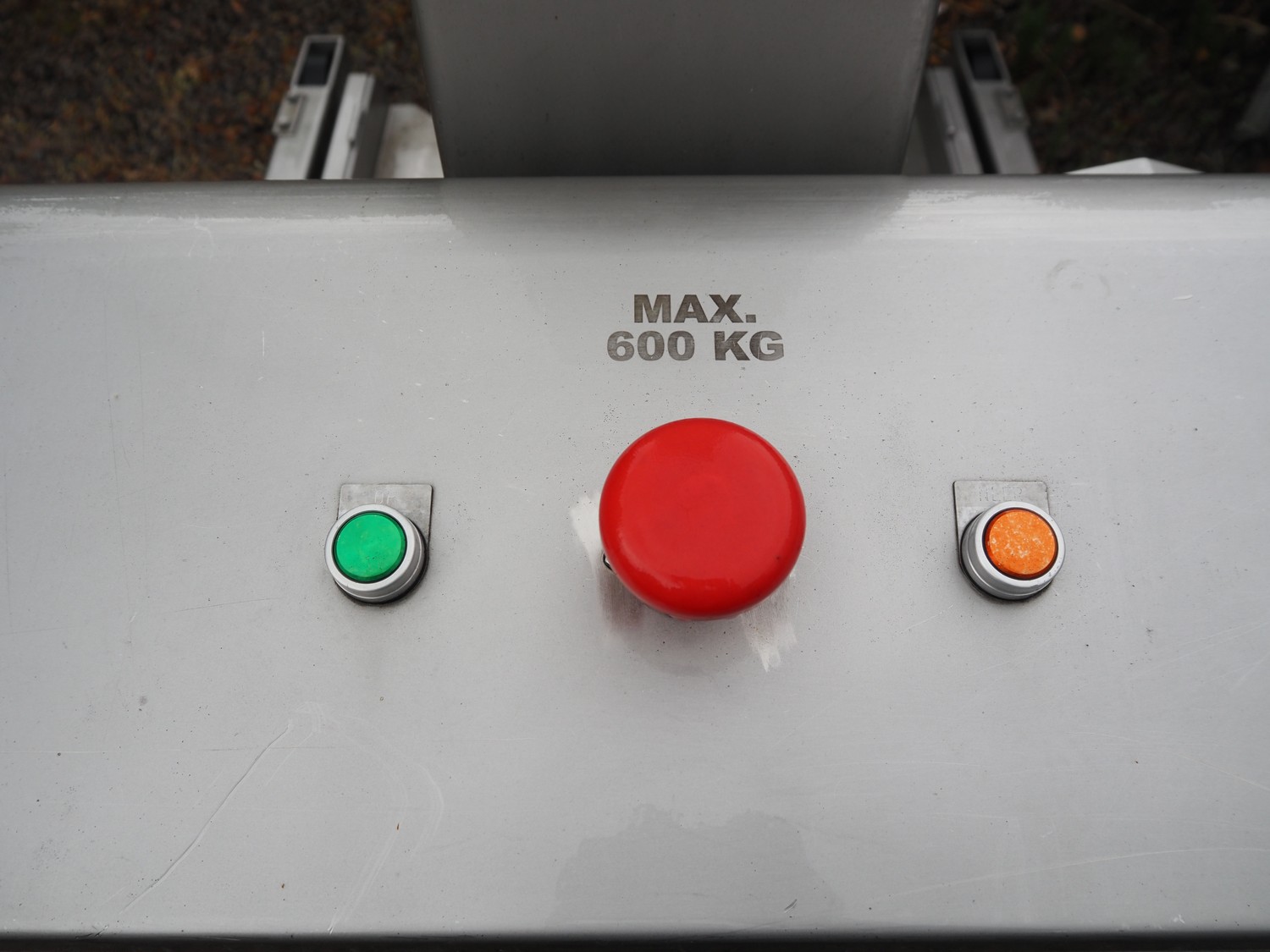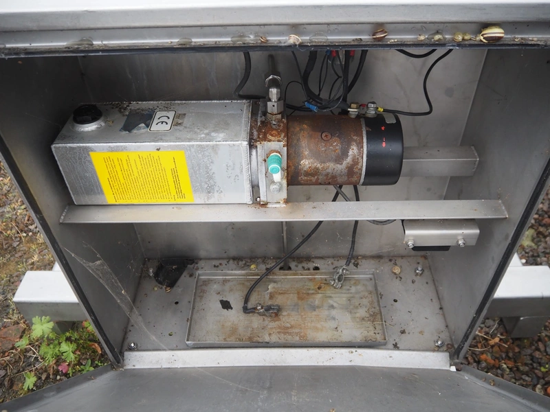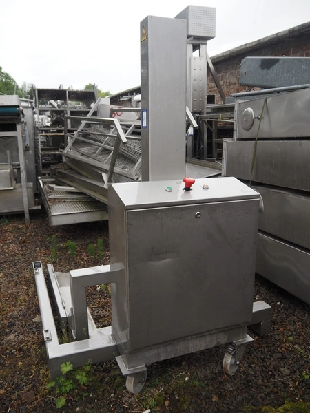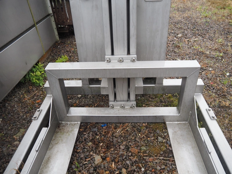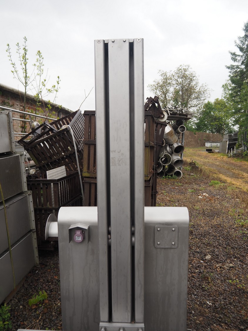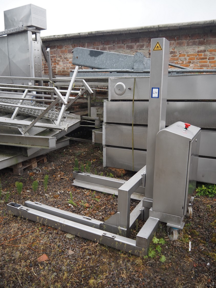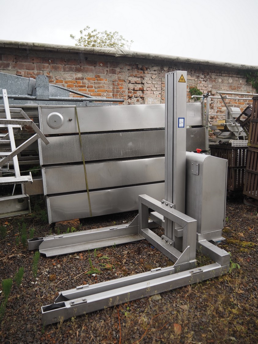Van Oirschot lifting device for pallet boxes, capacity: 600 kg, lifting height: 1400 mm, total dimensions: 2050 mm x 1050 mm x 1900 mm. Incomplete.