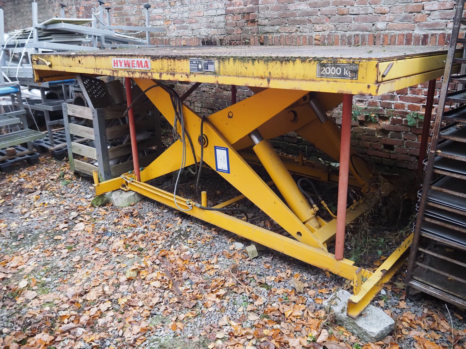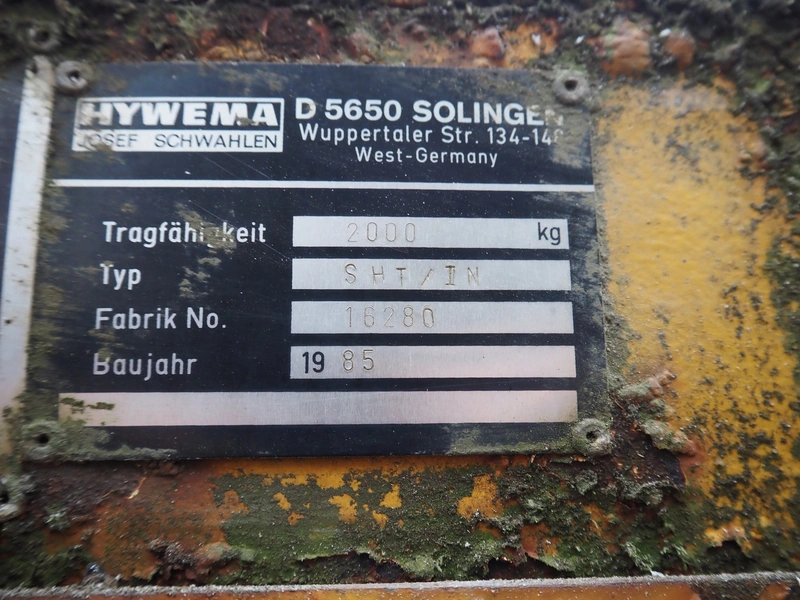 Hywema lifting platform, type: SHT/IN, fabrication number: 16280, year of construction: 1985, capacity: 2000 kg, platform dimensions: 3520 mm x 2000 mm, total dimensions: 3520 mm x 2000 mm x 1300 mm.
