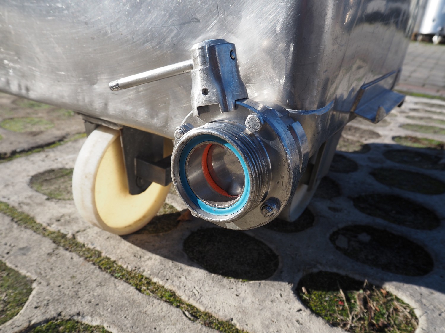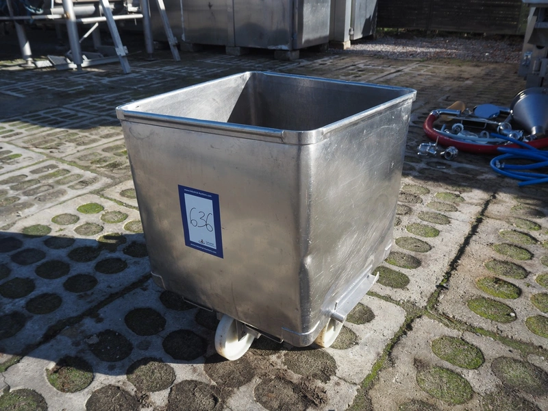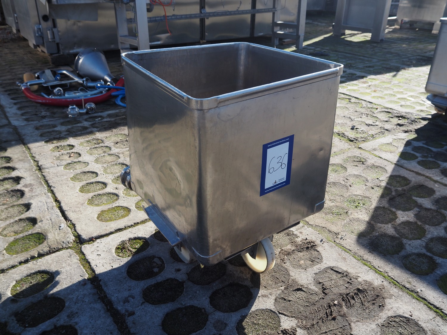 S/s meat bin, volume: 250 liter, total dimensions: 750 mm x 660 mm x 840 mm.