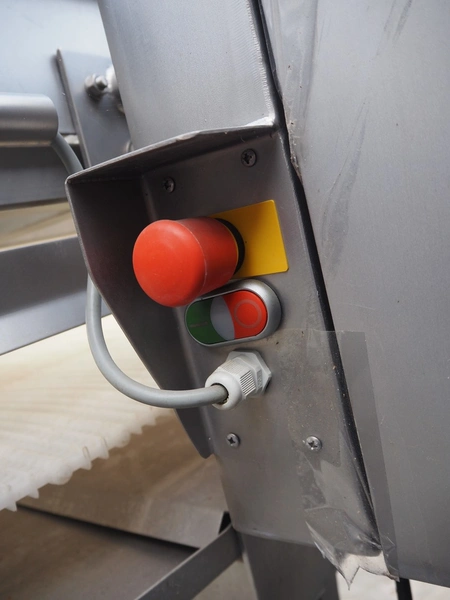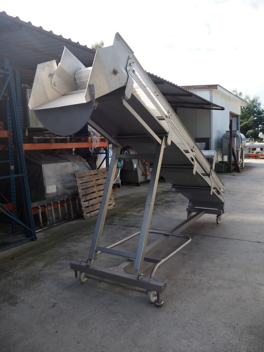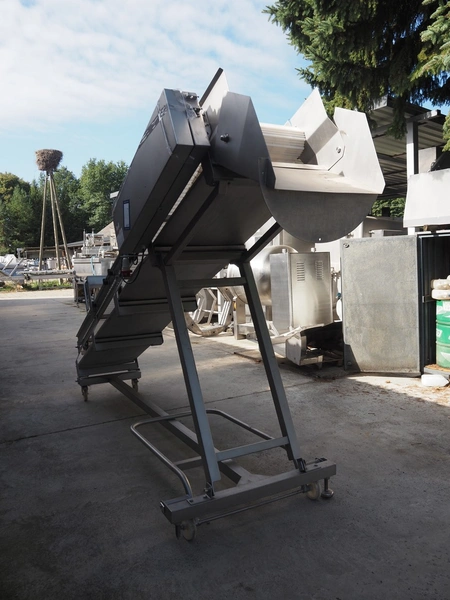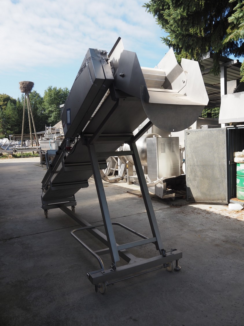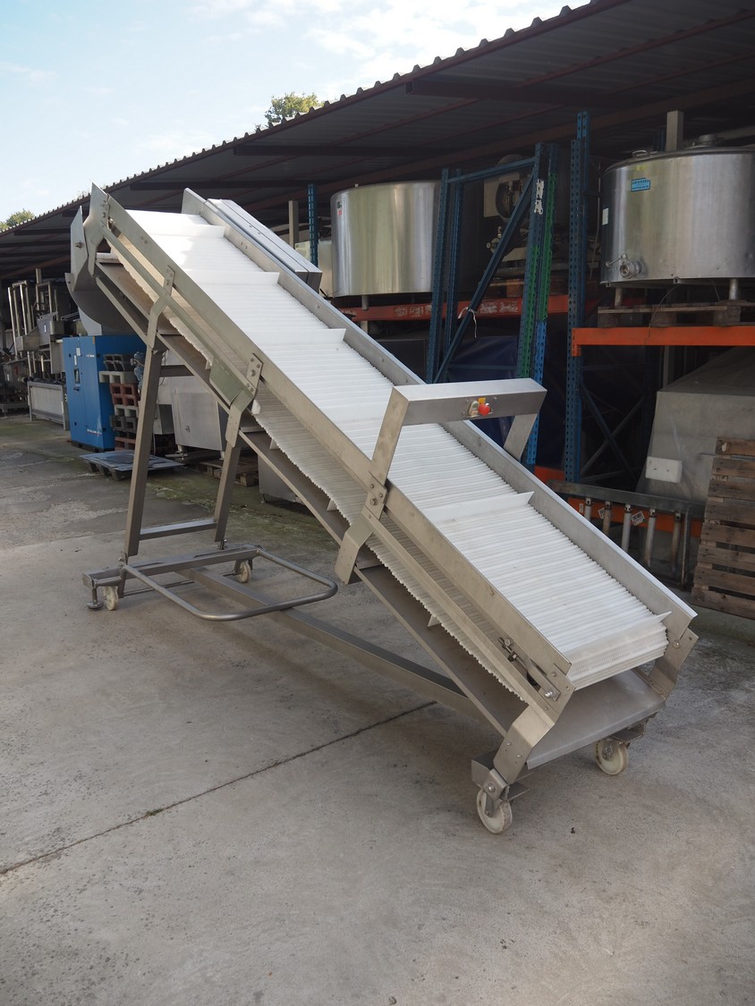 Inject Star mobile elevating belt, type: FL-600, number: FL600-101, year of construction: 2007, 400 V, 3 Ph, 50 Hz, 0.75 kW, plastic mesh belt, belt width: 610 mm, distance between dividers: 705 mm, divider height: 750 mm, elevating height: 2500 mm, total dimensions: 3600 mm x 1220 mm x 2650 mm.