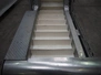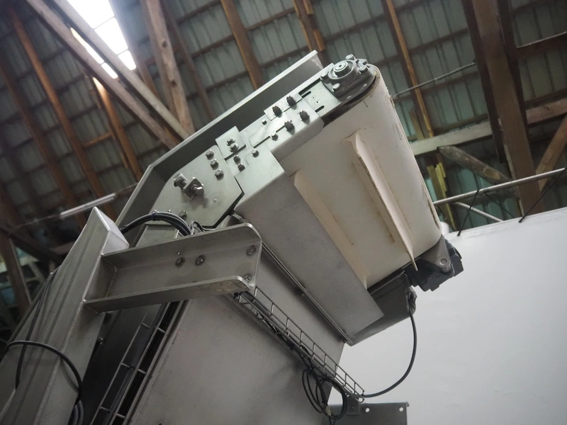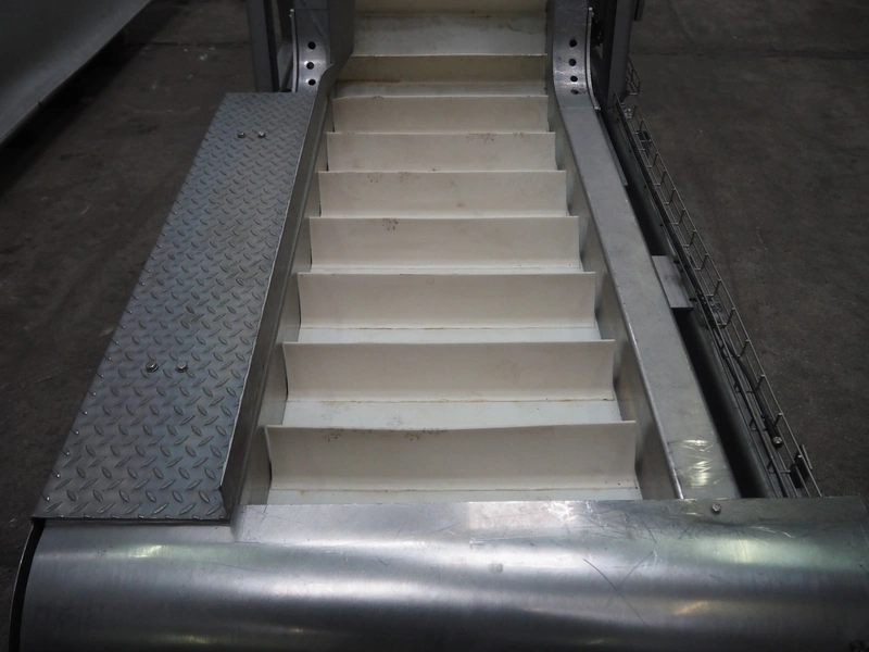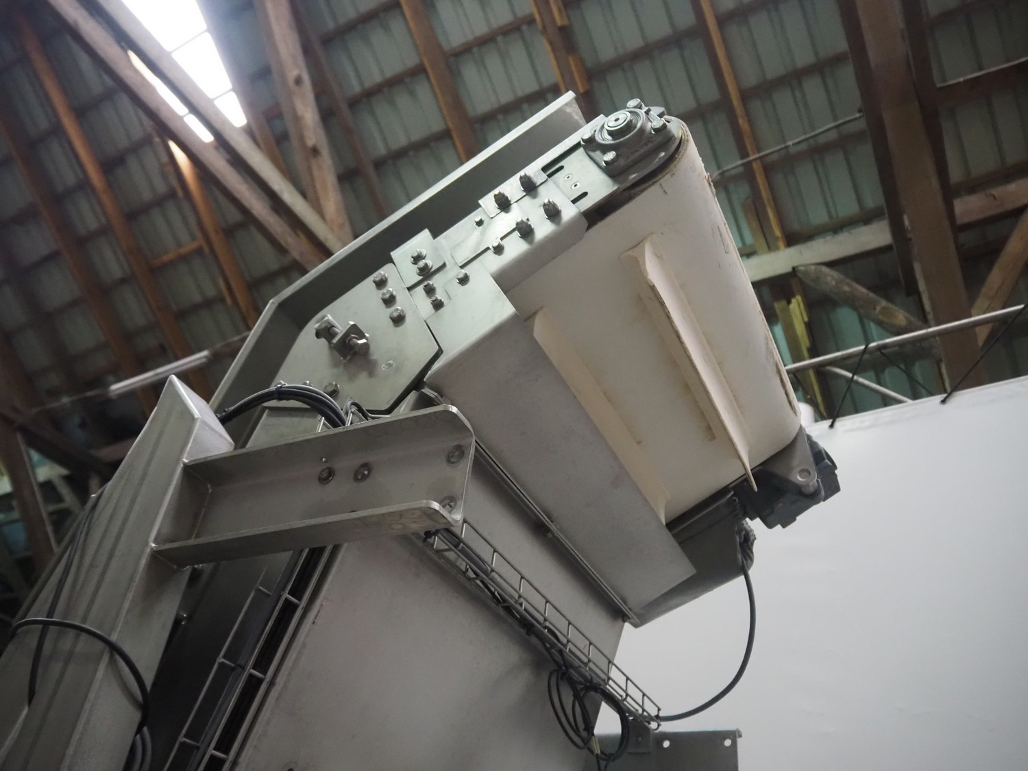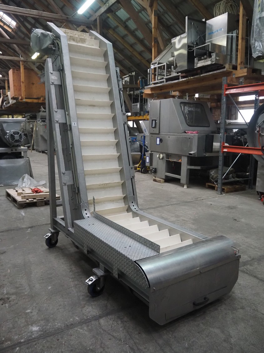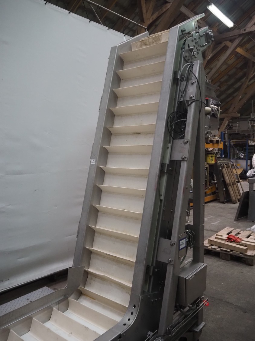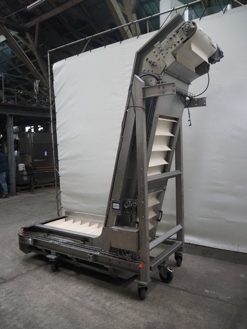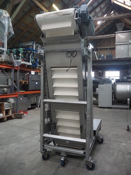 Mobile gooseneck elevating belt, plastic belt width dividers, belt width: 510 mm, divider height: 80 mm, distance between dividers: 160 mm, elevating height: 2500 mm, total dimensions: 2580 mm x 1030 mm x 2550 mm.