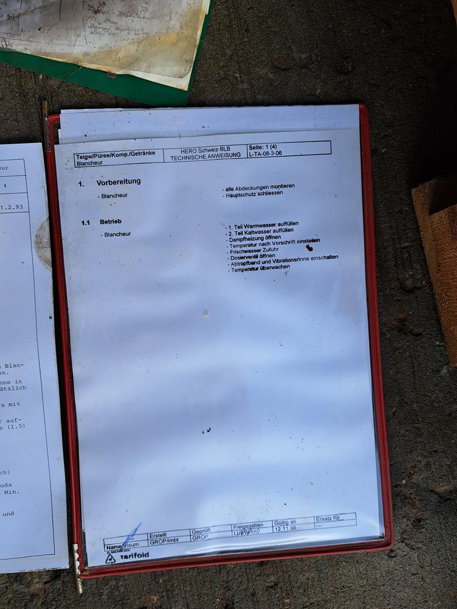 Hero Schweiz BLB blancher, steam heated, dimensions: 3900 mm x 1600 mm x 1800 mm. Including pallet with switch cabinet.