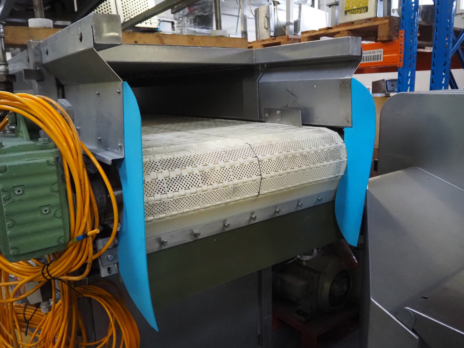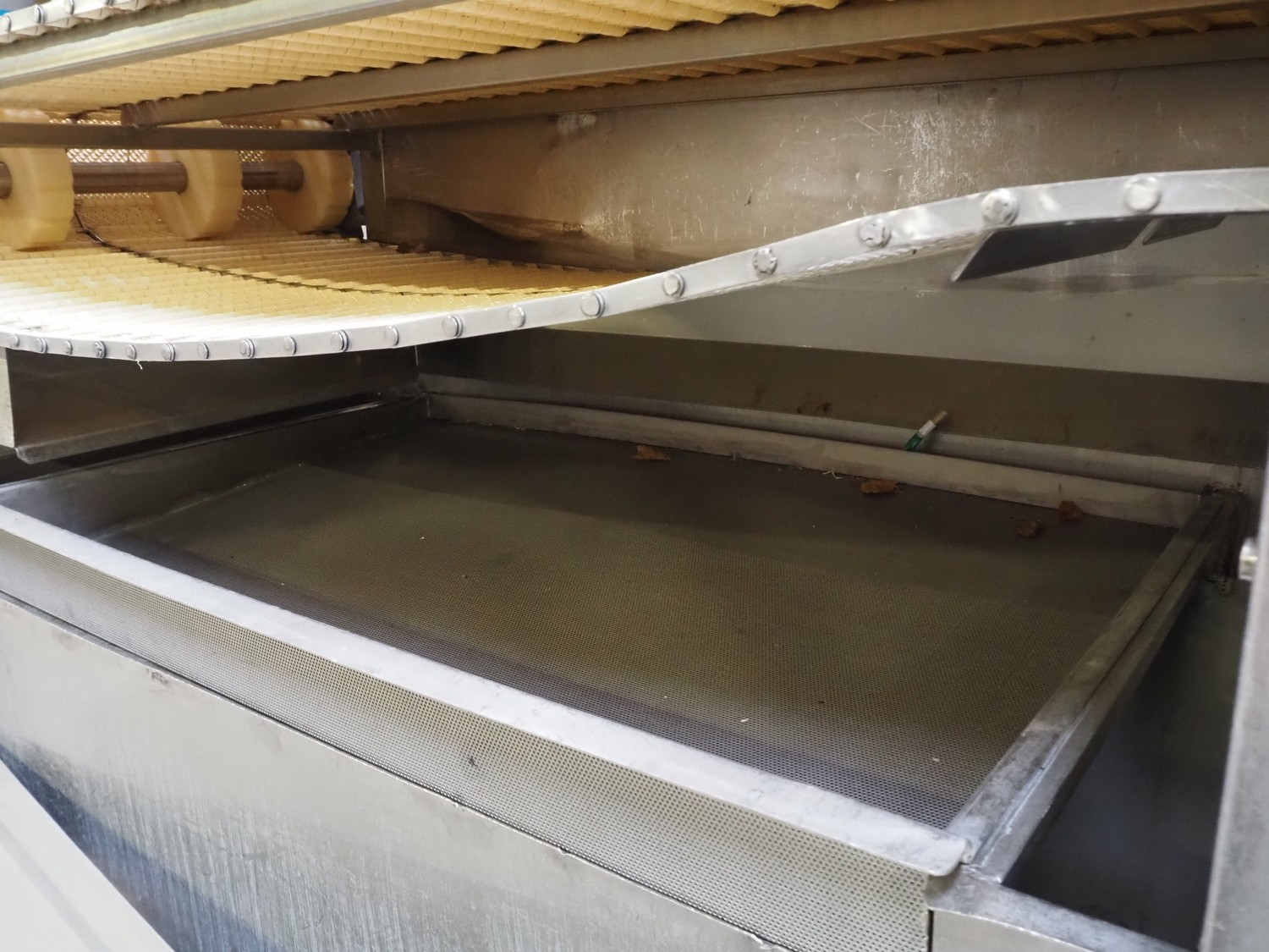 Belt cooler, s/s frame, perforated belt, belt width: 810 mm, diameter perforations: 3 mm, total dimensions: 4000 mm x 1100 mm x 1740 mm.