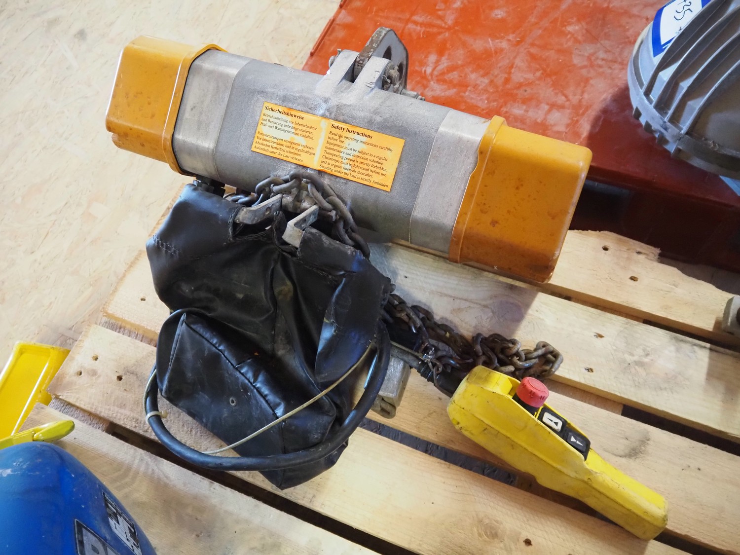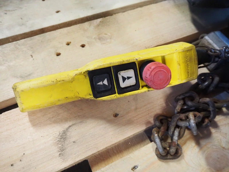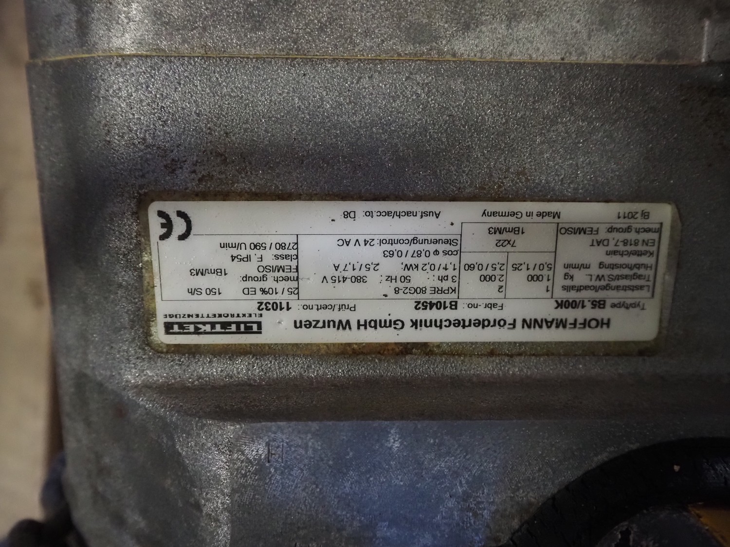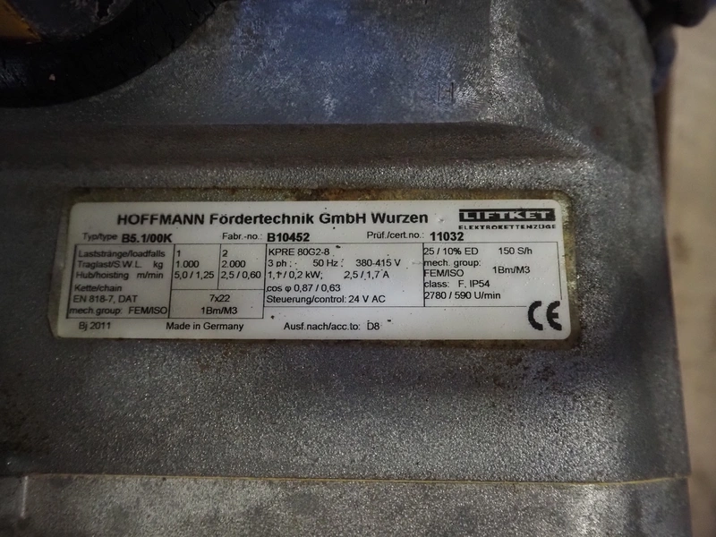 Hoffmann Fördertechnik GmbH Wurzen chain hoist, type: B5.1/00K, fabrication number: B10452, 380-415 V, 3 Ph, 50 Hz, 2.5/1.7 A, 1.1/0.2 kW, capacity: 2000 kg, dimensions: 500 mm x 400 mm x 300 mm.
