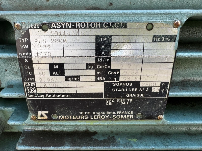 Moteurs Leroy-Somer electric motor, type: PLS 280M, number: 101143/1, 380 V, 3 Ph, 50 Hz, 244 A, 132 kW, 1470 rpm, dimensions: 1200 mm x 800 mm x 900 mm.