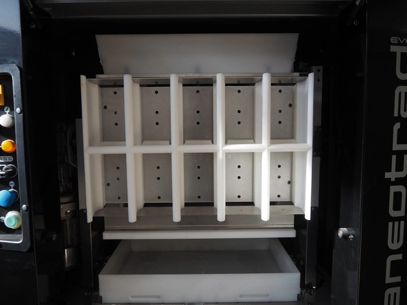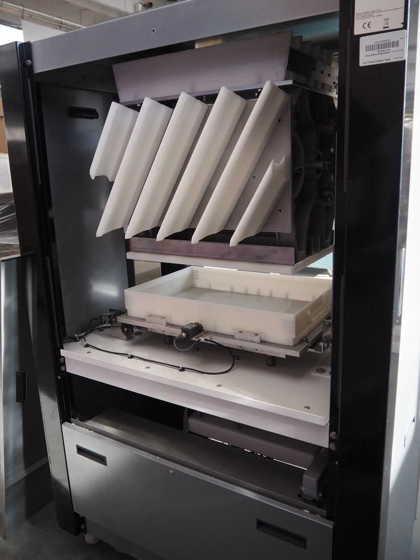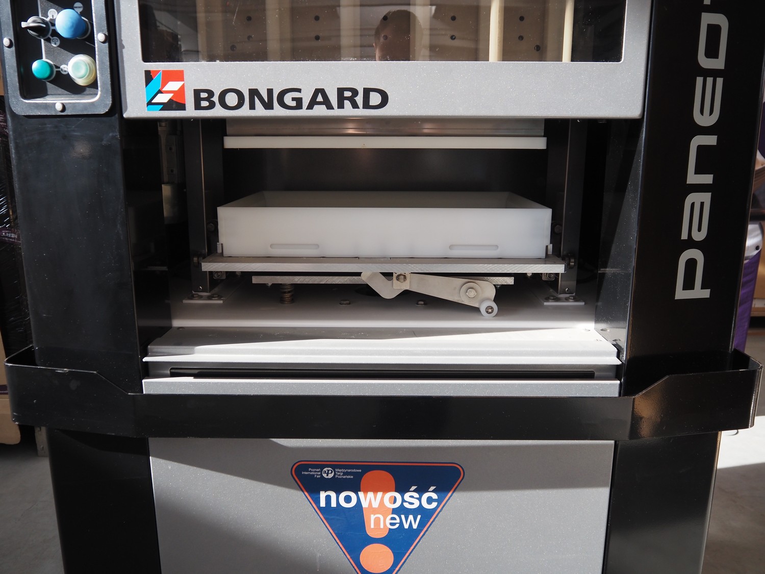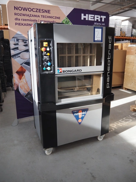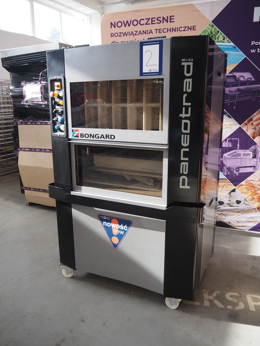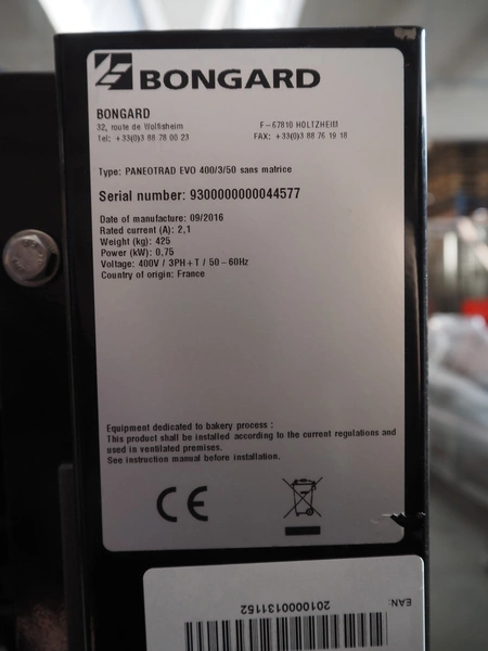 Bongard mobile dough divider, type: Paneotrad EVO, serial number: 9300000000044577, year of construction: 2016, 400 V, 3 Ph, 50-60 Hz, 2.1 A, 0.75 kW, weight: 425 kg, dimensions form: 580 mm x 380 mm x 80 mm, total dimensions: 1250 mm x 900 mm x 1800 mm. Never used.