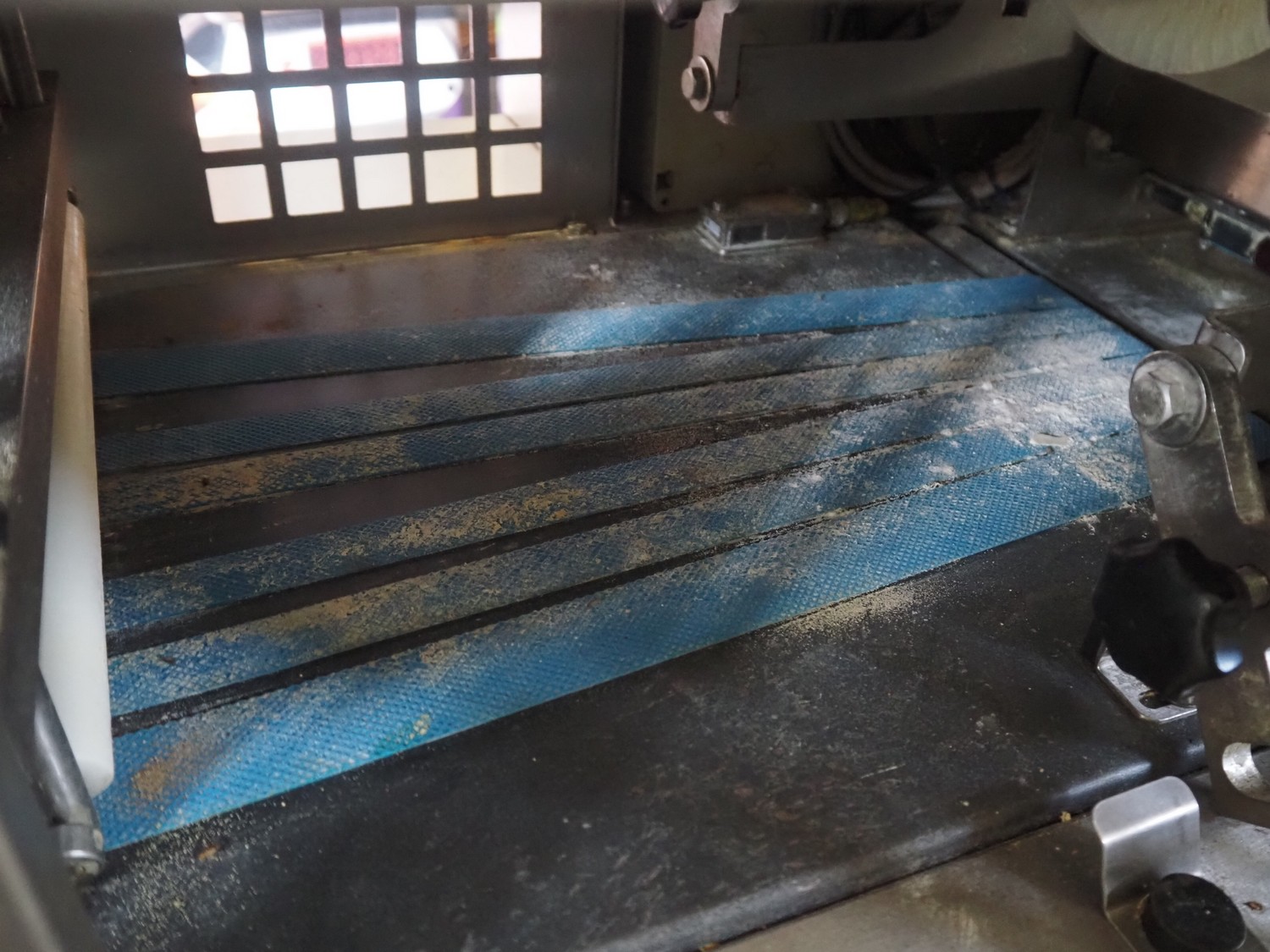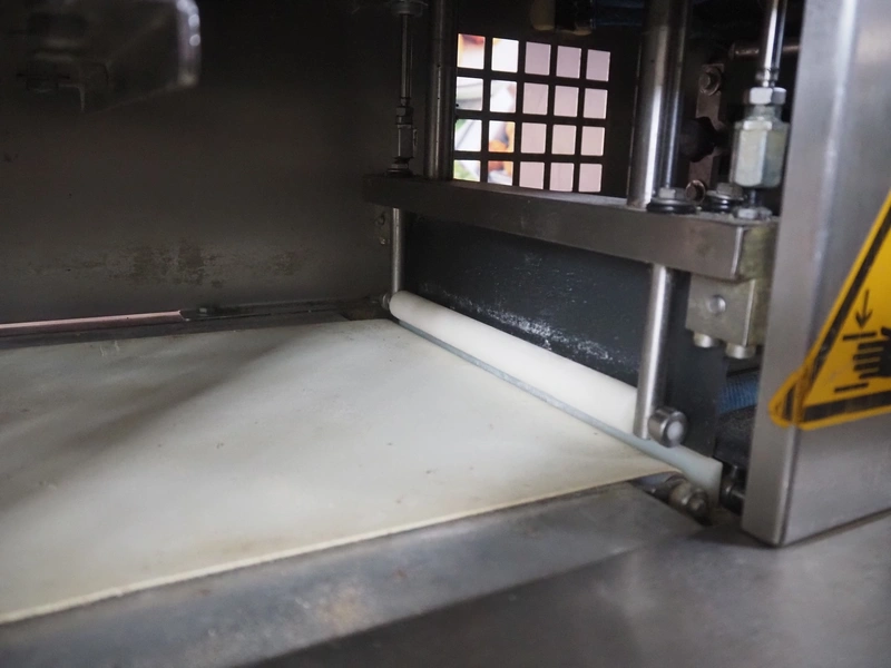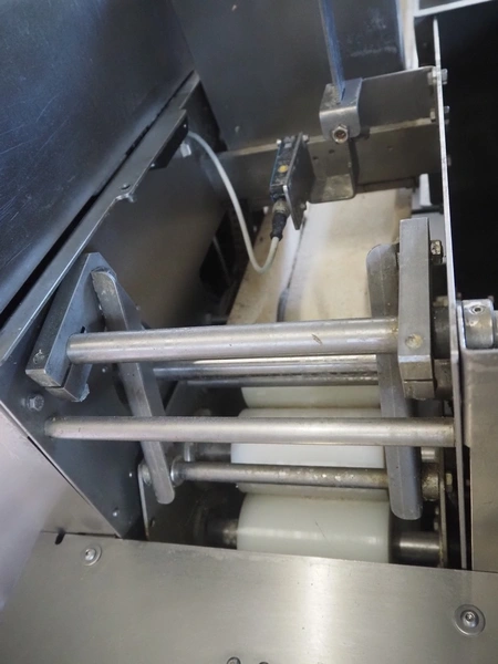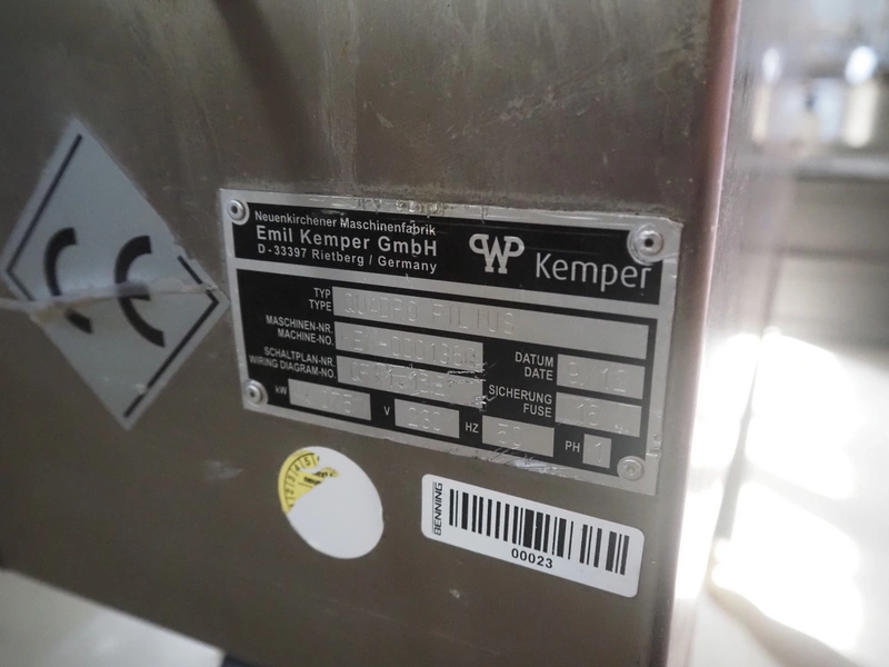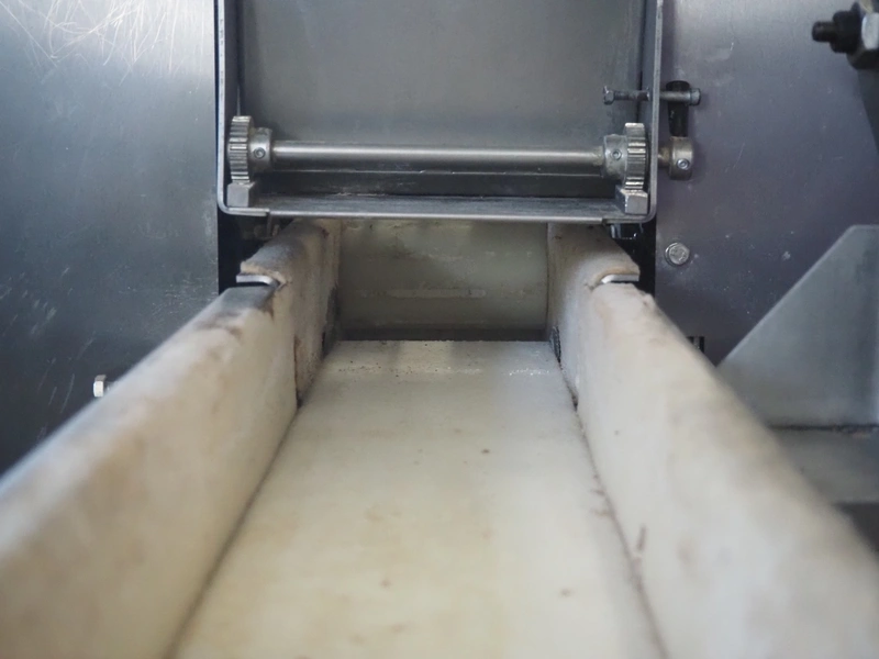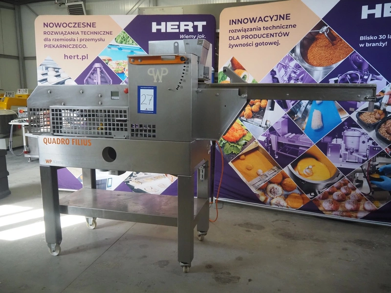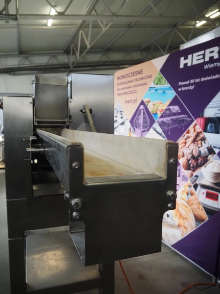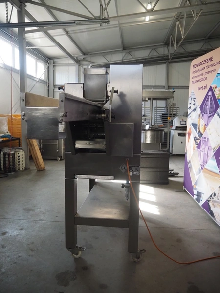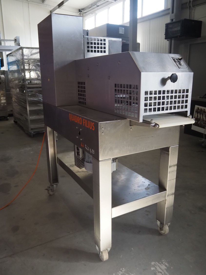 Emil Kemper GmbH dough divider, type: Quadro Filius, machine number: E-0001360, year of construction: 2012, 230 V, 1 Ph, 50 Hz, plastic belt, belt width: 130 mm, 300 mm, clearance: 130 mm x 90 mm, dimensions funnel: 190 mm x 150 mm x 240 mm, brush width: 190 mm, knife width: 300 mm, plastic rollers, roller width: 135 mm, total dimensions: 2700 mm x 700 mm x 1800 mm.
