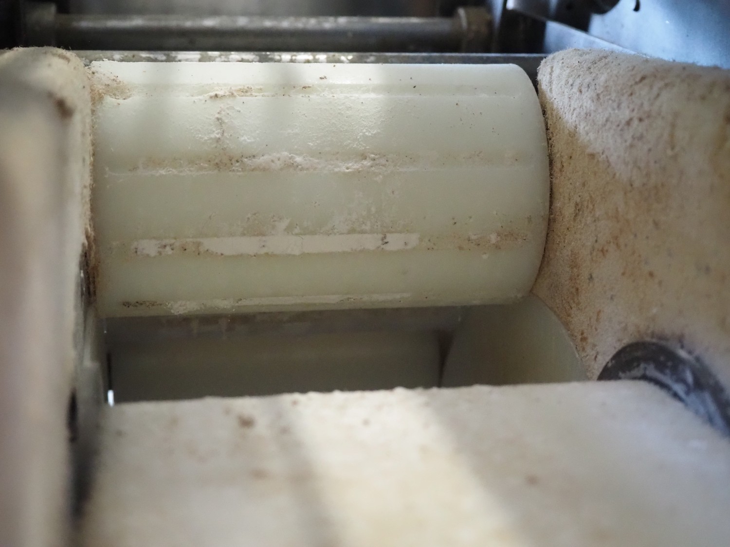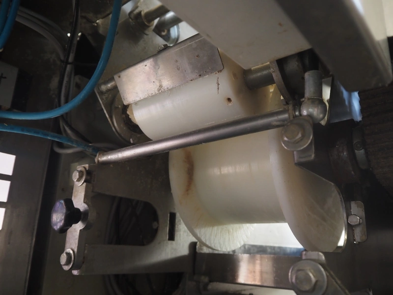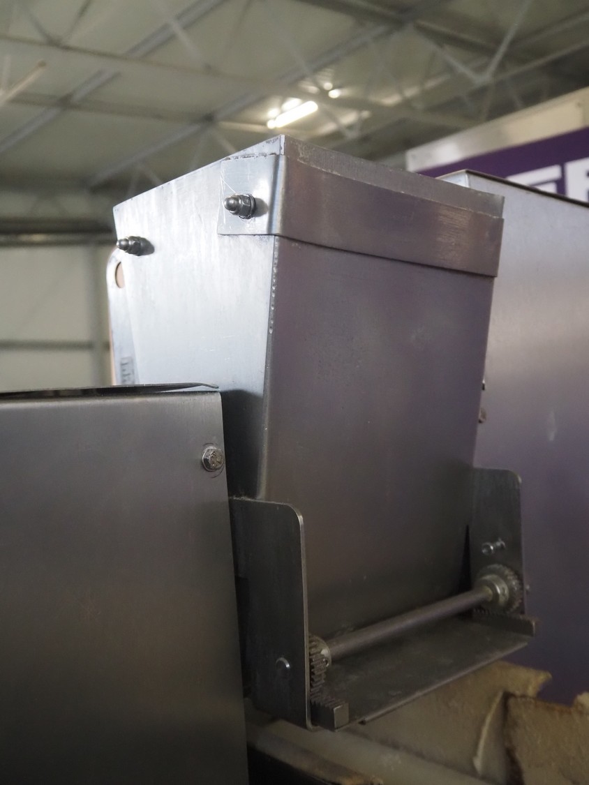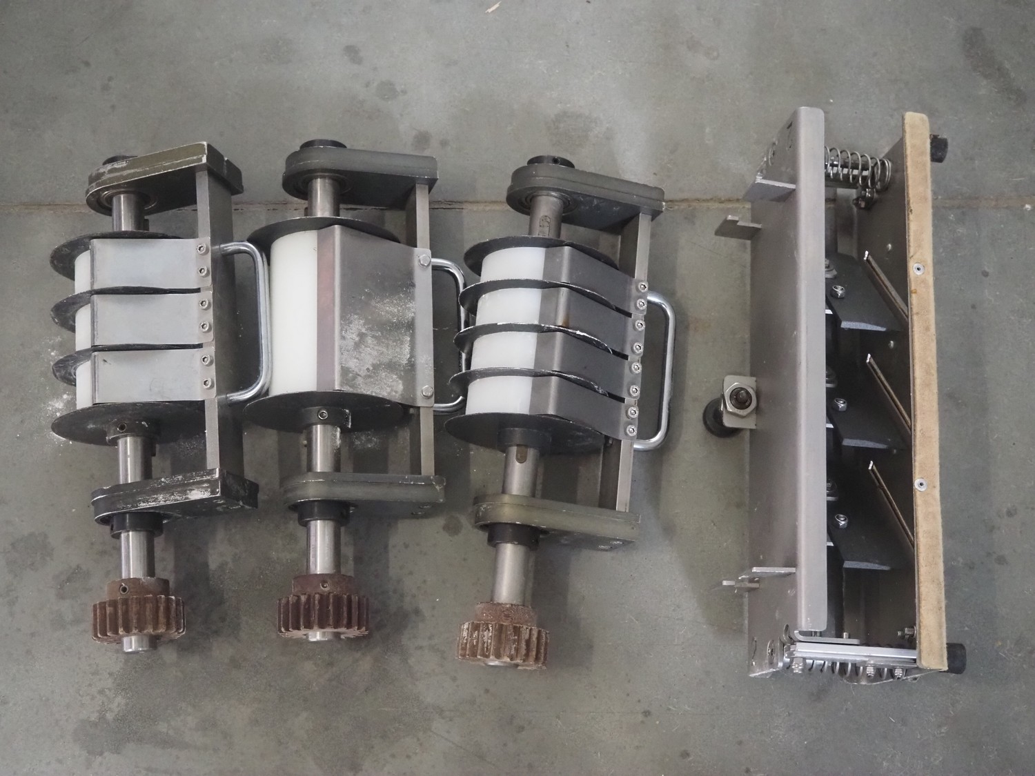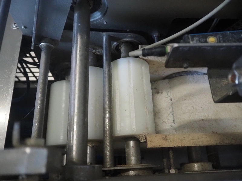 Emil Kemper GmbH dough divider, type: Quadro Filius, machine number: E-0001360, year of construction: 2012, 230 V, 1 Ph, 50 Hz, plastic belt, belt width: 130 mm, 300 mm, clearance: 130 mm x 90 mm, dimensions funnel: 190 mm x 150 mm x 240 mm, brush width: 190 mm, knife width: 300 mm, plastic rollers, roller width: 135 mm, total dimensions: 2700 mm x 700 mm x 1800 mm.