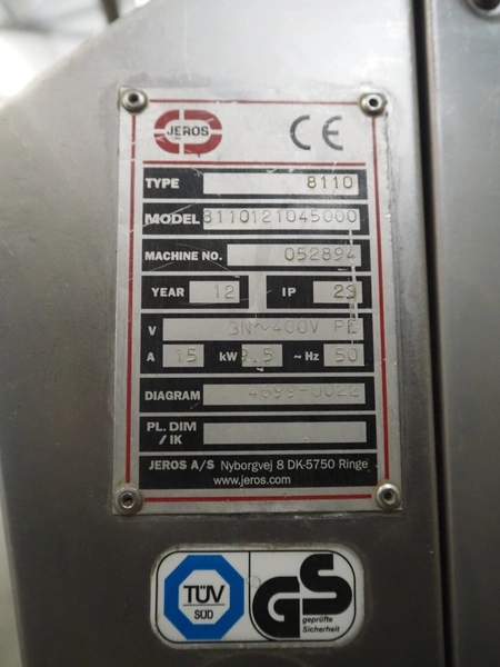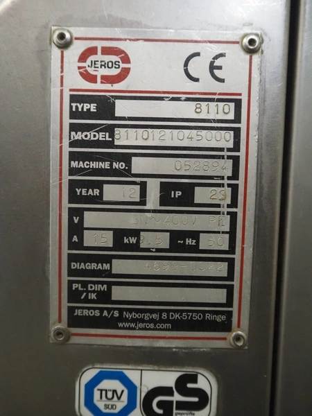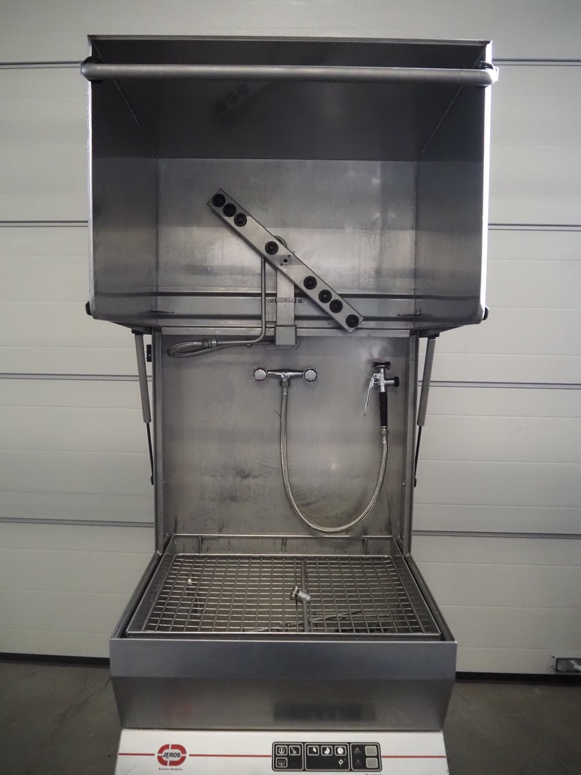 Jeros dishwasher, type: 8110, model: 8110121045000, machine number: 052894, year of construction: 2012, 400 V, 3 Ph, 50 Hz, 15 A, 9.5 kW, inside dimensions: 690 mm x 630 mm, total dimensions: 900 mm x 900 mm x 1650 mm.