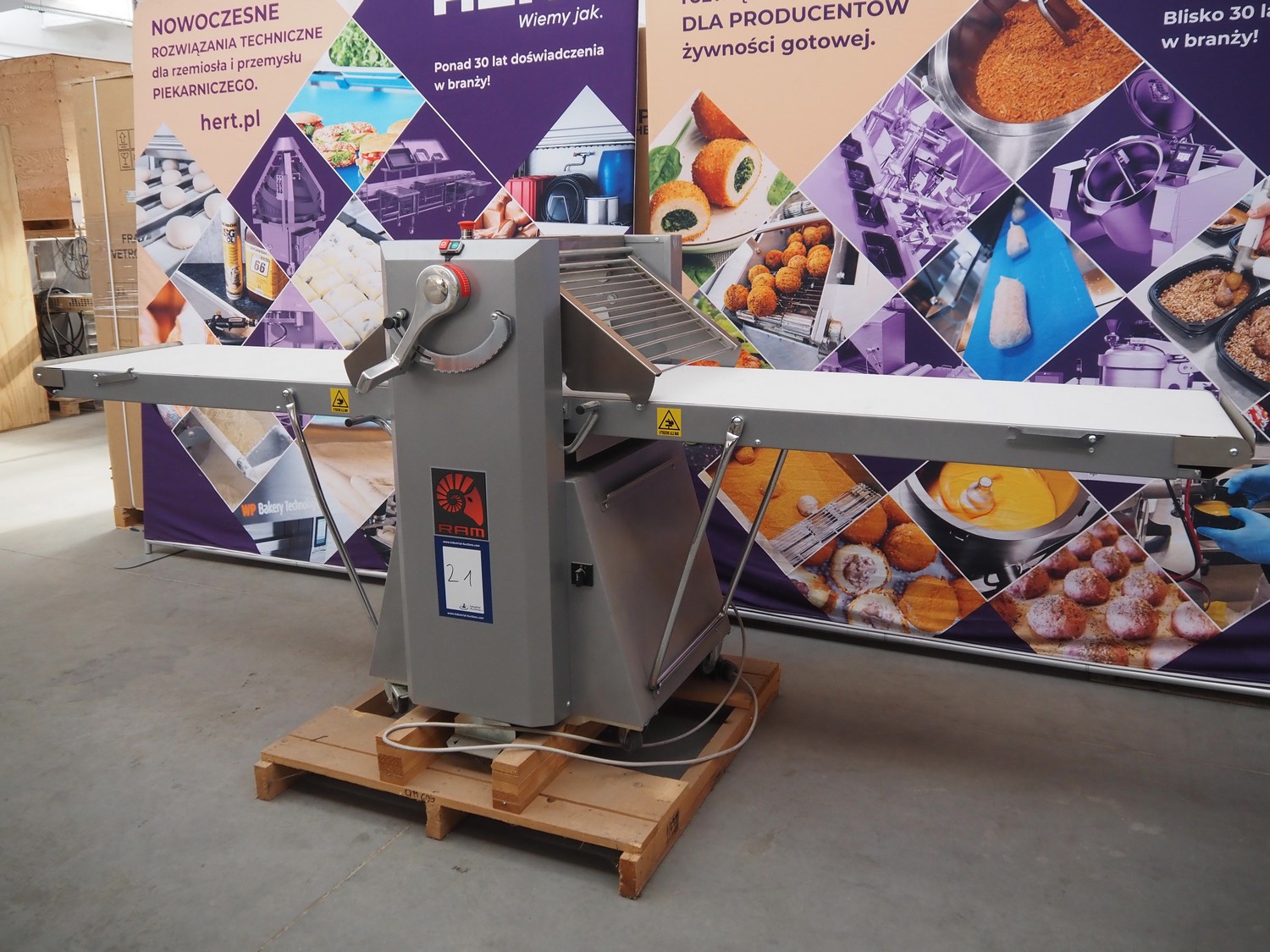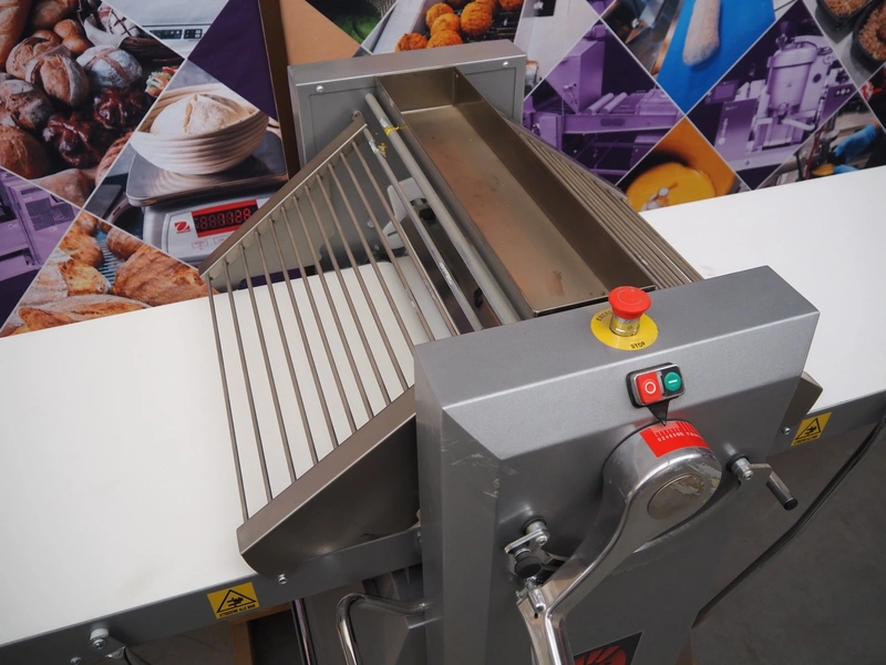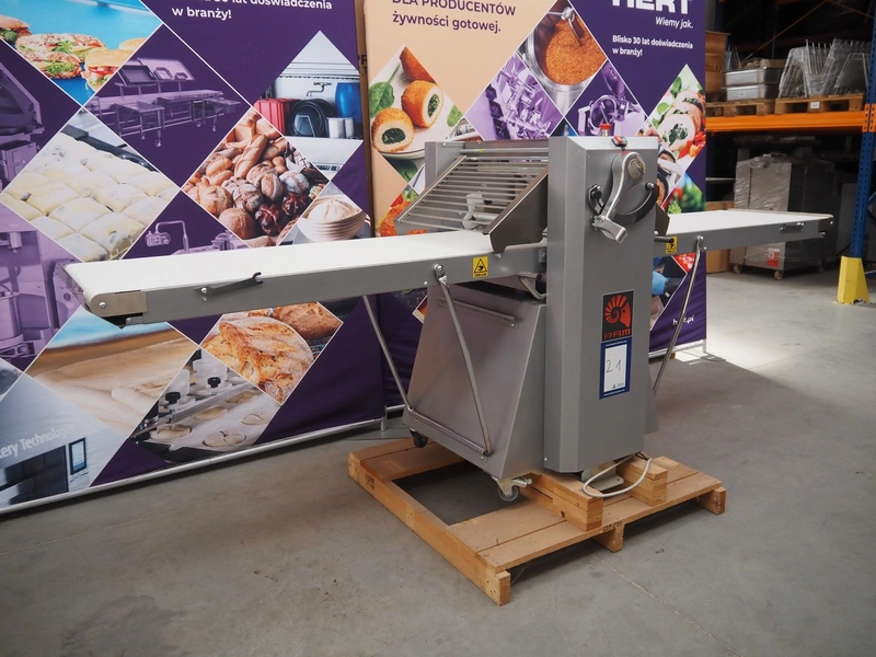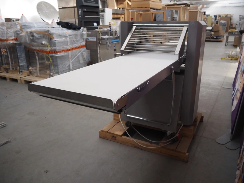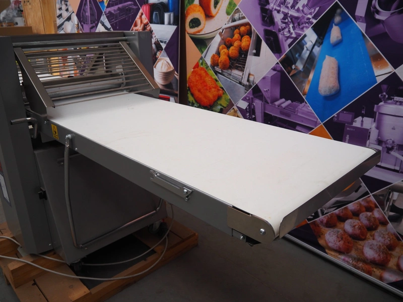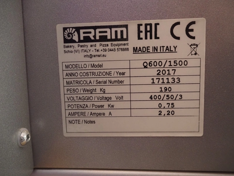 Ram dough sheeter, model: Q600/1500, serial number: 171133, year of construction: 2017, 400 V, 3 Ph, 50 Hz, 2.2 A, 0.75 kW, weight: 190 kg, plastic belt, belt width: 580 mm, working width: 600 mm, total dimensions: 3200 mm x 1100 m x 1300 mm. Never used.
