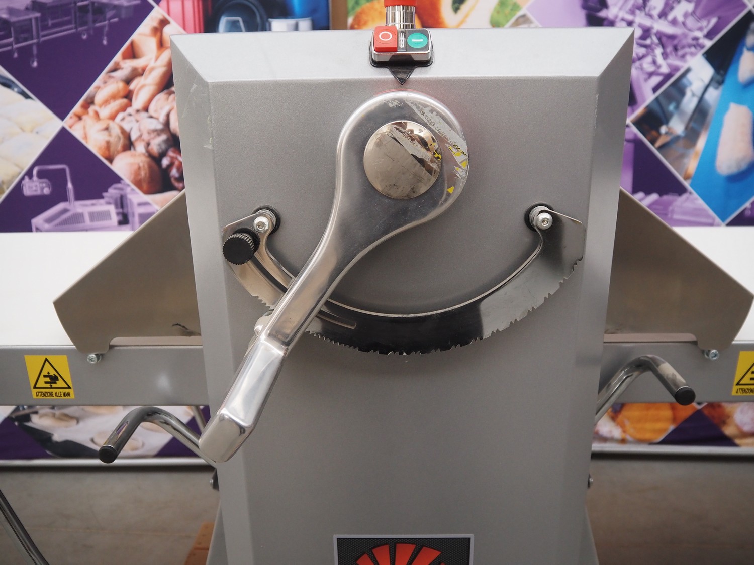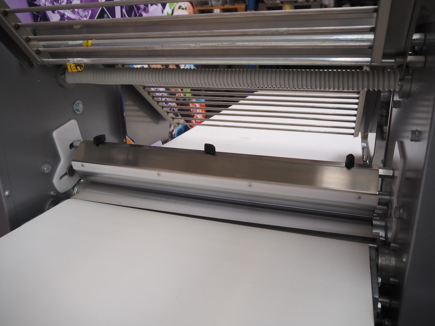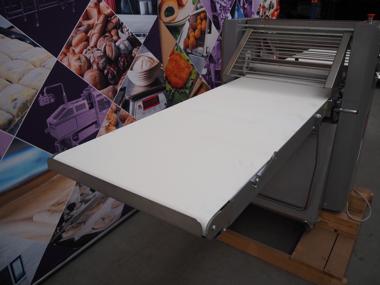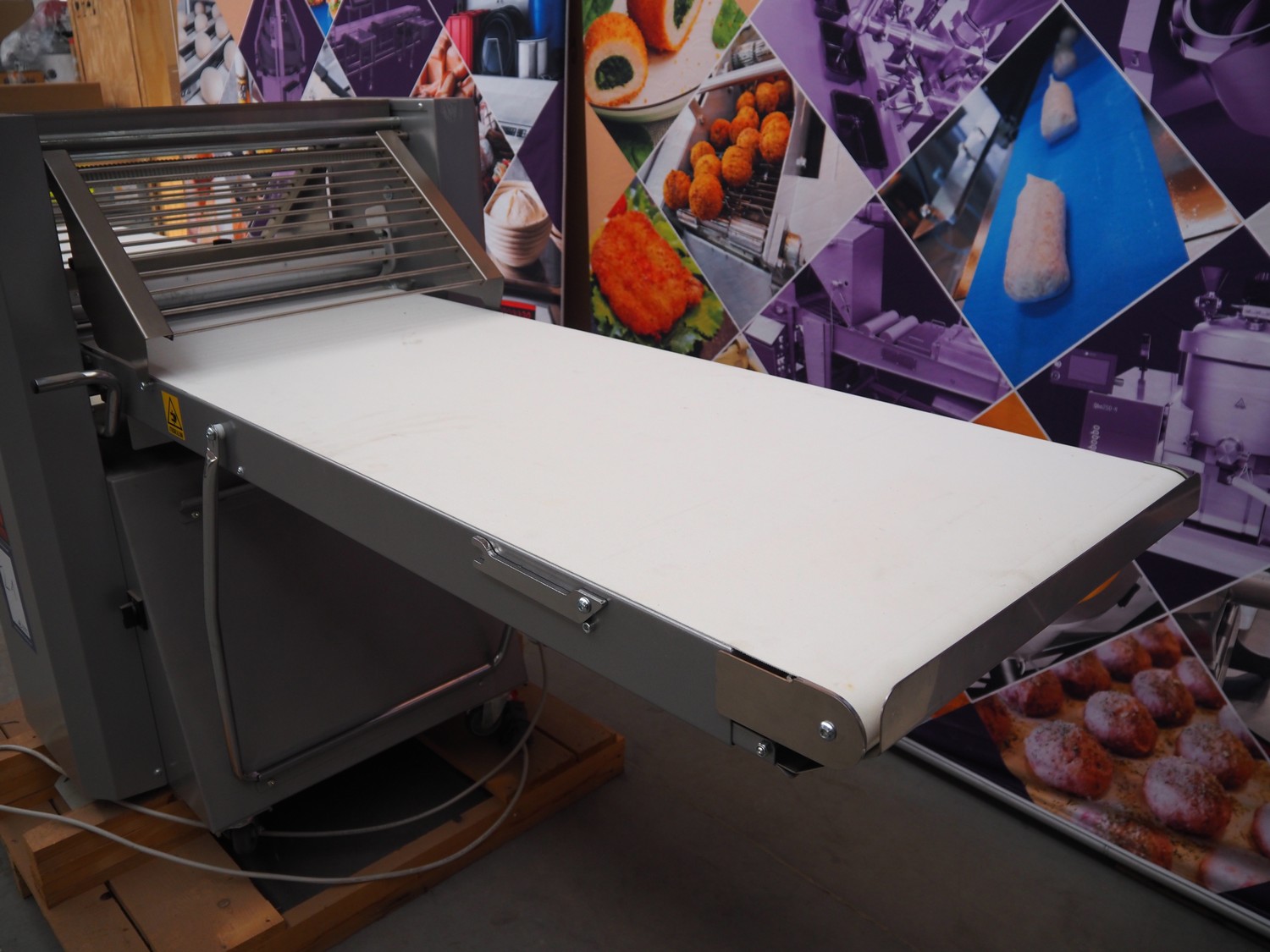Ram dough sheeter, model: Q600/1500, serial number: 171133, year of construction: 2017, 400 V, 3 Ph, 50 Hz, 2.2 A, 0.75 kW, weight: 190 kg, plastic belt, belt width: 580 mm, working width: 600 mm, total dimensions: 3200 mm x 1100 m x 1300 mm. Never used.