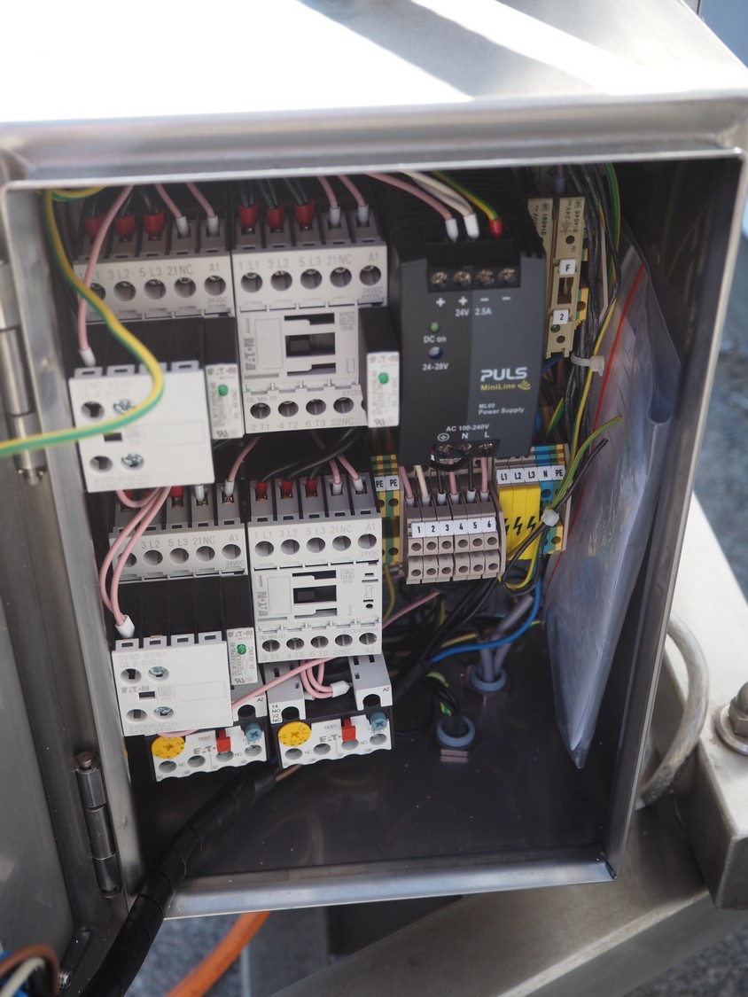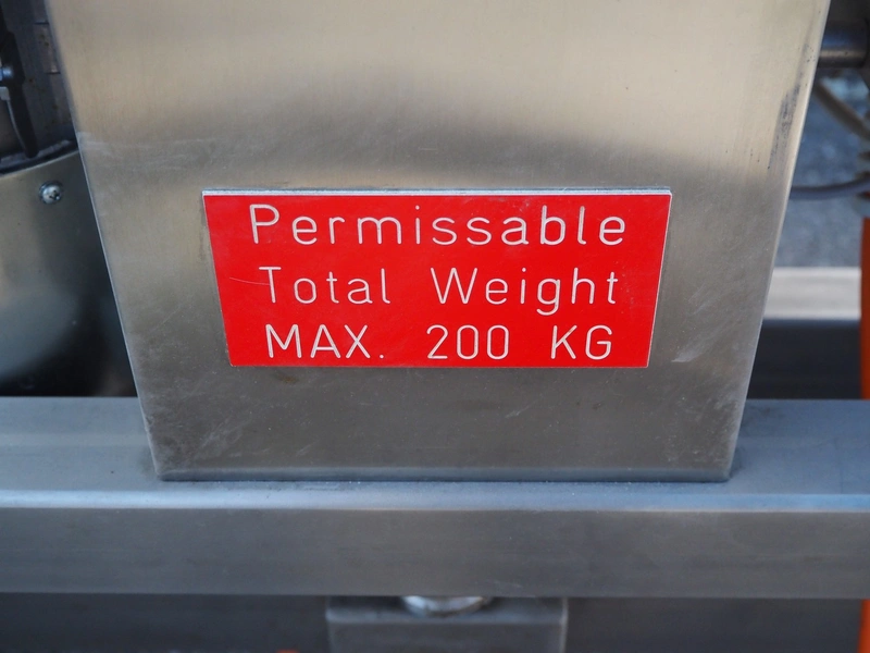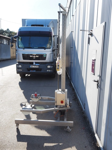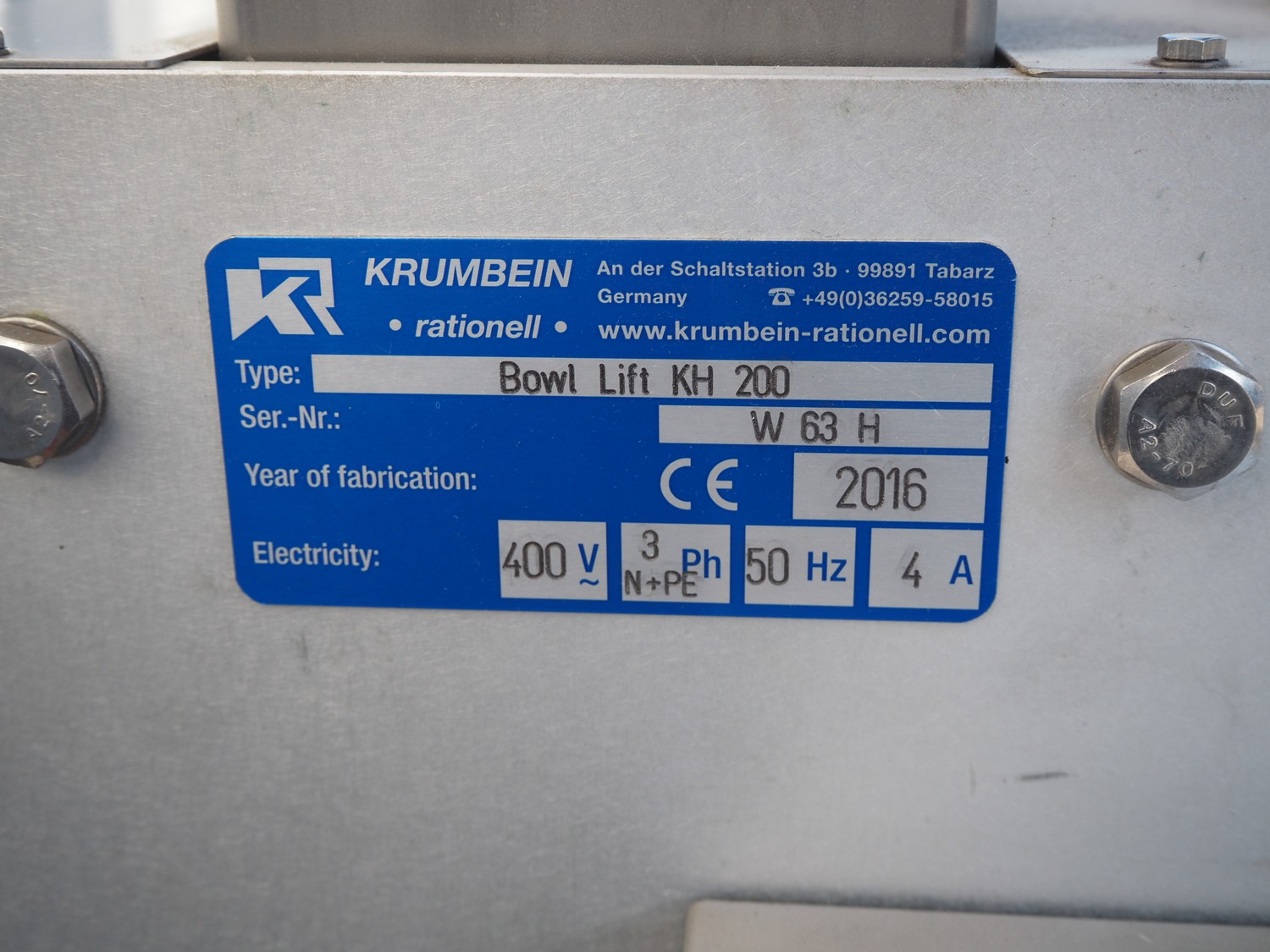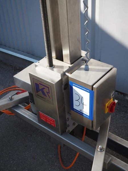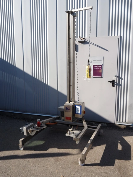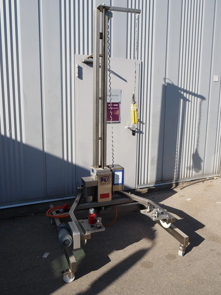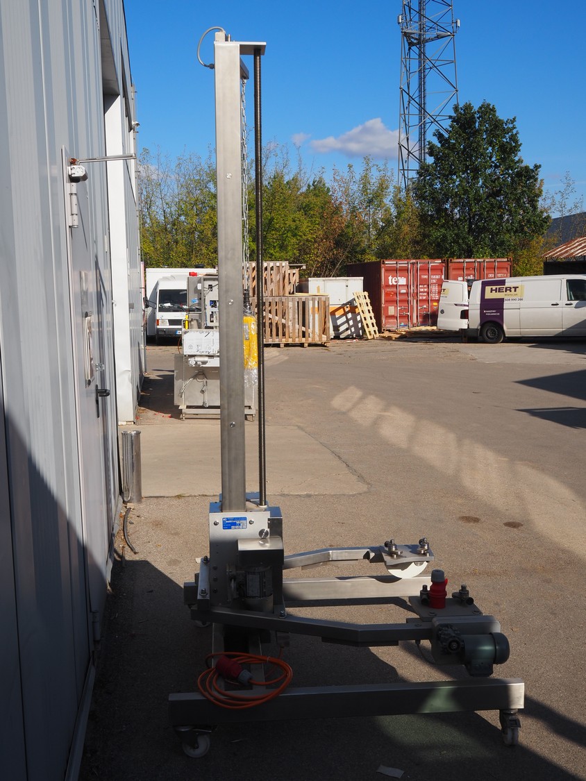 Krumbein mobile lifter for 100 liter bowls, type: Bowl Lift KH 200, serial number: W 63 H, year of construction: 2016, 400 V, 3 Ph, 50 Hz, 4 A, lifting height: 2200 mm, total dimensions: 1300 mm x 1250 mm x 2700 mm. Never used.