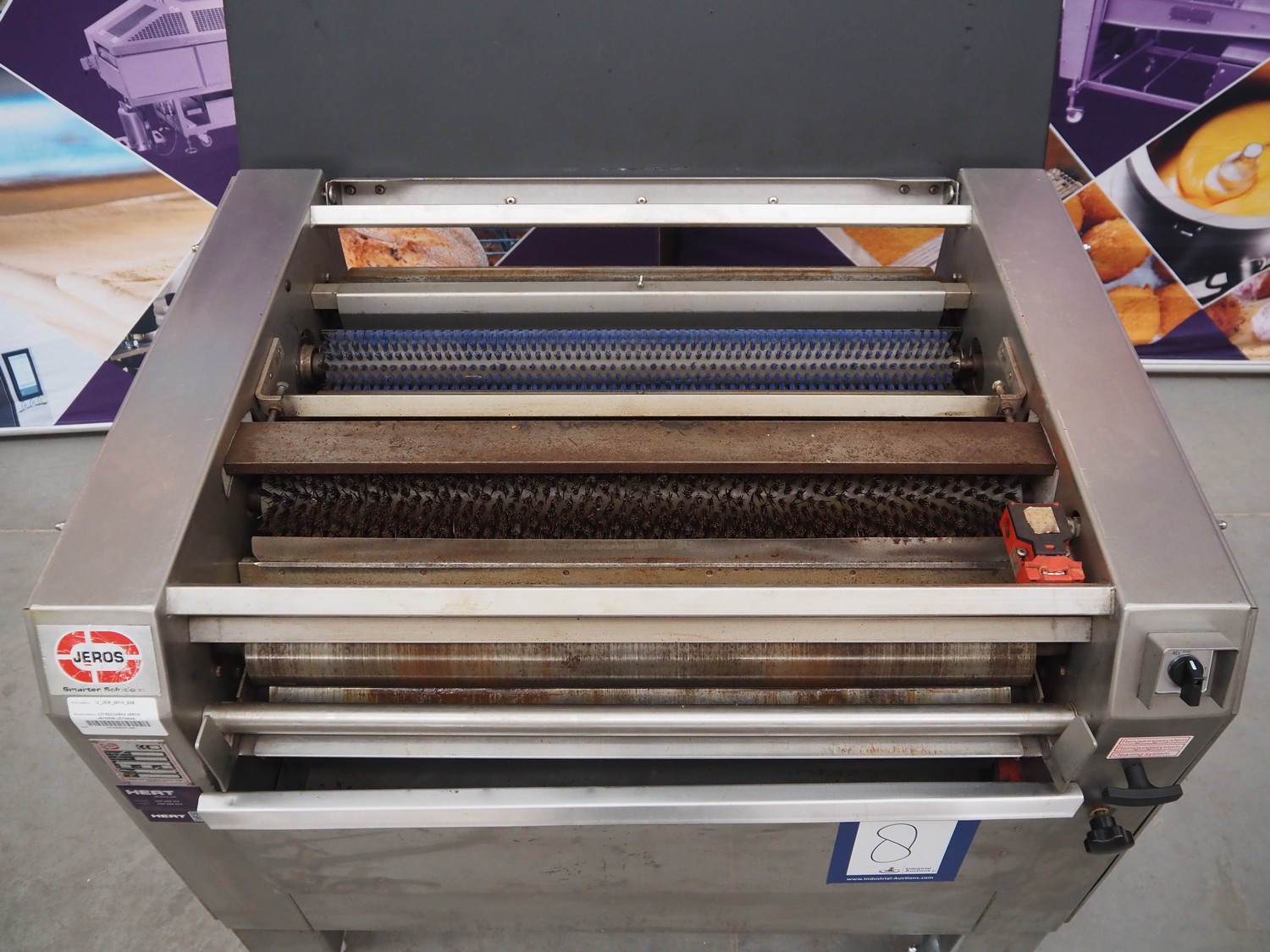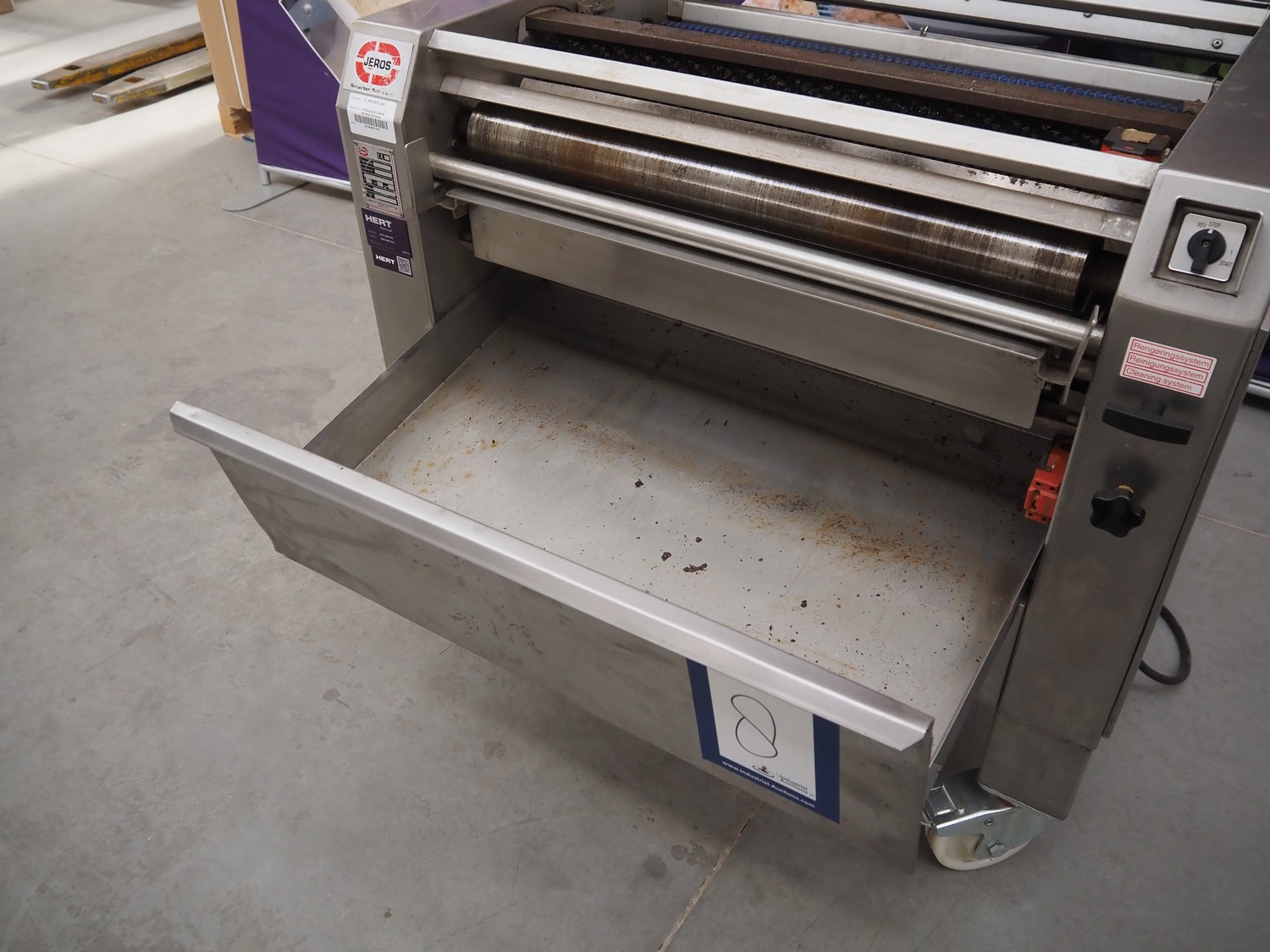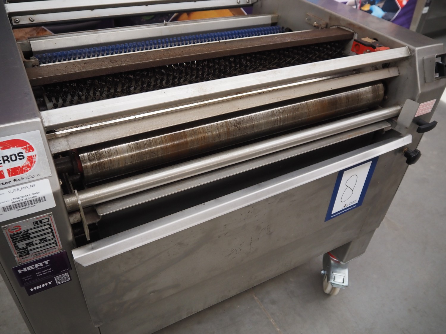 Jeros mobile baking tray cleaner, type: 6015/828, machine number: 090786, year of construction: 2009, 400 V, 3 Ph, 50 Hz, 3.4 A, 1.5 kW, brush length: 780 mm, total dimensions: 1100 mm x 730 mm x 1000 mm.
