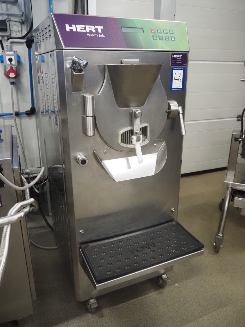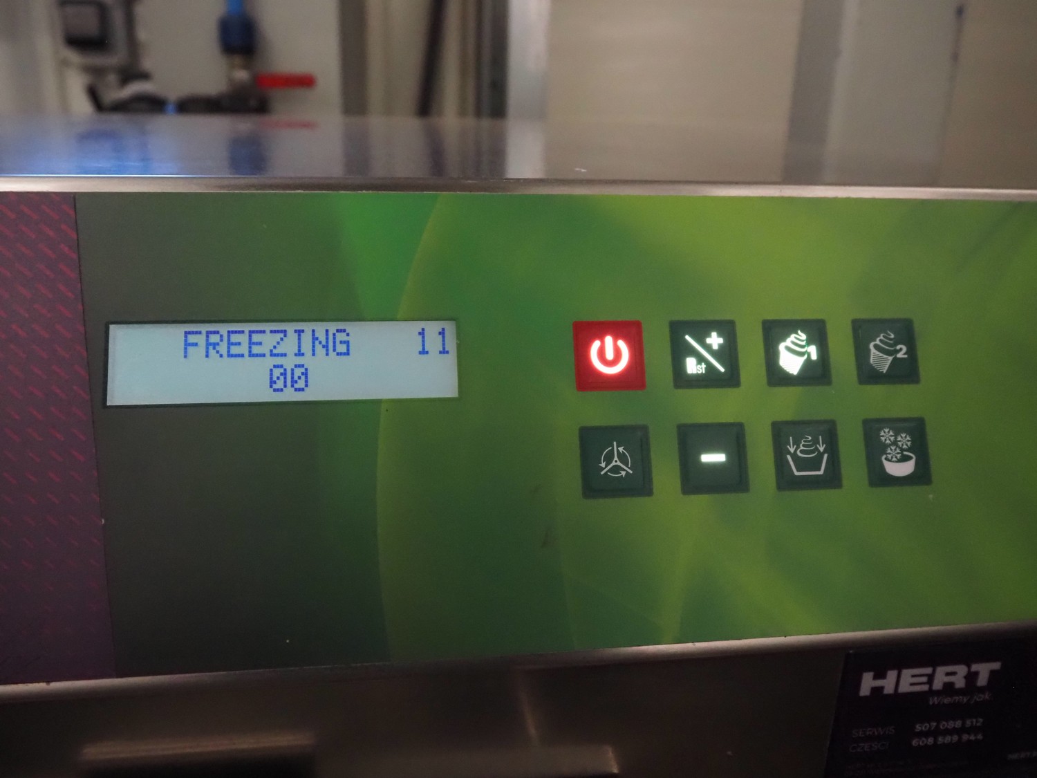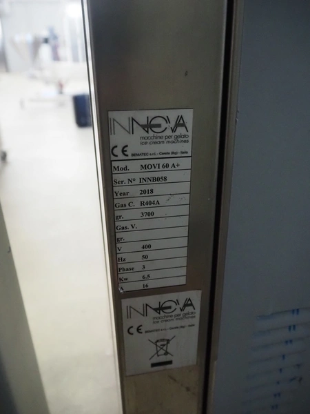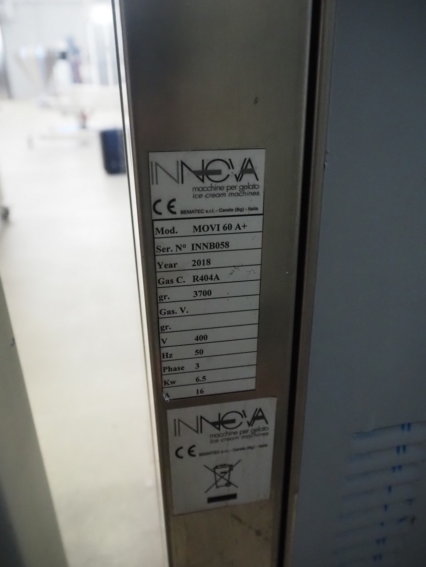 Innova ice cream machine, model: MOVI 60 A+, serial number: INNB058, year of construction: 2018, 400 V, 3 Ph, 50 Hz, 16 A, 6.5 kW, refrigerant: R404a/3700 g, dimensions: 850 mm x 610 mm x 1440 mm.
