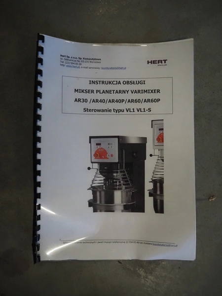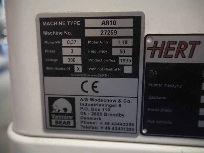 Varimixer Bear mixer, type: AR10, machine number: 27259, year of construction: 1995, 380 V, 3 Ph, 50 Hz, 1.18 A, 0.37 kW, dimensions bowl: Ø 260 mm x 240 mm, total dimensions: 400 mm x 650 mm x 950 mm.
