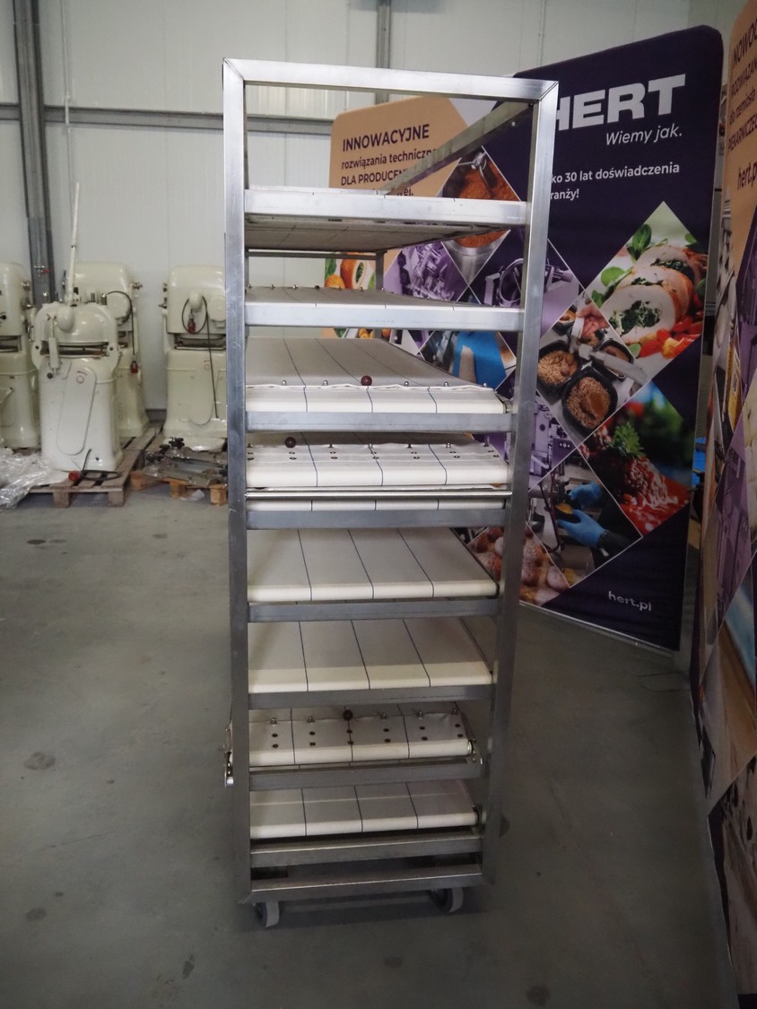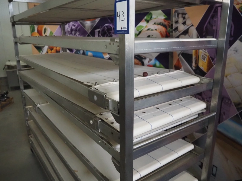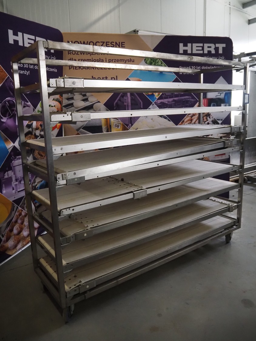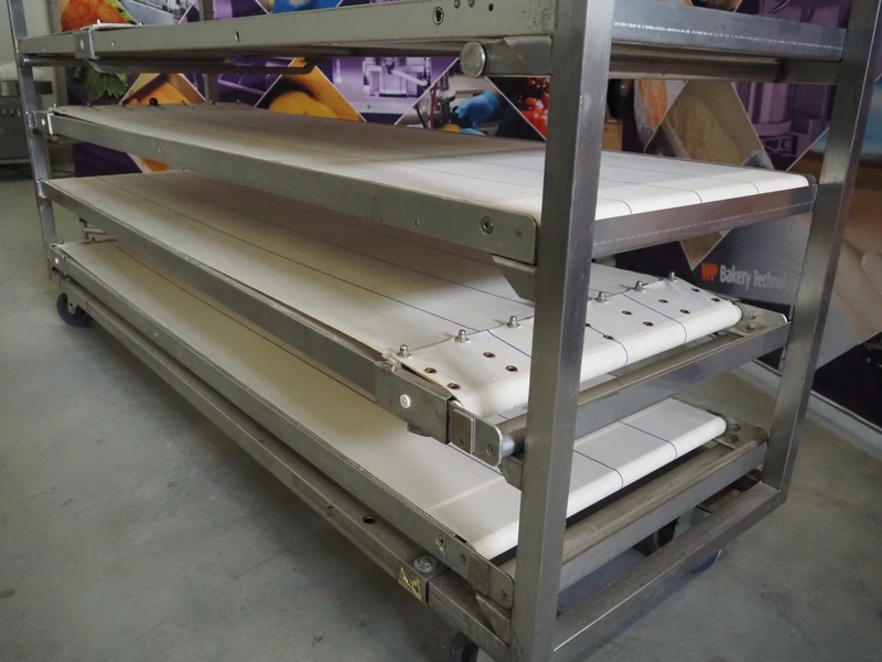 Trolley with 9 oven loading belts, belt width: (9x) 550 mm, dimensions belts: (9x) 550 mm x 1920 mm, total dimensions: 2100 mm x 600 mm x 1900 mm.