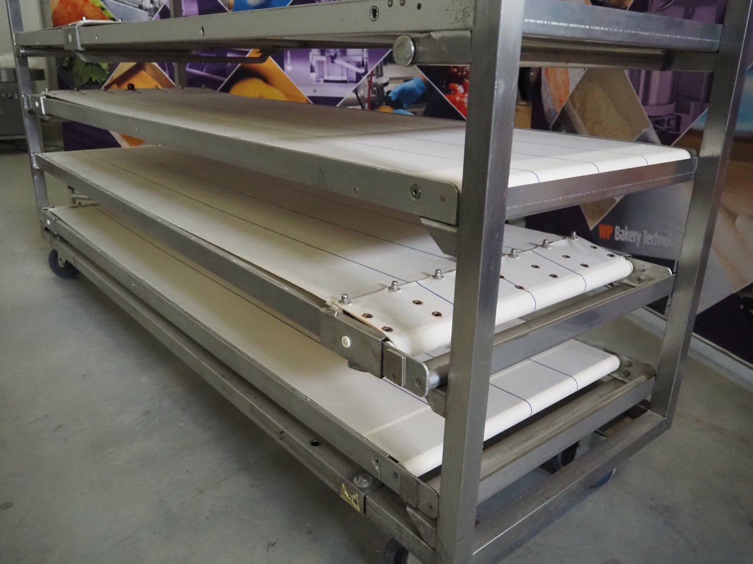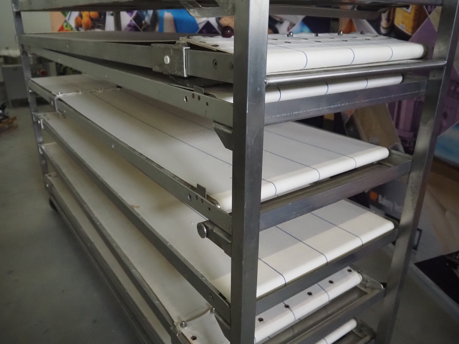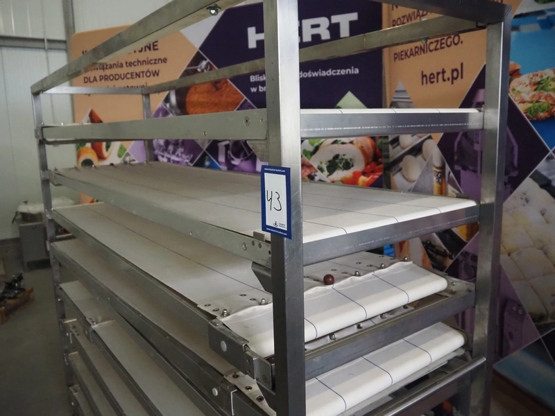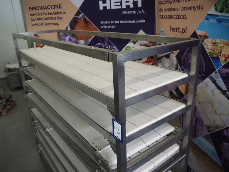 Trolley with 9 oven loading belts, belt width: (9x) 550 mm, dimensions belts: (9x) 550 mm x 1920 mm, total dimensions: 2100 mm x 600 mm x 1900 mm.